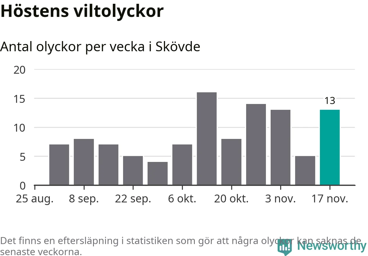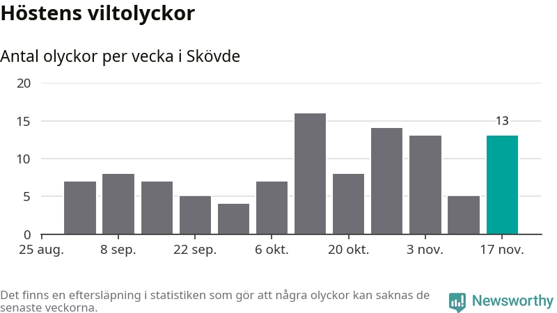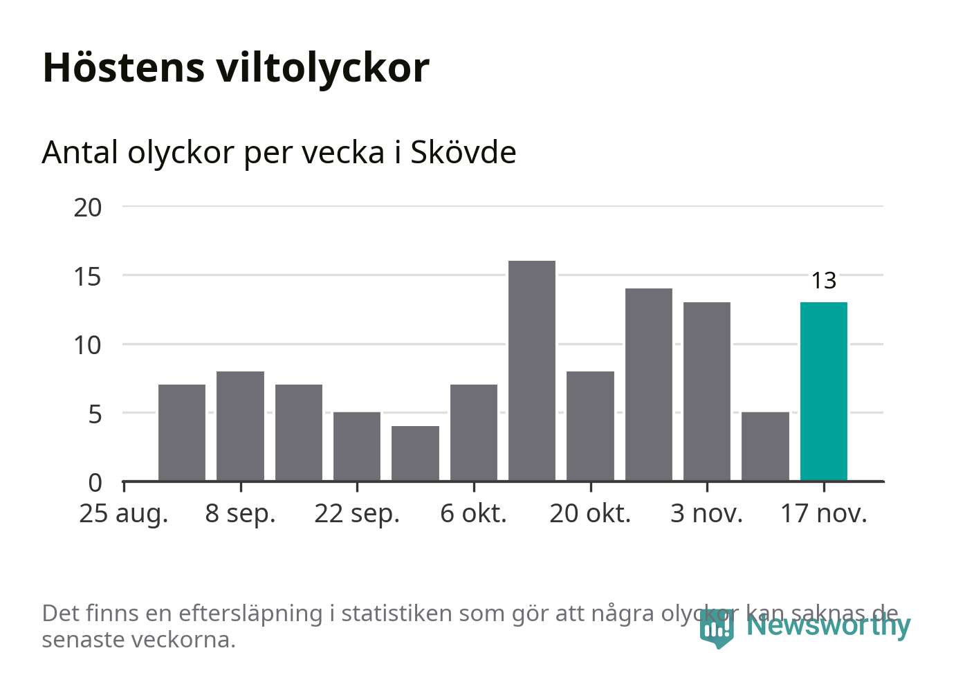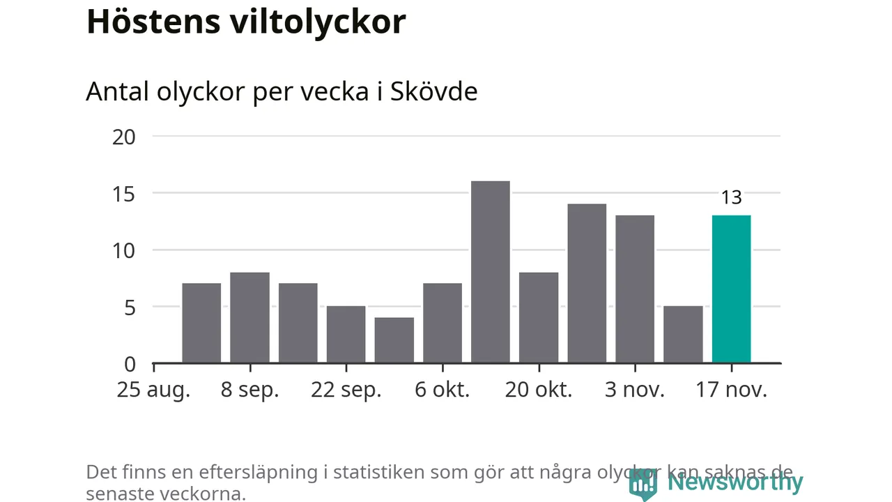Hittills har 13 viltolyckor rapporterats in i Skövde kommun från vecka 47. Se listan här.
