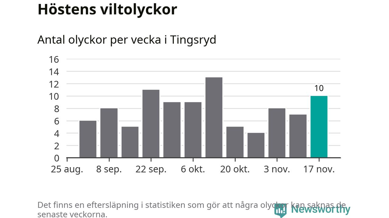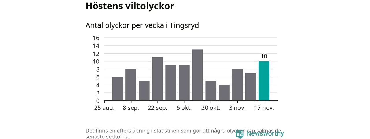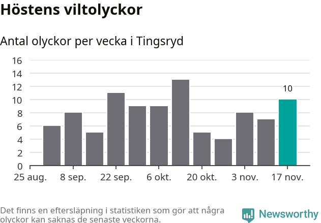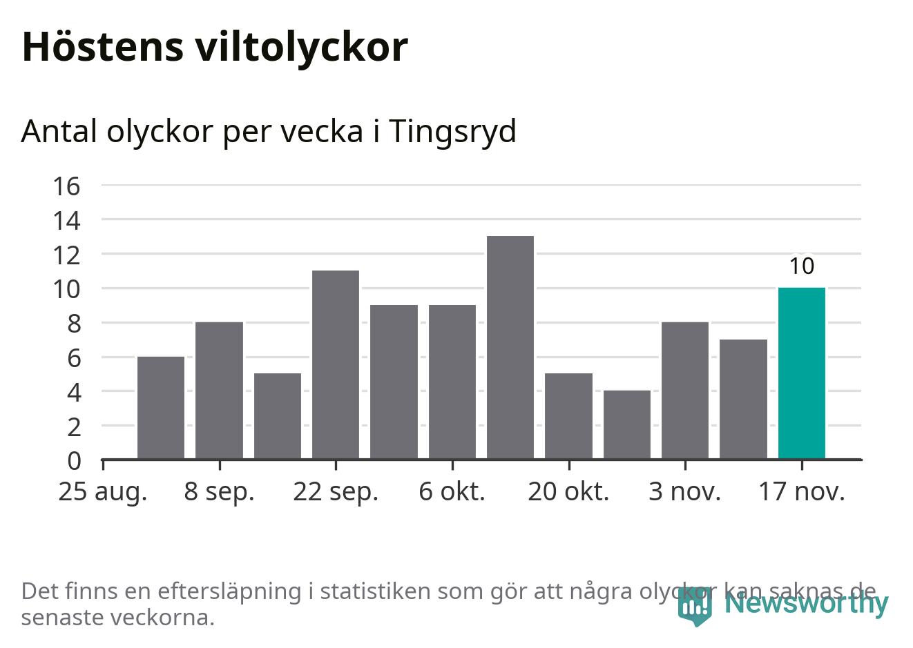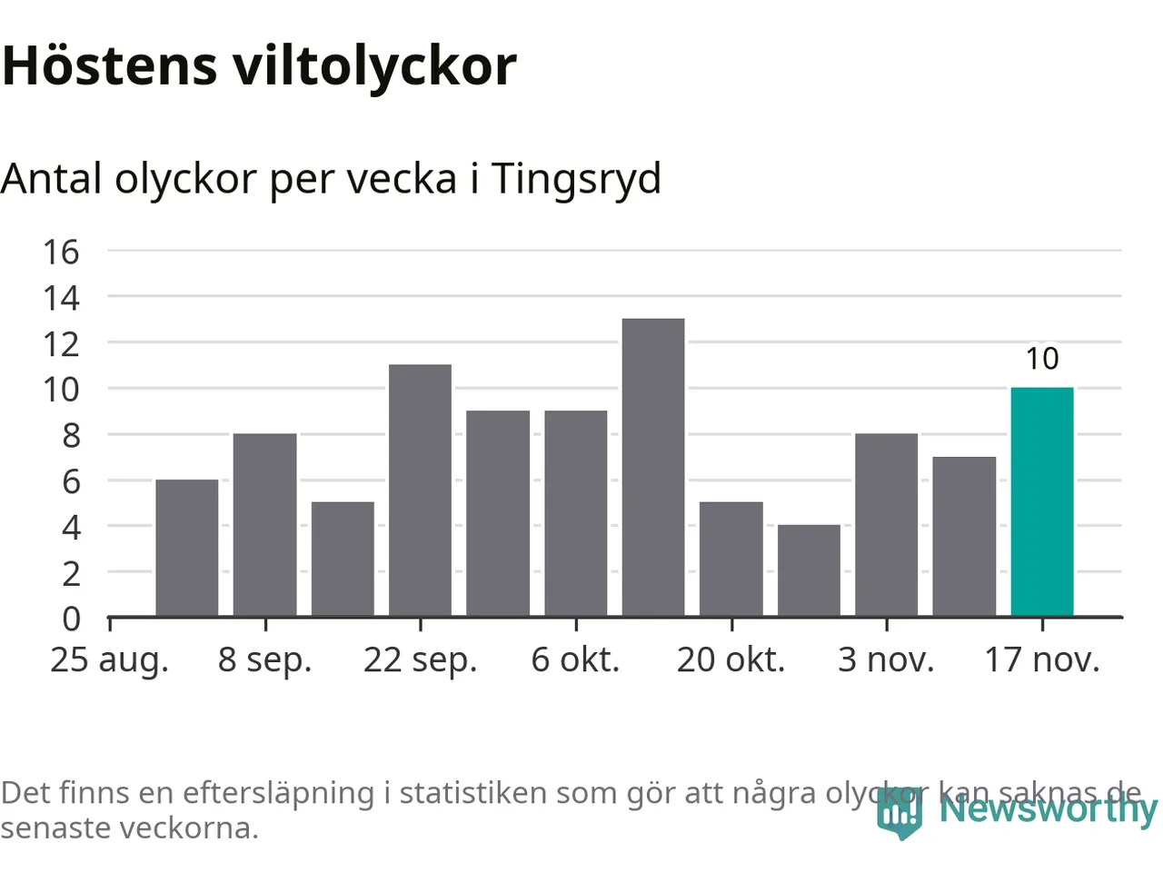 Hittills har tio viltolyckor rapporterats in i Tingsryds kommun från vecka 47. Se listan här.