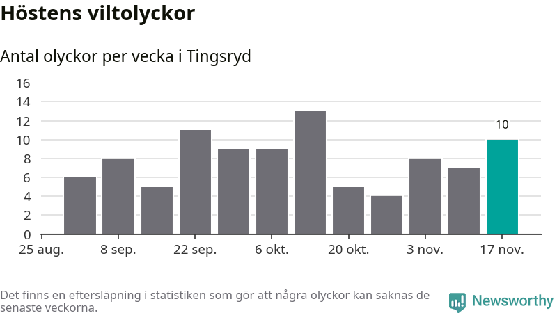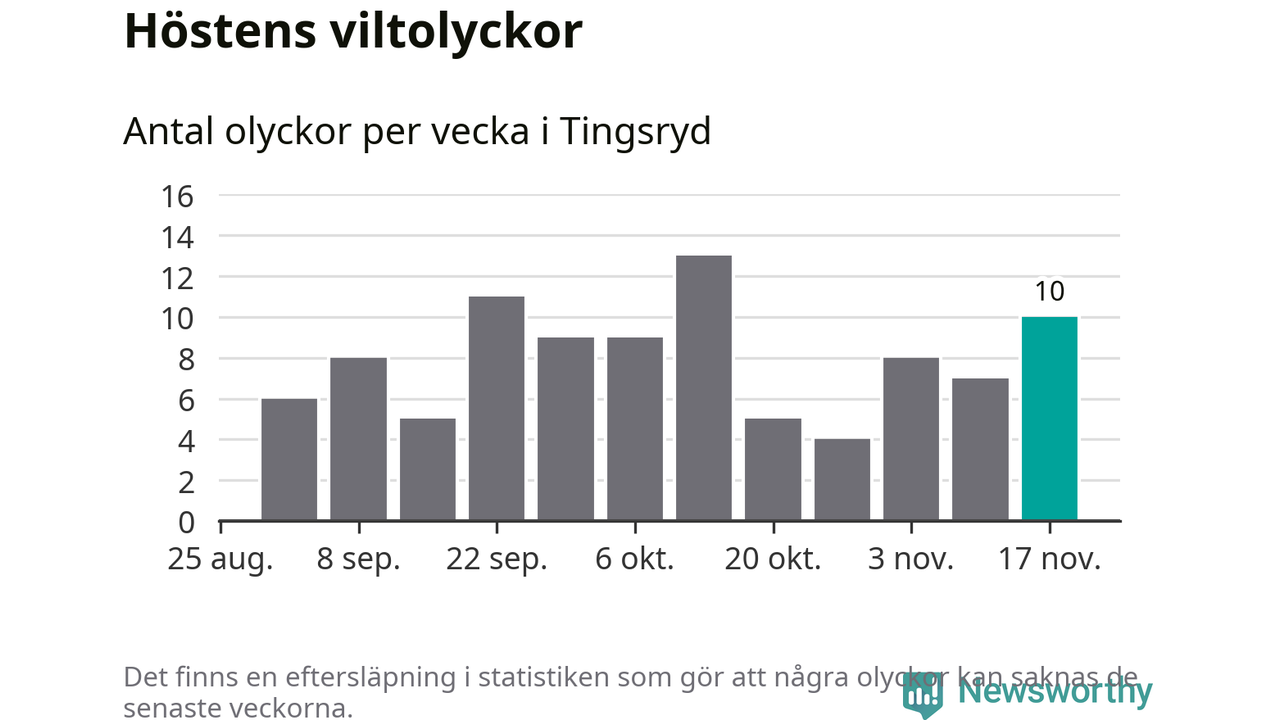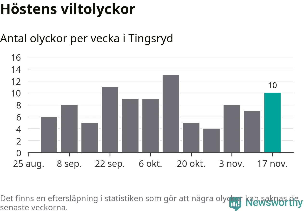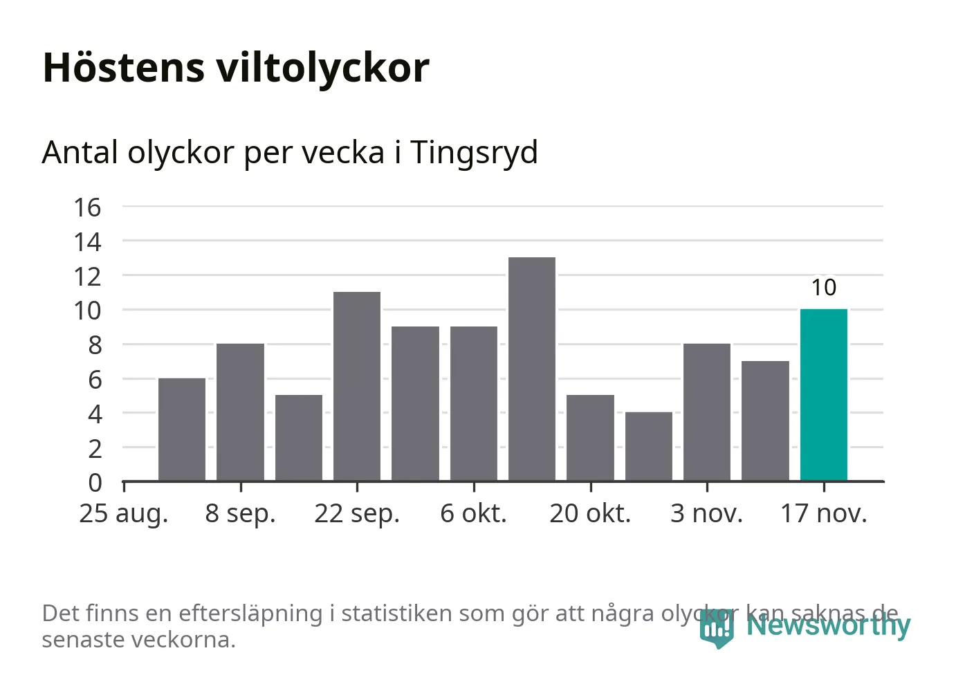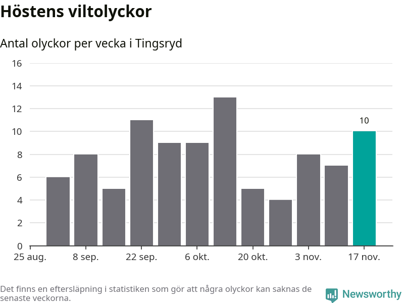 Hittills har tio viltolyckor rapporterats in i Tingsryds kommun från vecka 47. Se listan här.