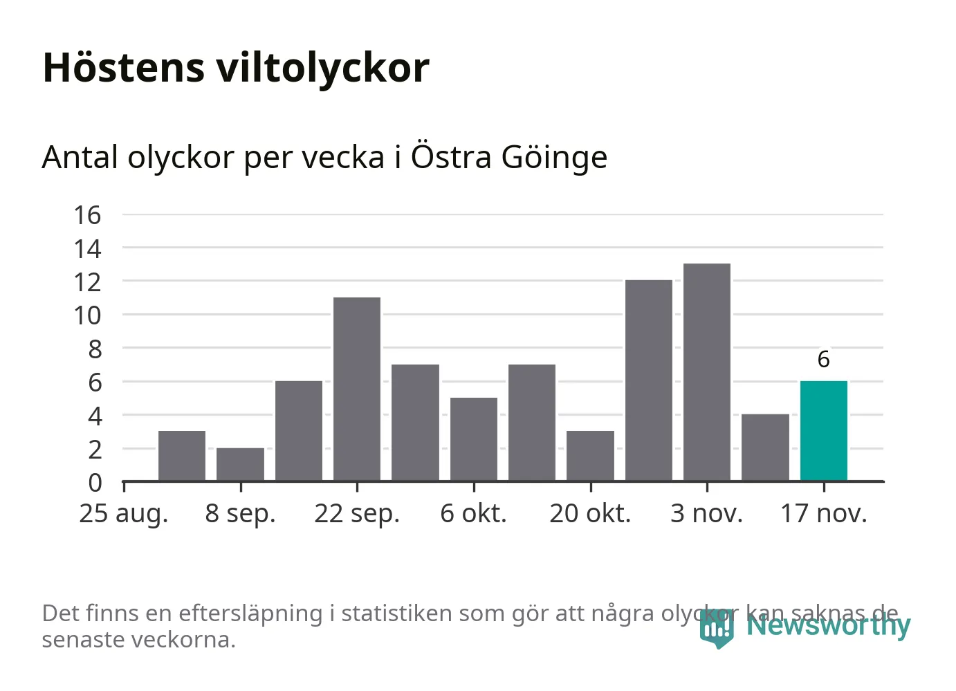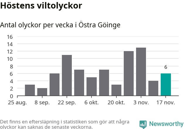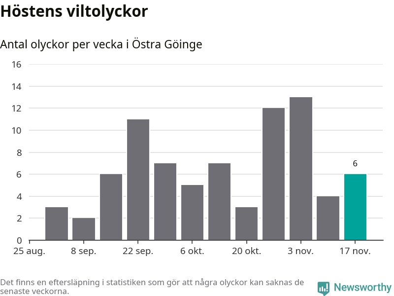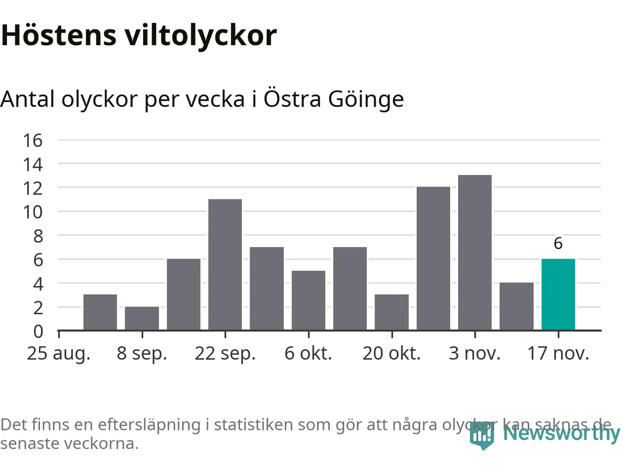 Hittills har sex viltolyckor rapporterats in i Östra Göinge kommun från vecka 47. Se listan här.