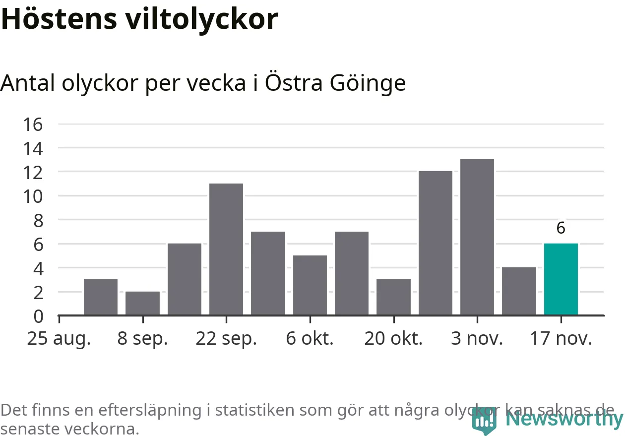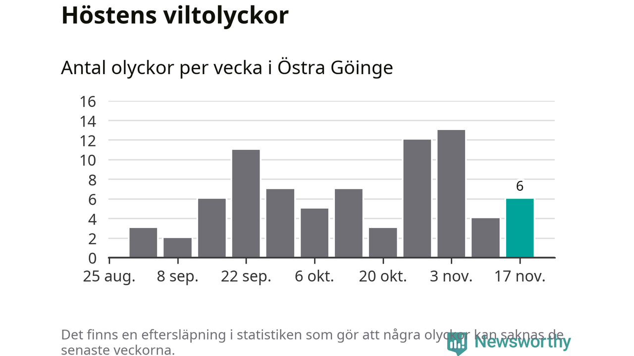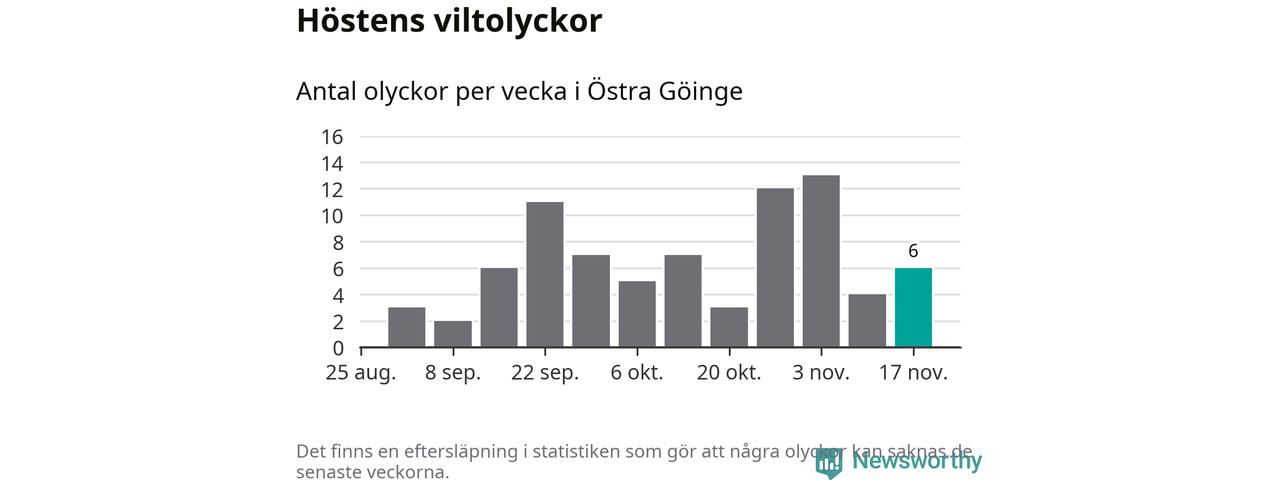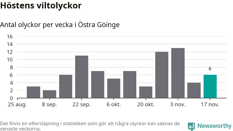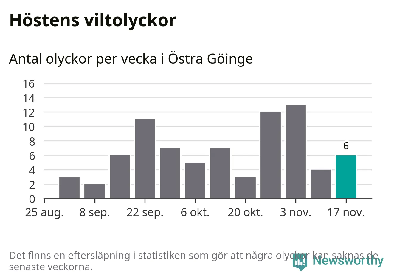 Hittills har sex viltolyckor rapporterats in i Östra Göinge kommun från vecka 47. Se listan här.