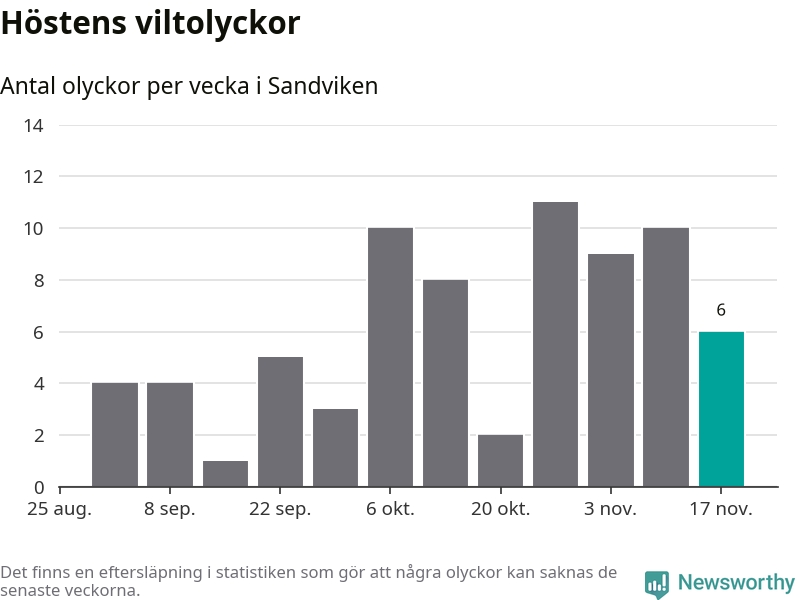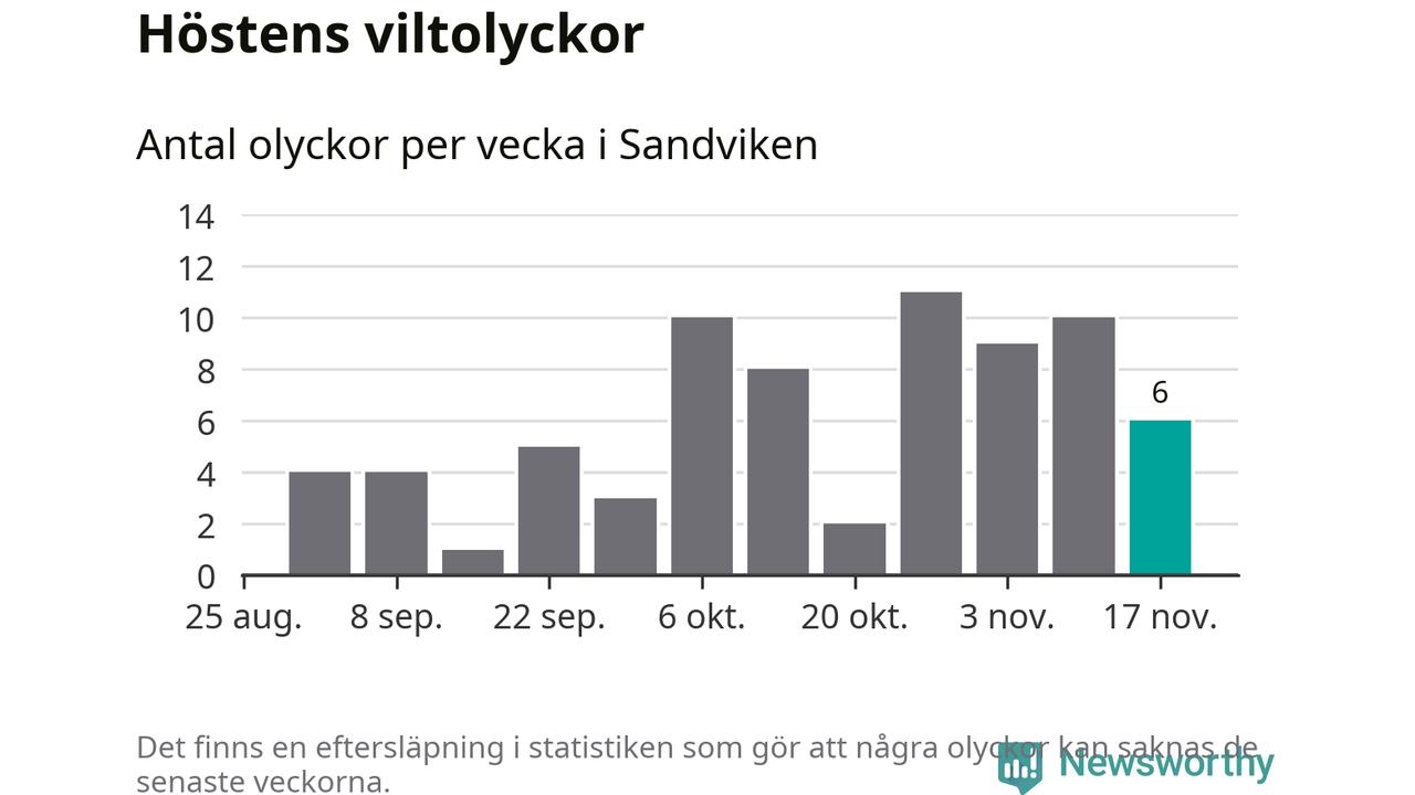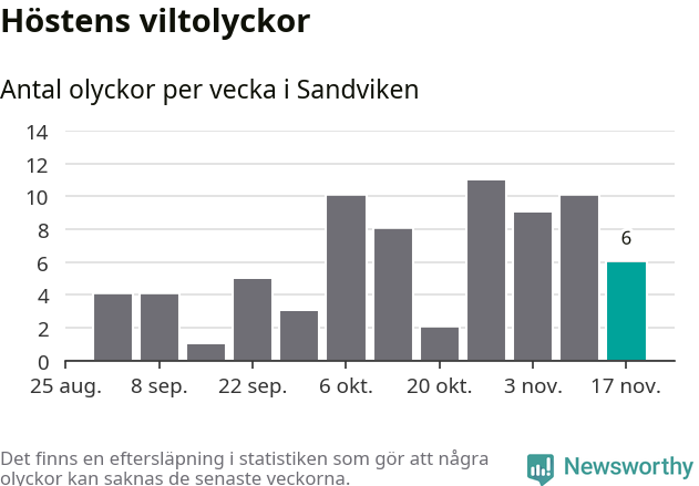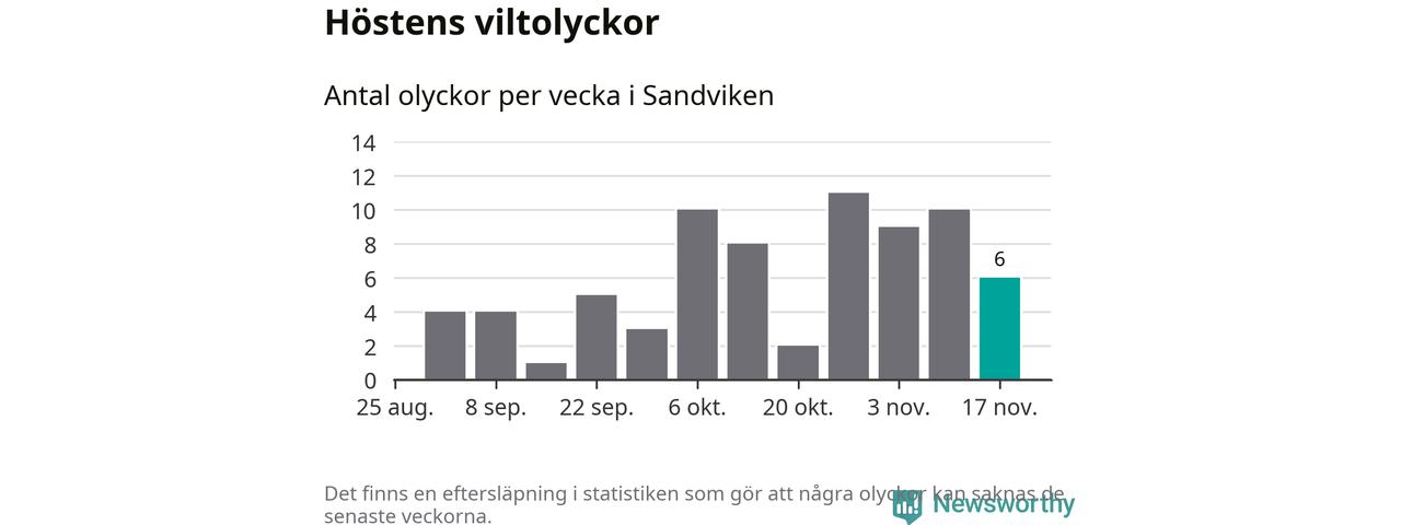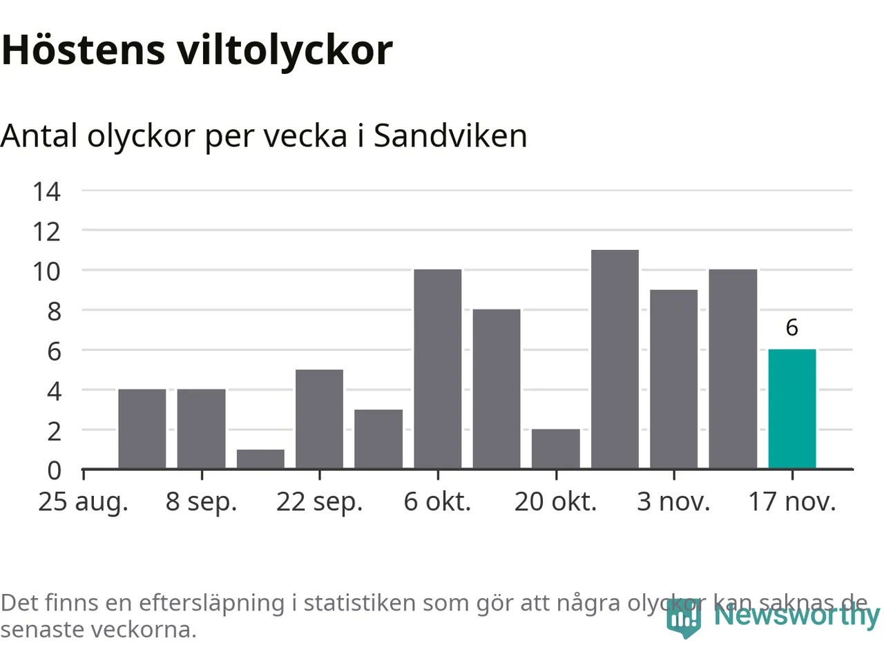 Hittills har sex viltolyckor rapporterats in i Sandvikens kommun från vecka 47. Se listan här.
