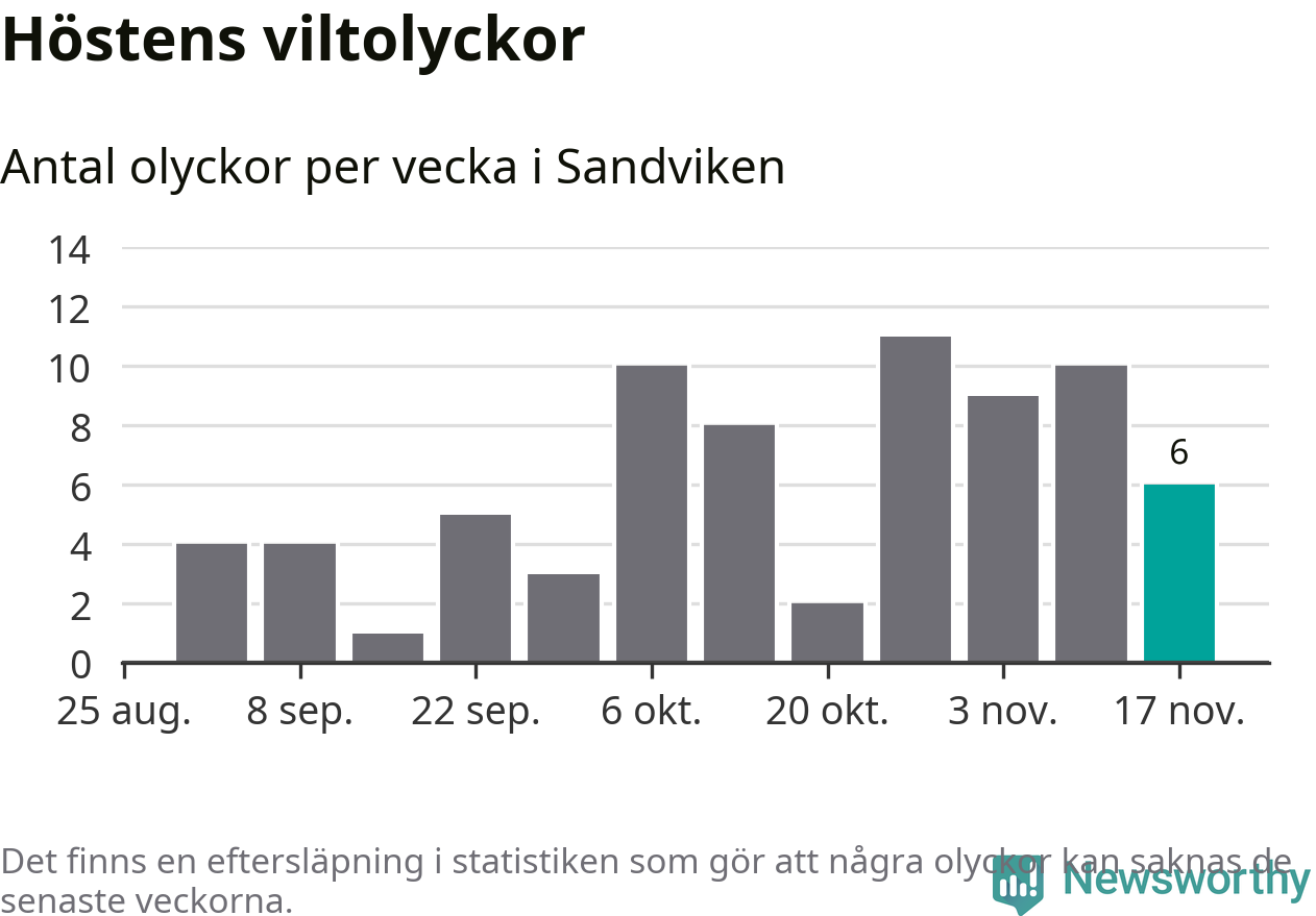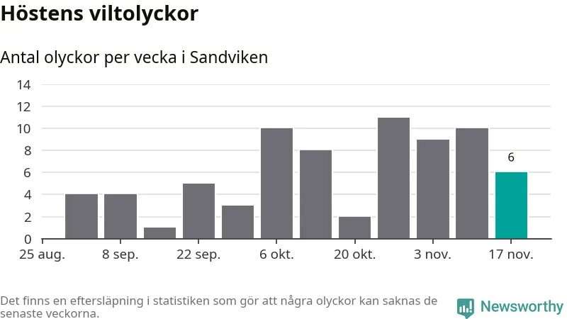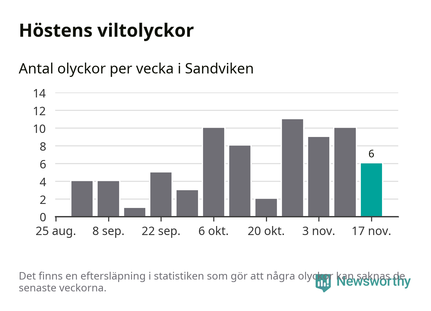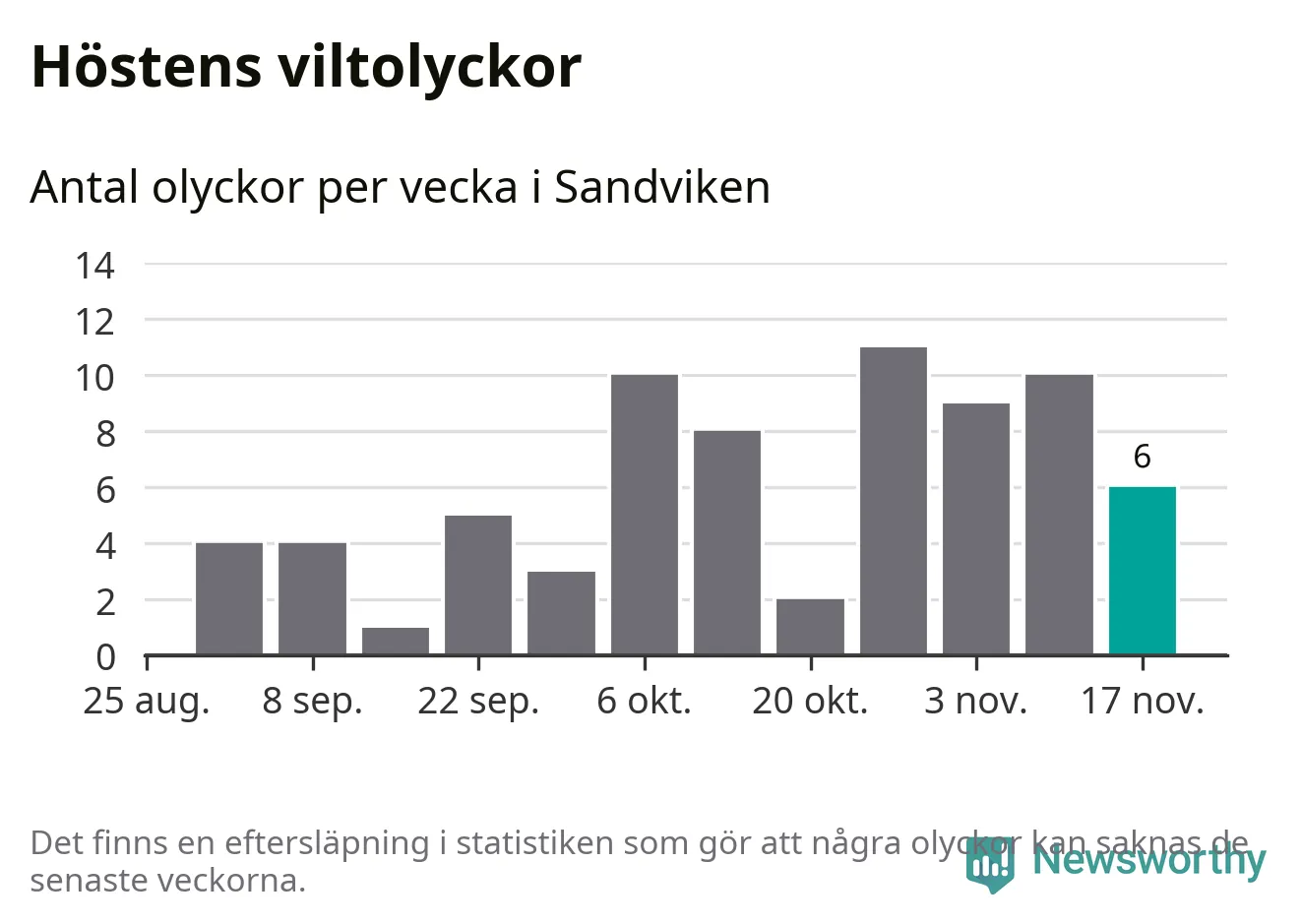 Hittills har sex viltolyckor rapporterats in i Sandvikens kommun från vecka 47. Se listan här.