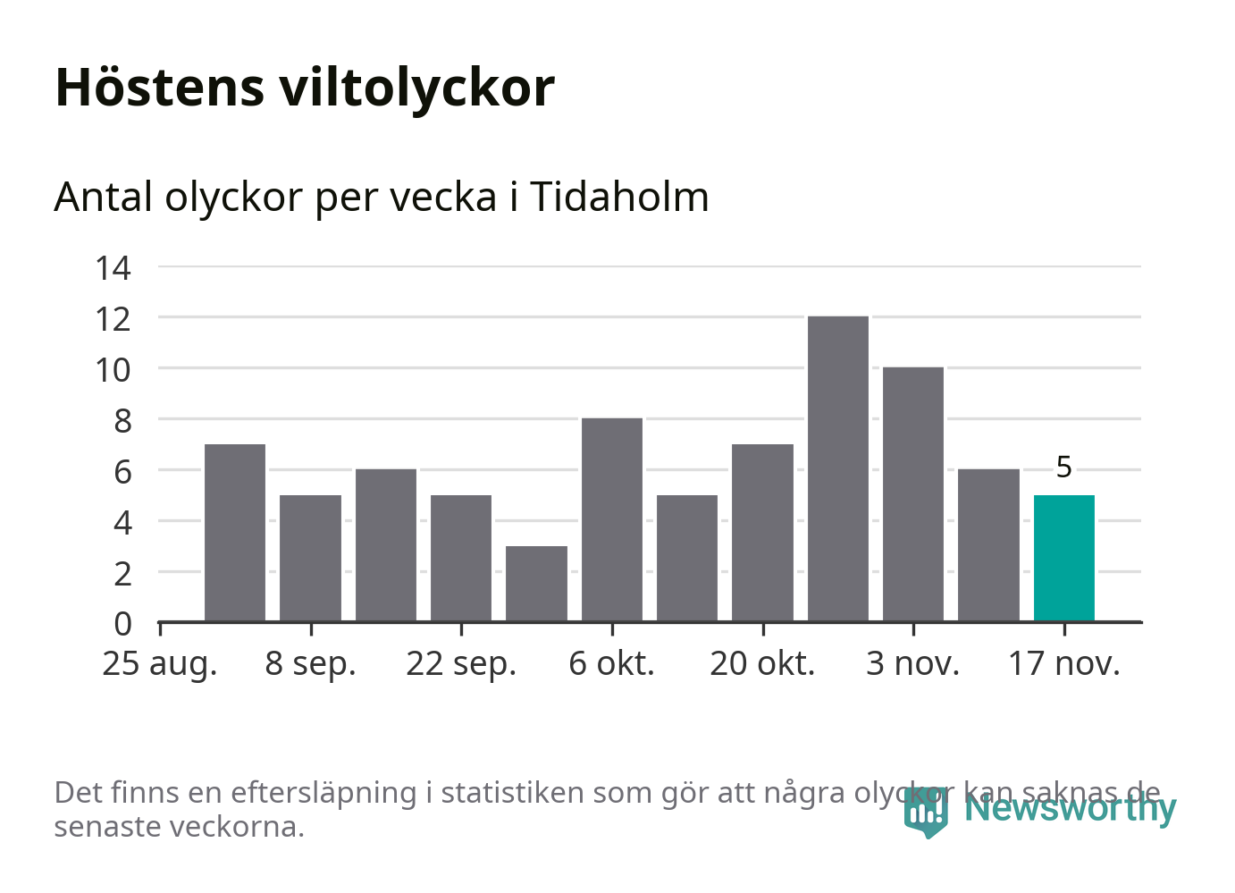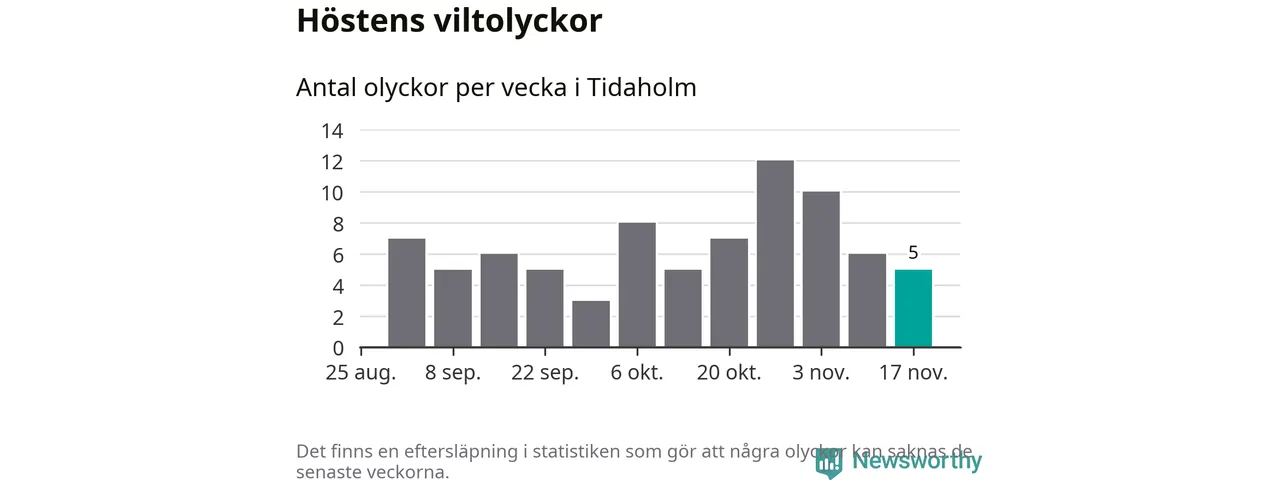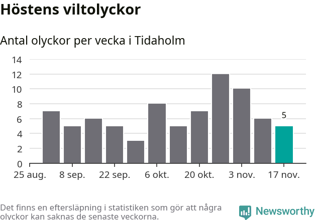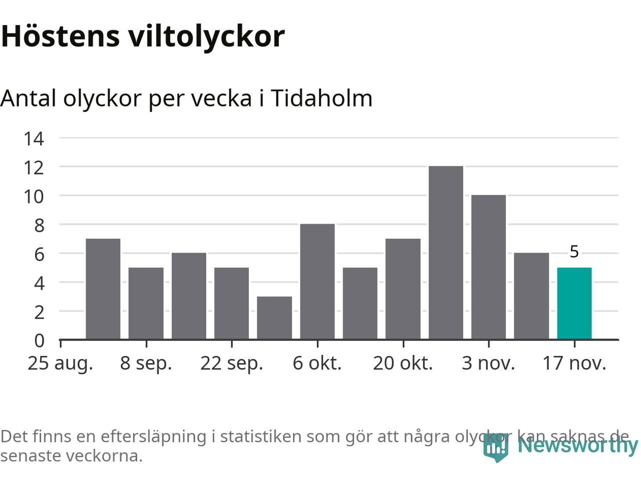 Hittills har fem viltolyckor rapporterats in i Tidaholms kommun från vecka 47. Se listan här.