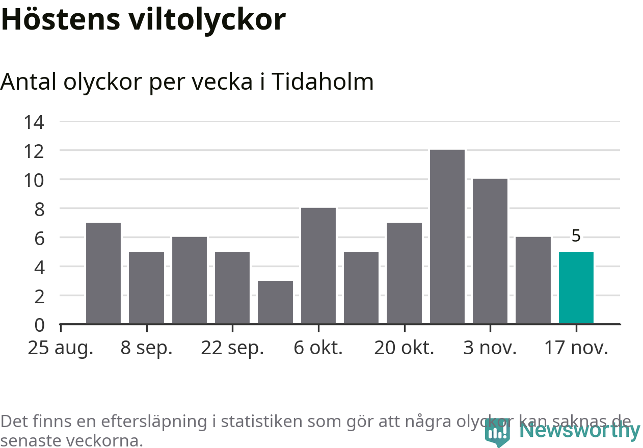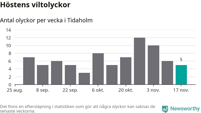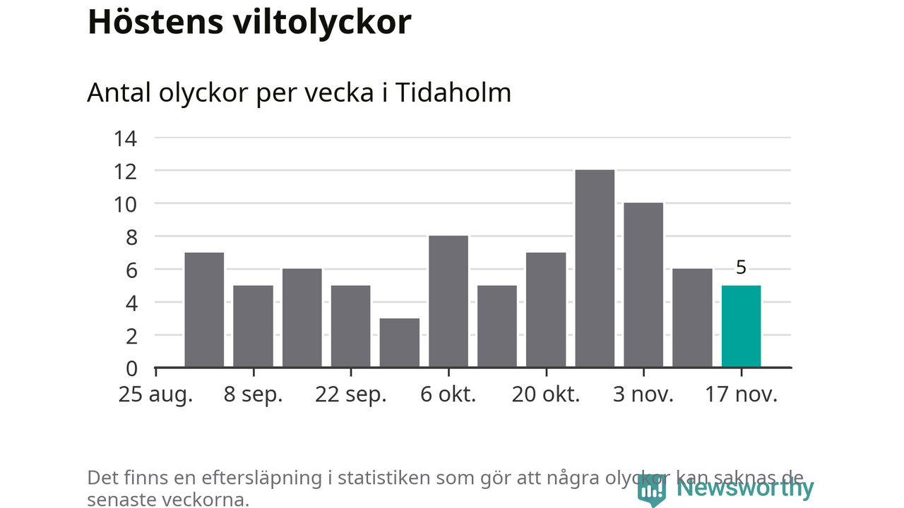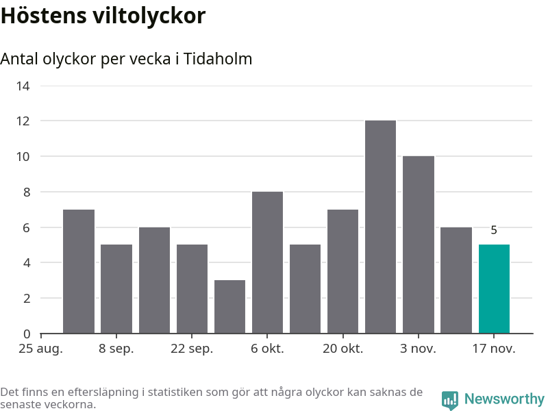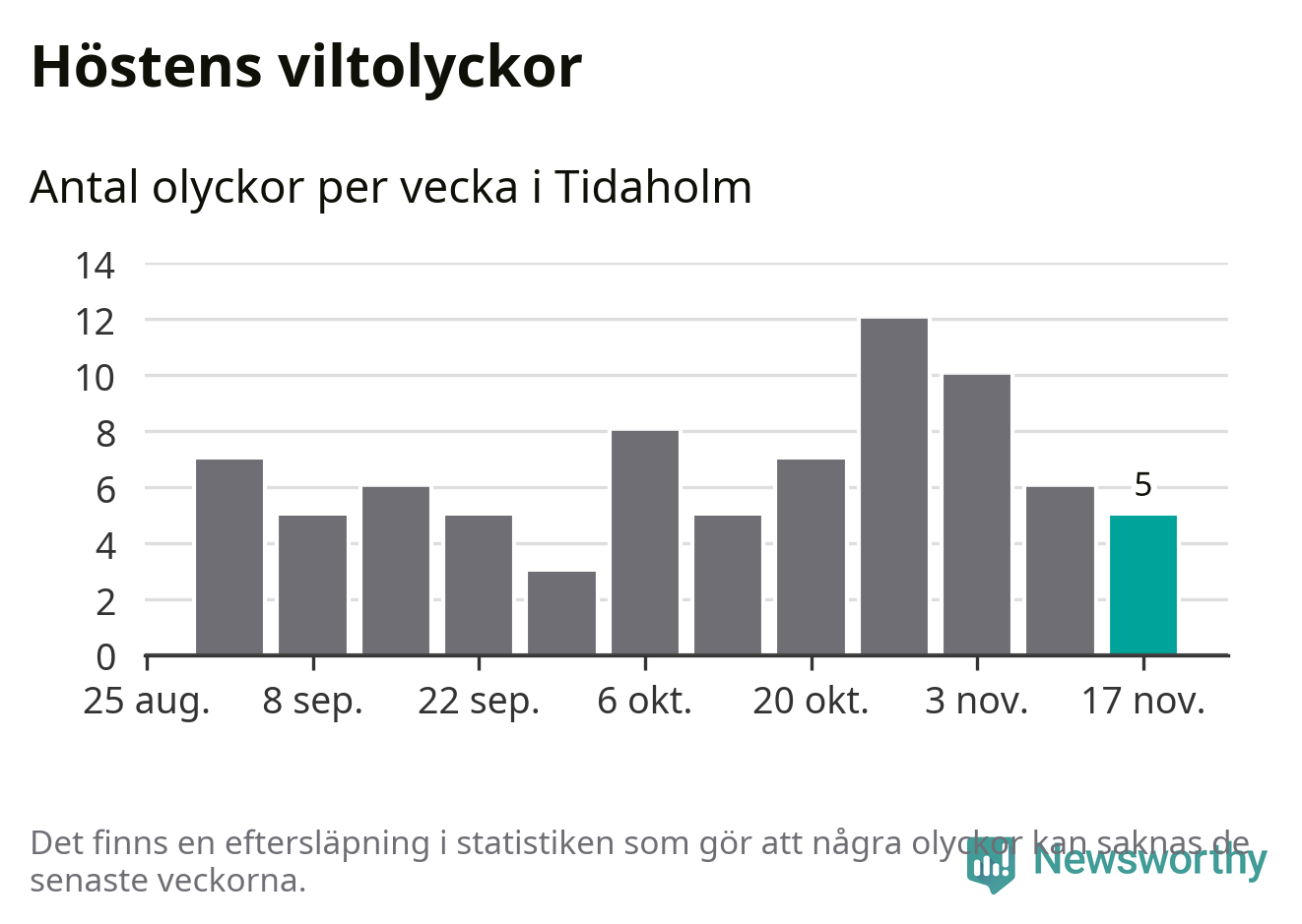 Hittills har fem viltolyckor rapporterats in i Tidaholms kommun från vecka 47. Se listan här.