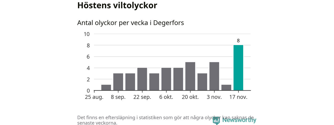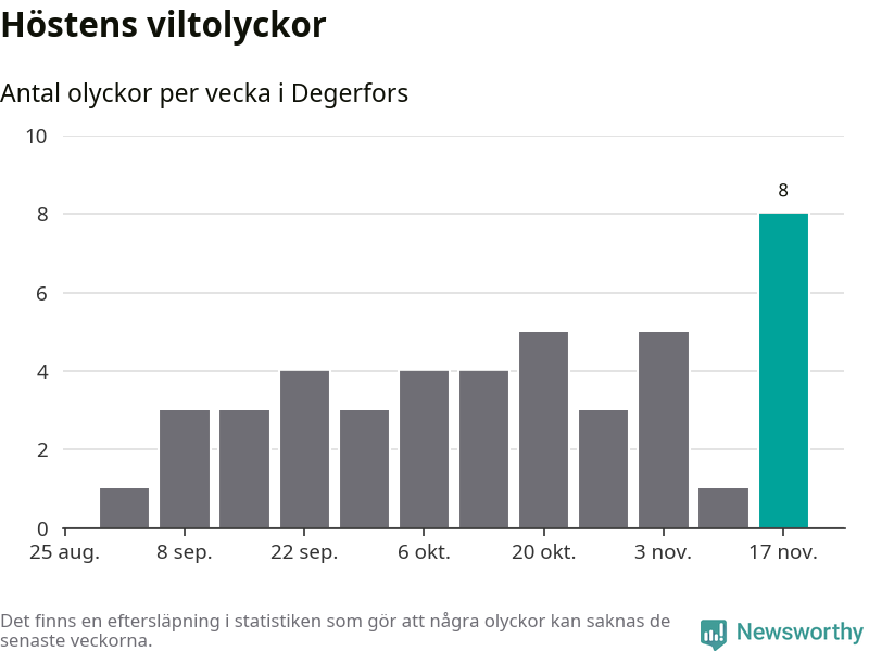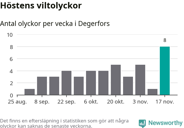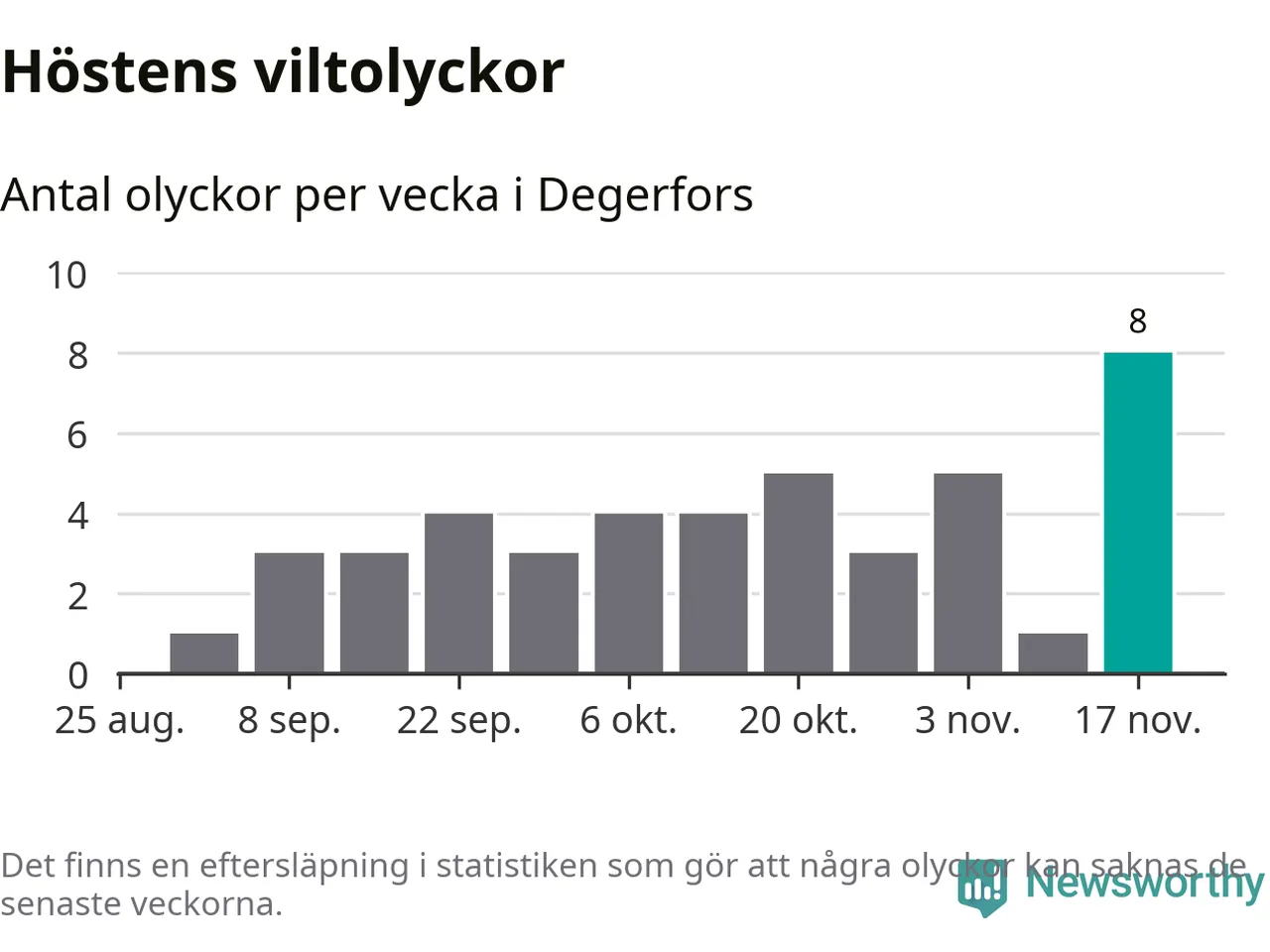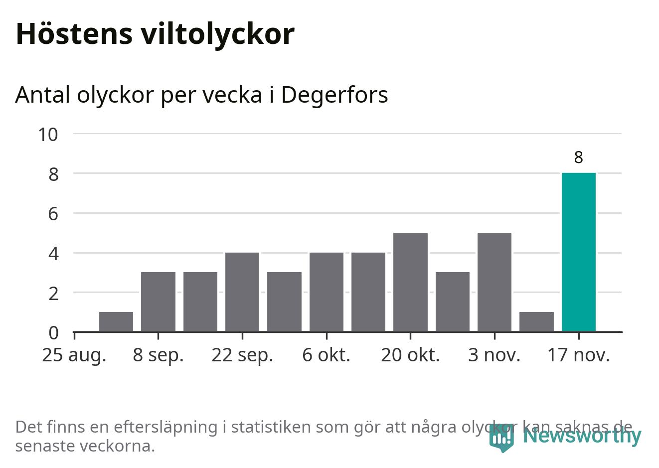 Förra veckan var en av fyra sedan 2015 som det har inträffat så många som åtta viltolyckor i Degerfors kommun (tidigare har det skett i oktober 2021, september 2023 och november 2024).