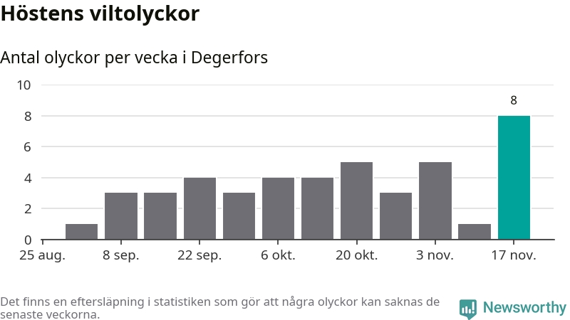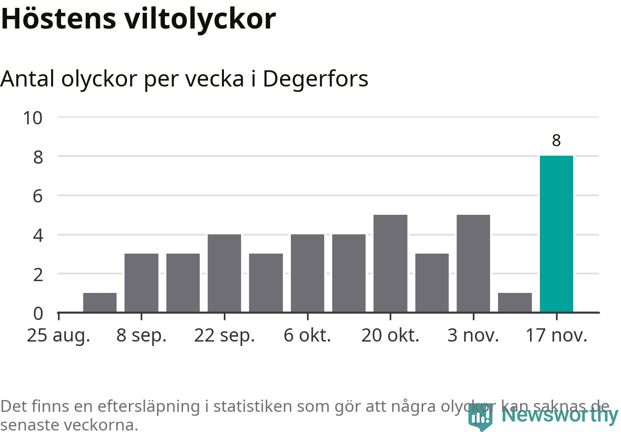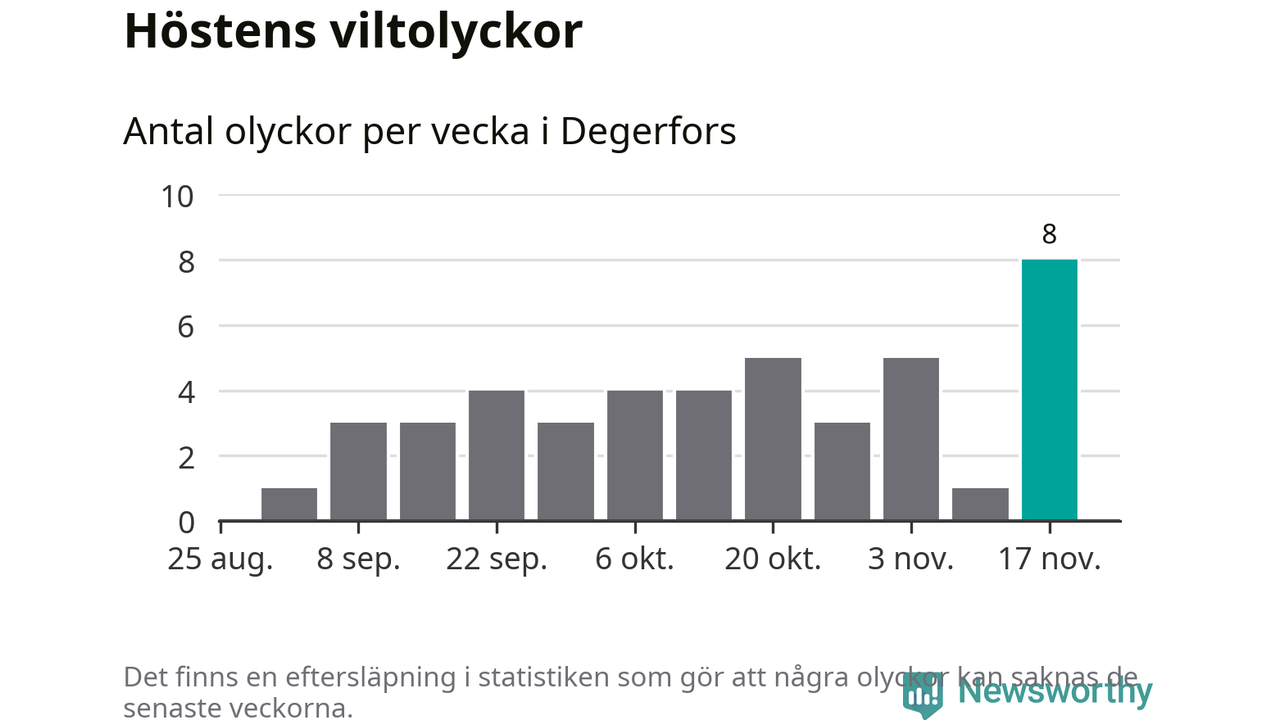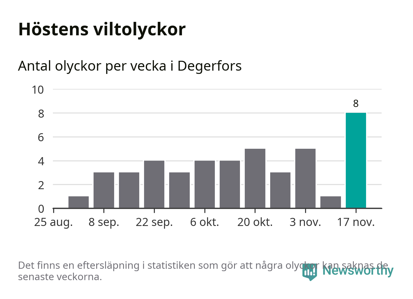 Förra veckan var en av fyra sedan 2015 som det har inträffat så många som åtta viltolyckor i Degerfors kommun (tidigare har det skett i oktober 2021, september 2023 och november 2024).