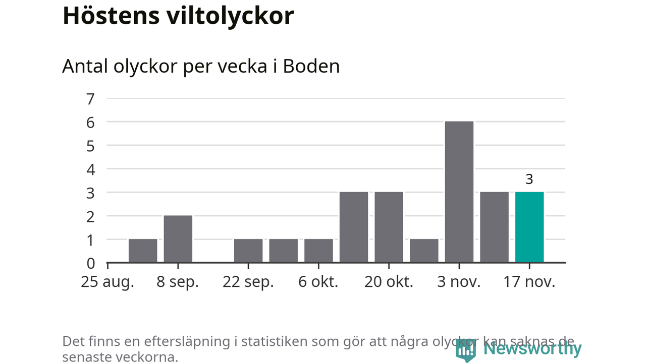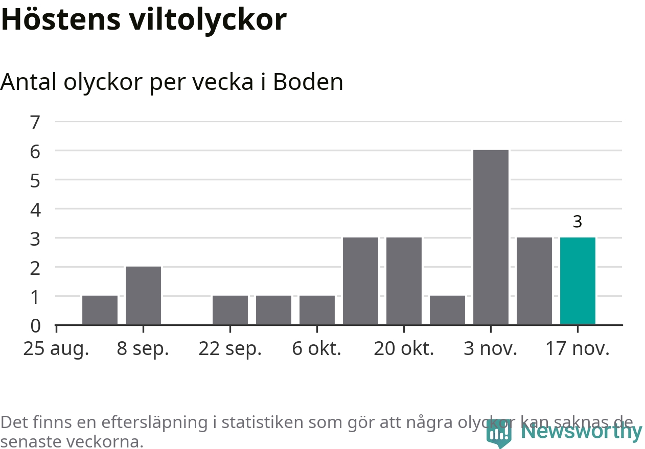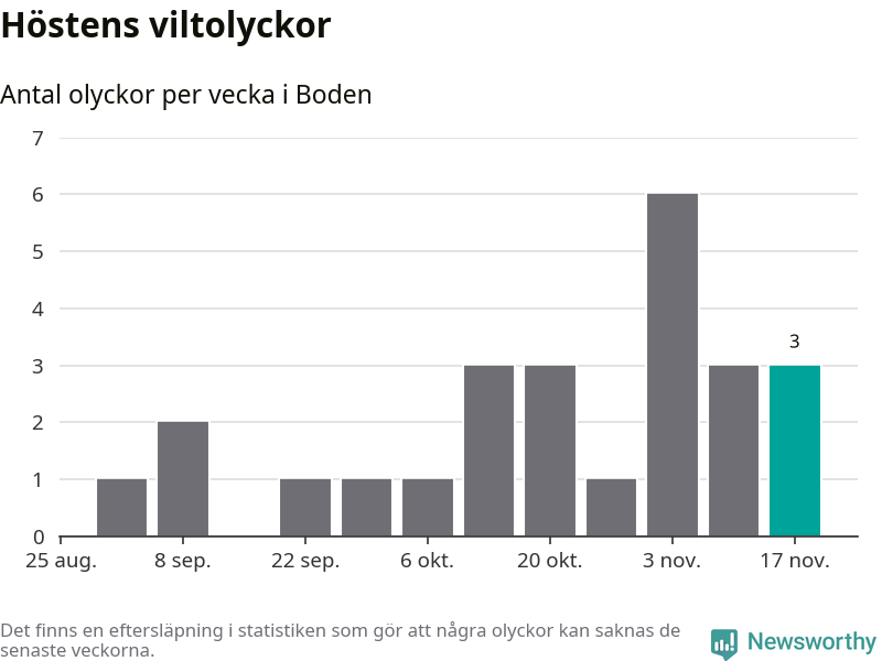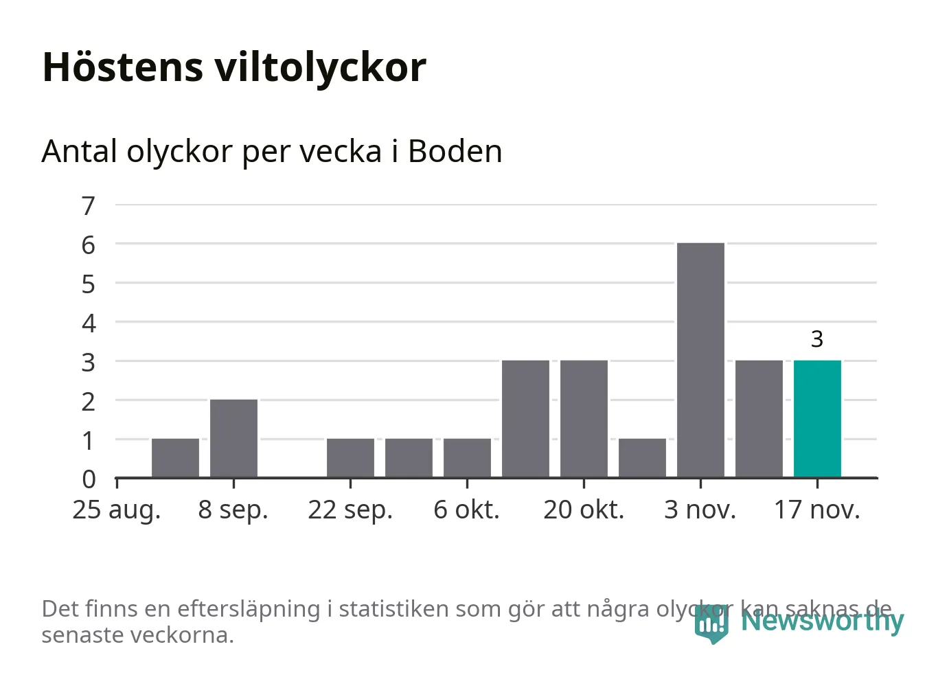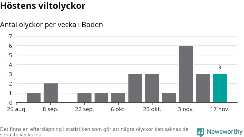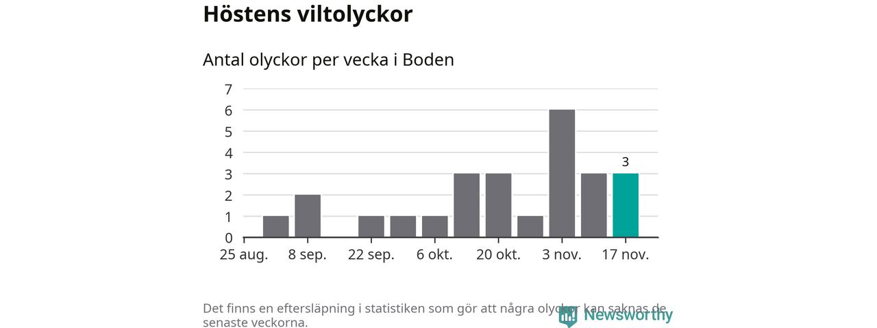 Hittills har tre viltolyckor rapporterats in i Bodens kommun från vecka 47. Se listan här.