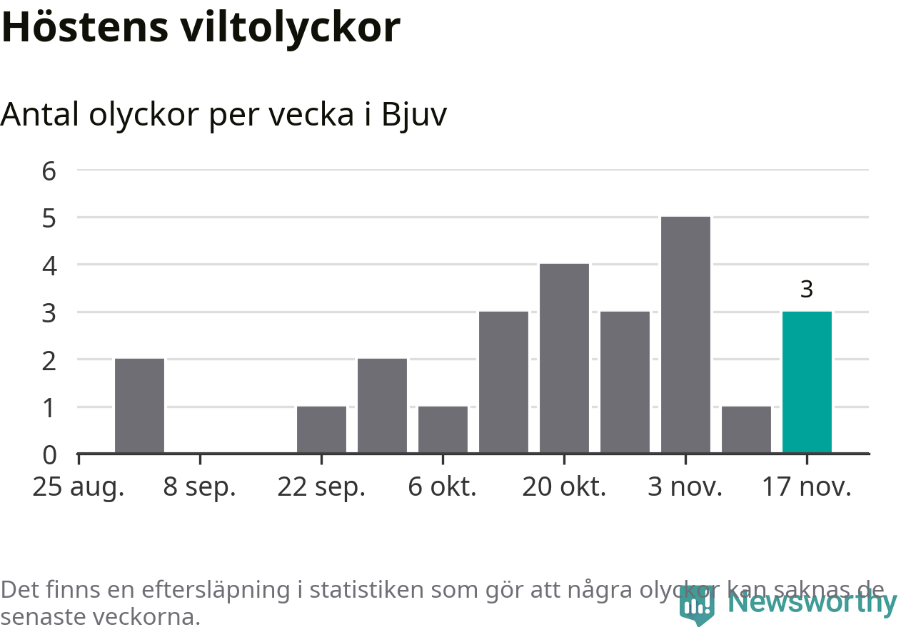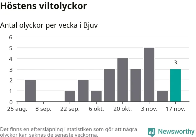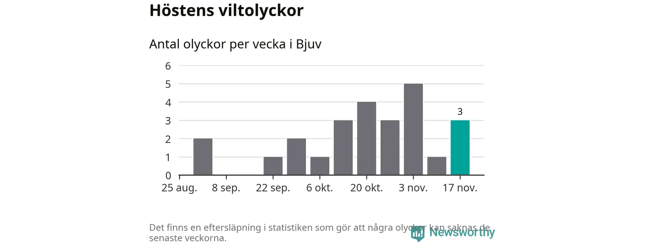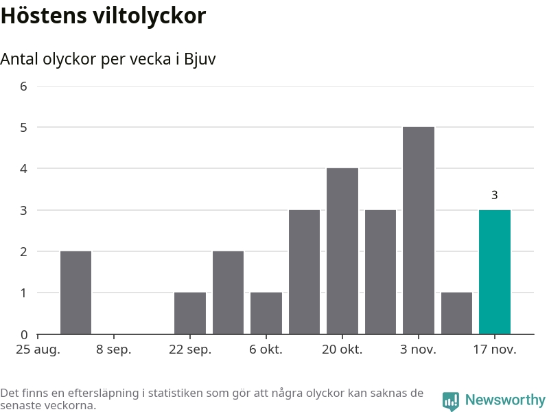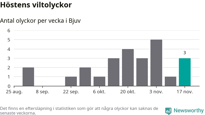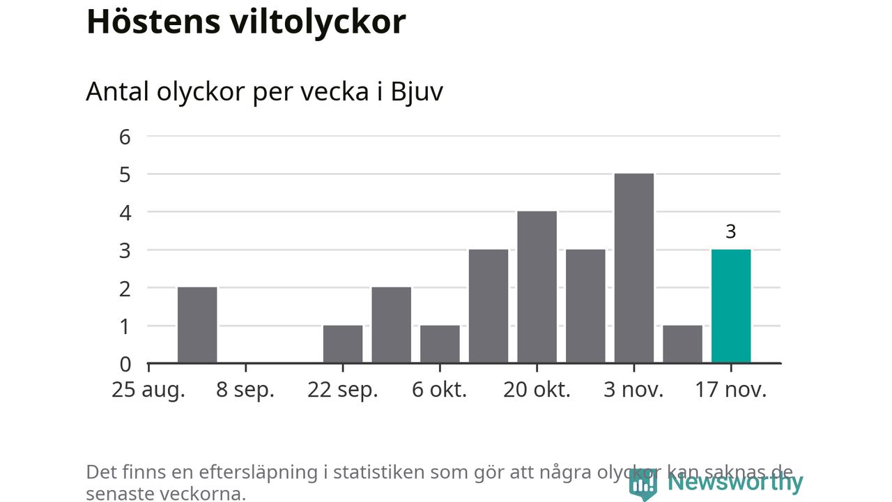 Hittills har tre viltolyckor rapporterats in i Bjuvs kommun från vecka 47. Se listan här.