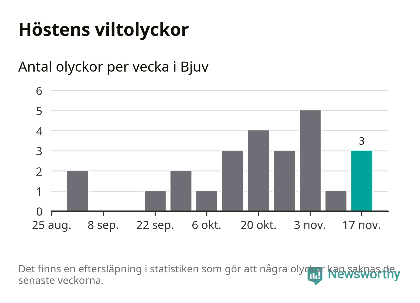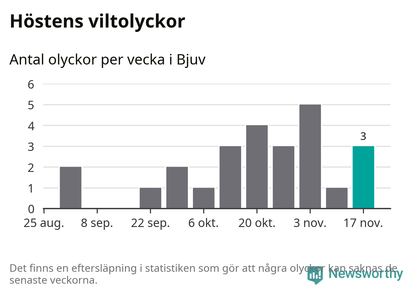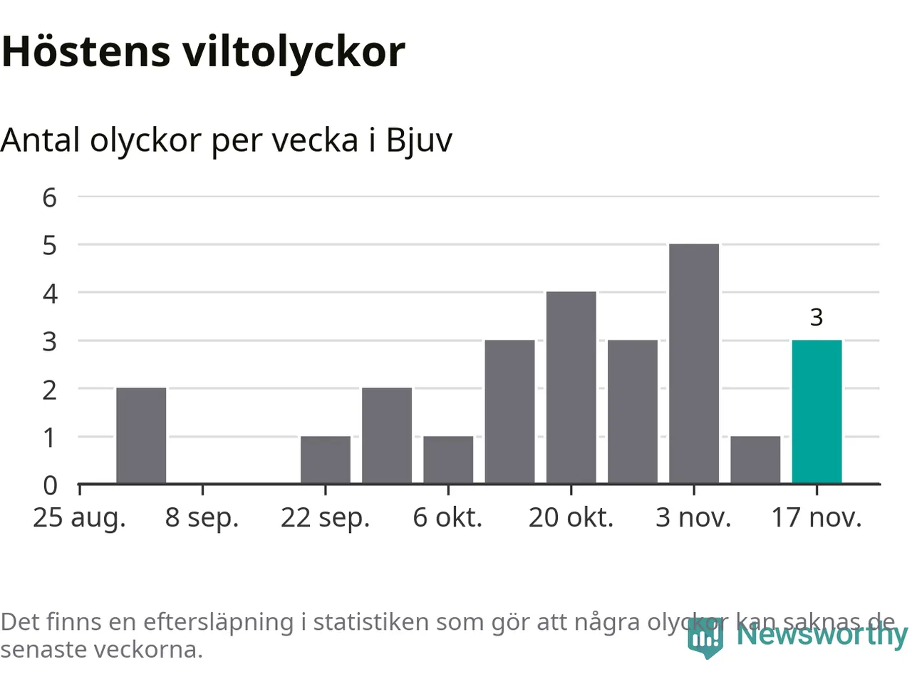 Hittills har tre viltolyckor rapporterats in i Bjuvs kommun från vecka 47. Se listan här.