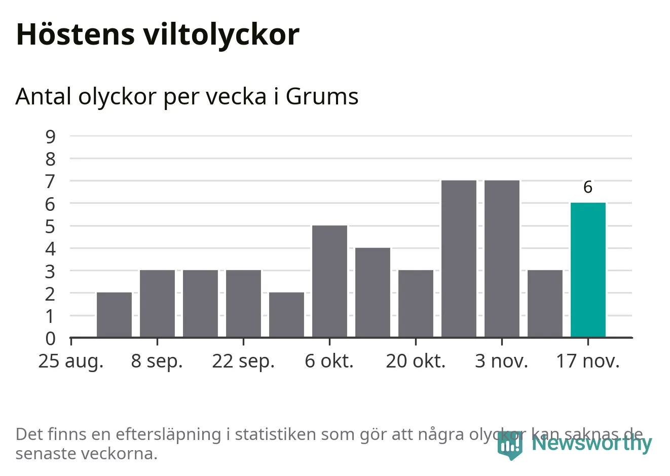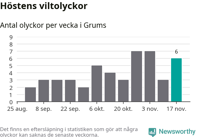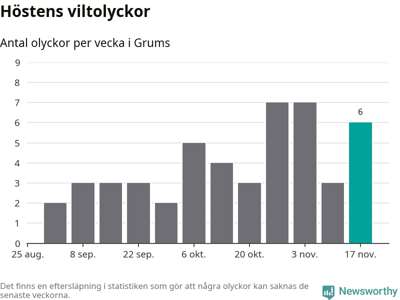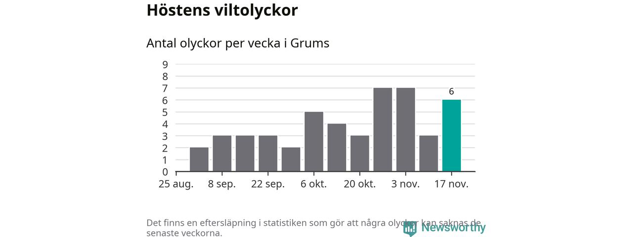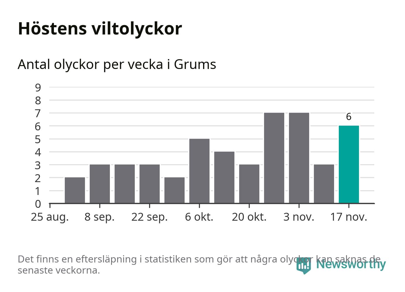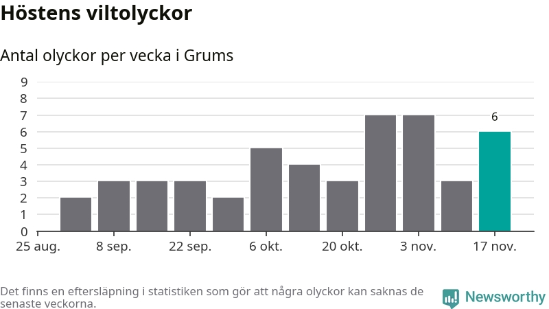 Hittills har sex viltolyckor rapporterats in i Grums kommun från vecka 47. Se listan här.