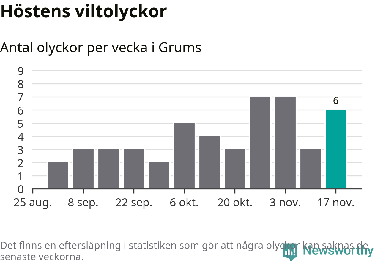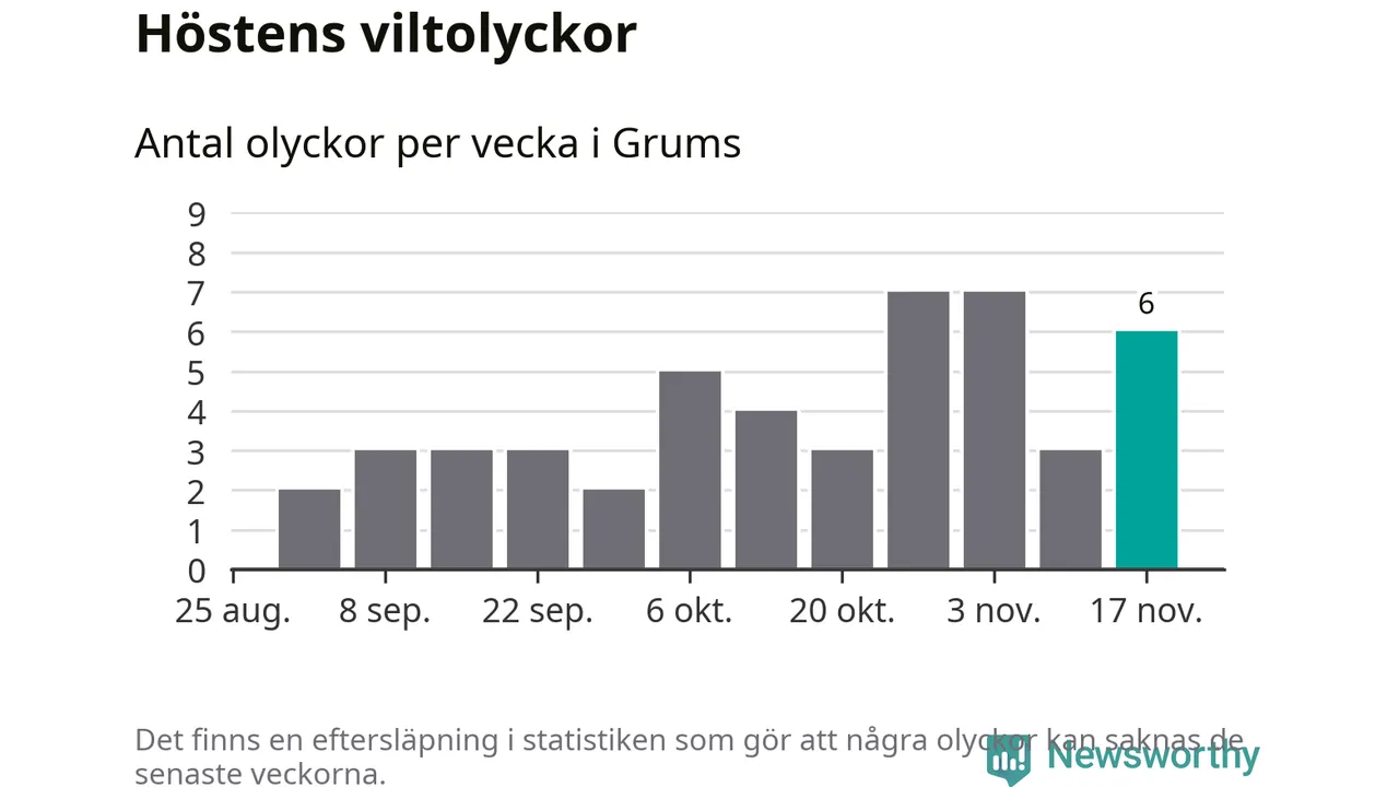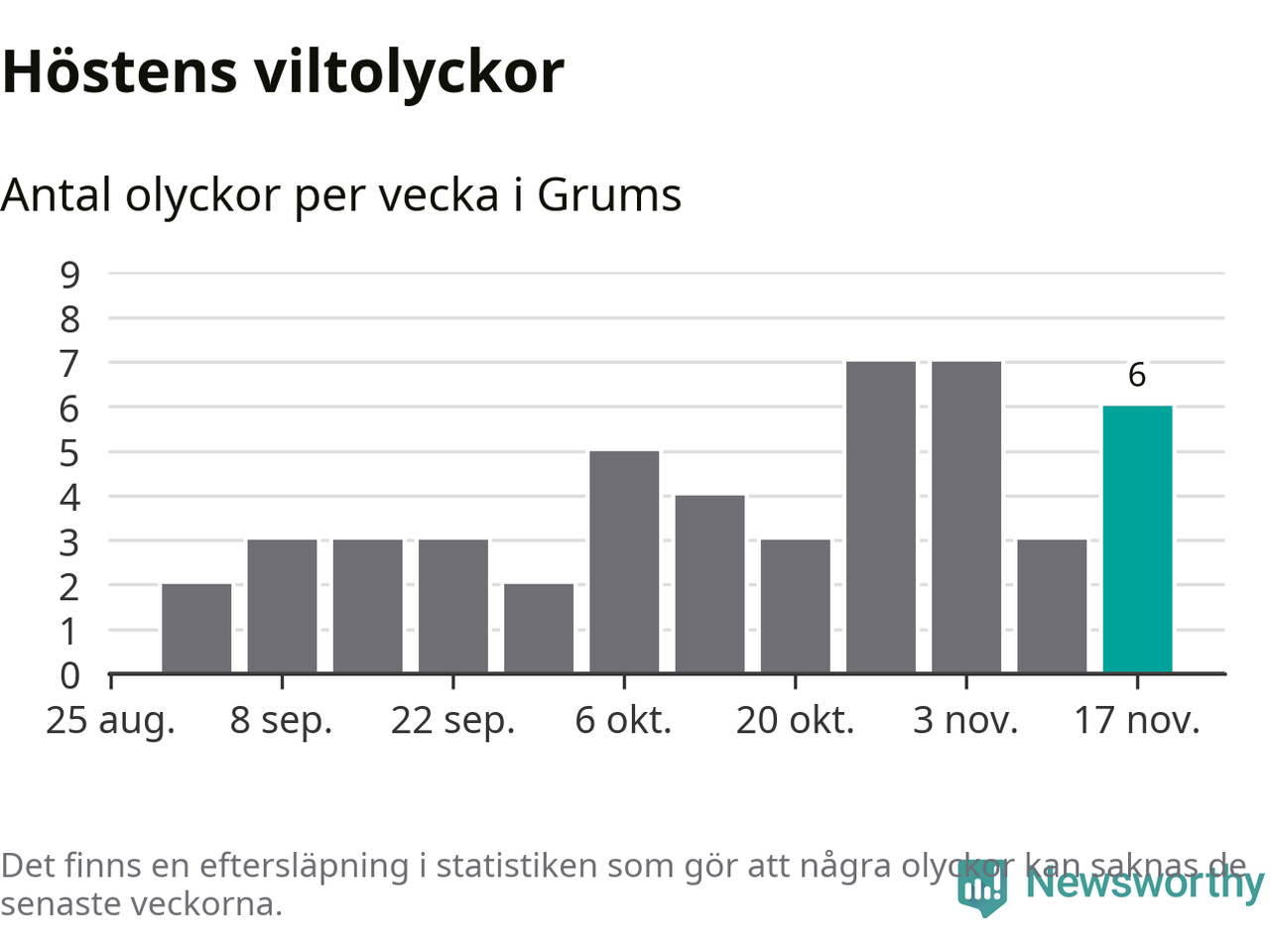 Hittills har sex viltolyckor rapporterats in i Grums kommun från vecka 47. Se listan här.