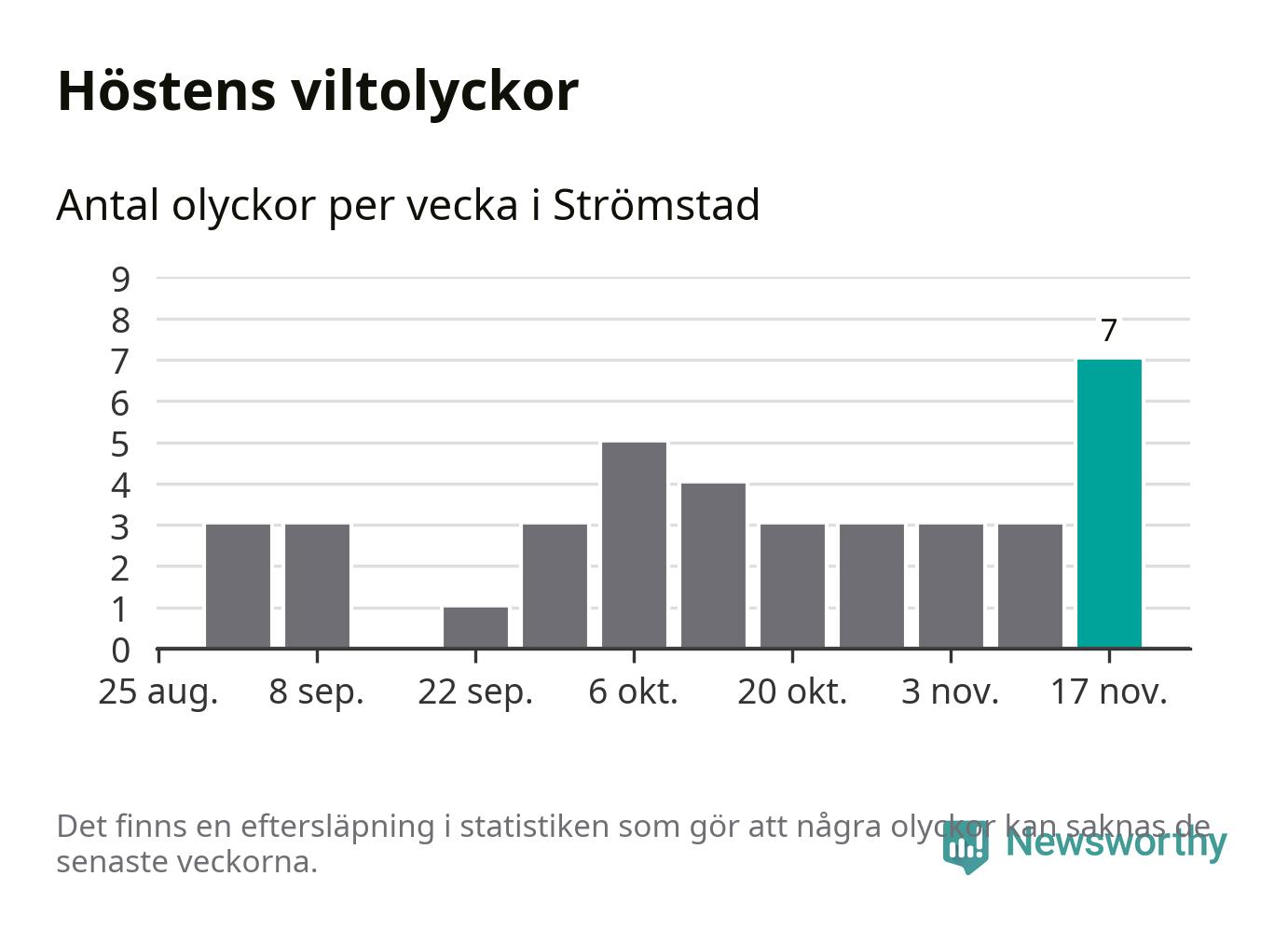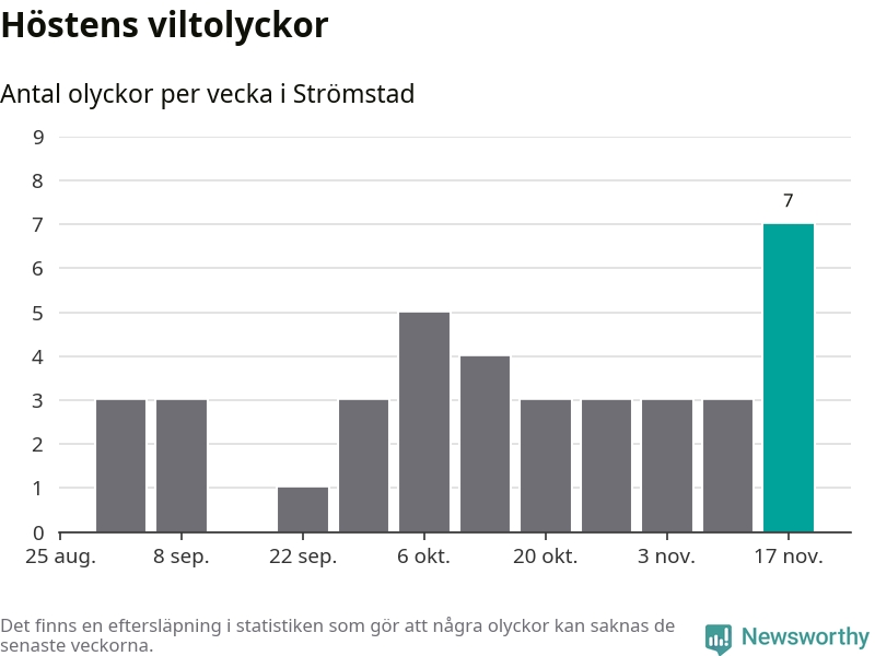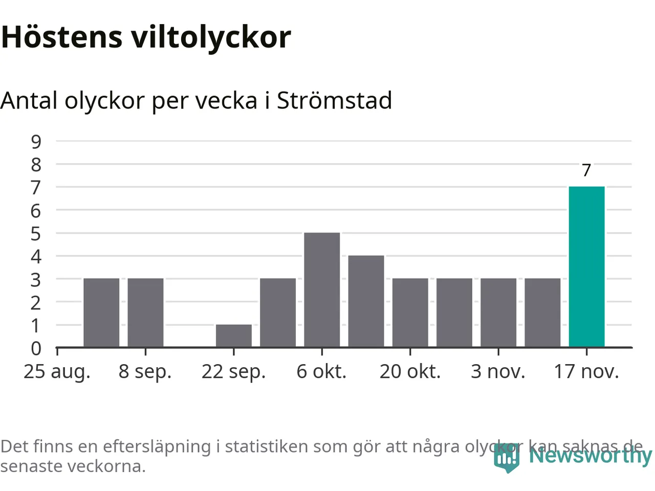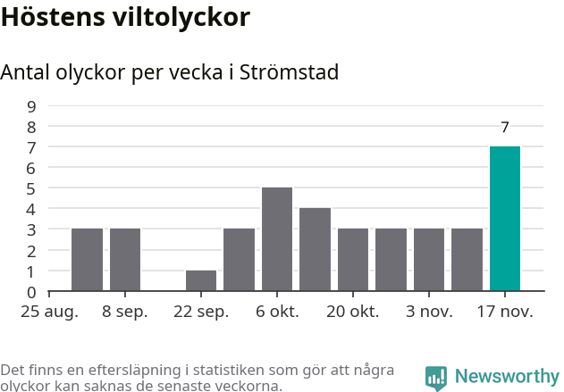 Under vecka 47 rapporterades sju viltolyckor in i Strömstads kommun. Det är det största antalet på en vecka den här hösten.