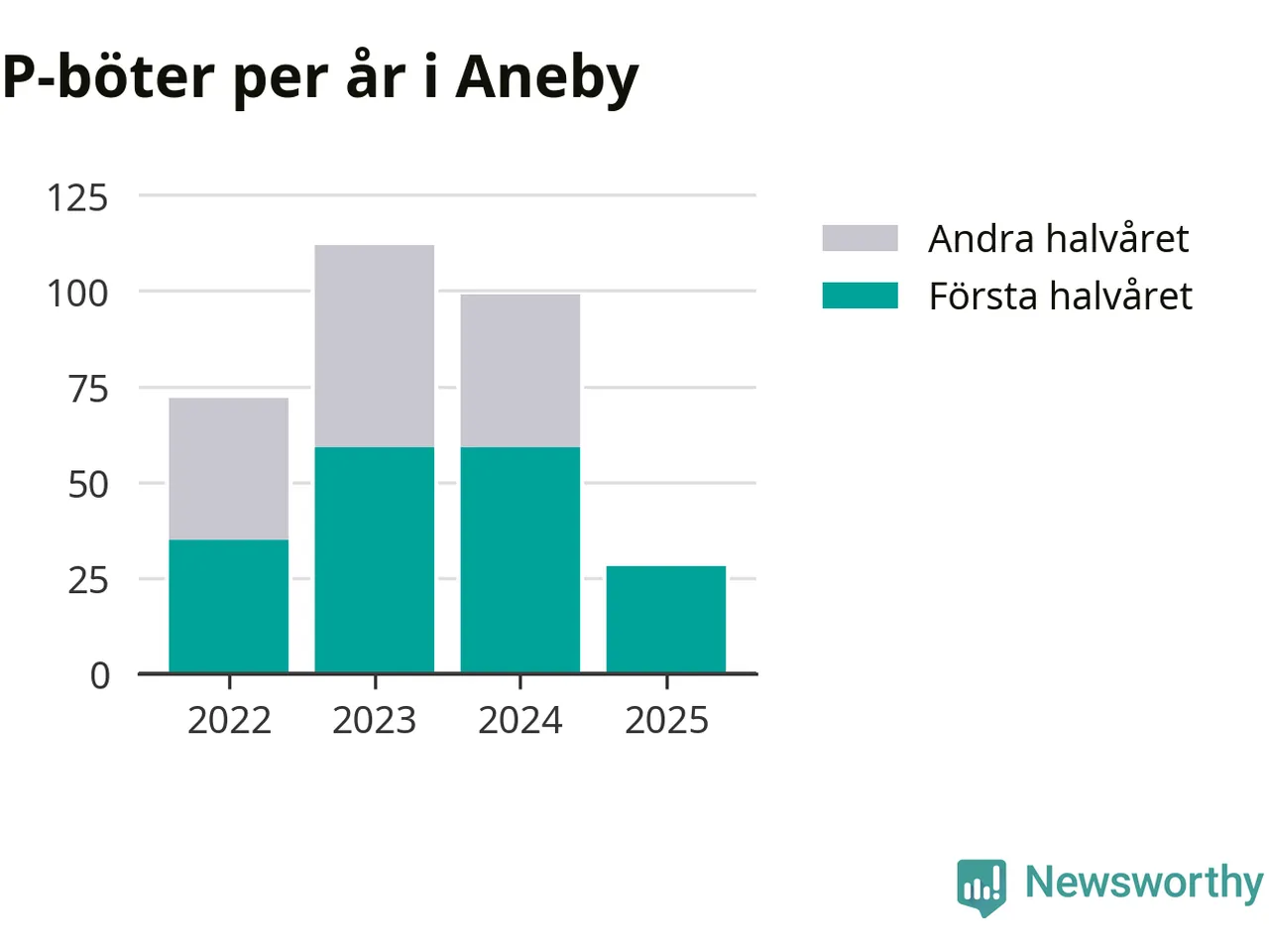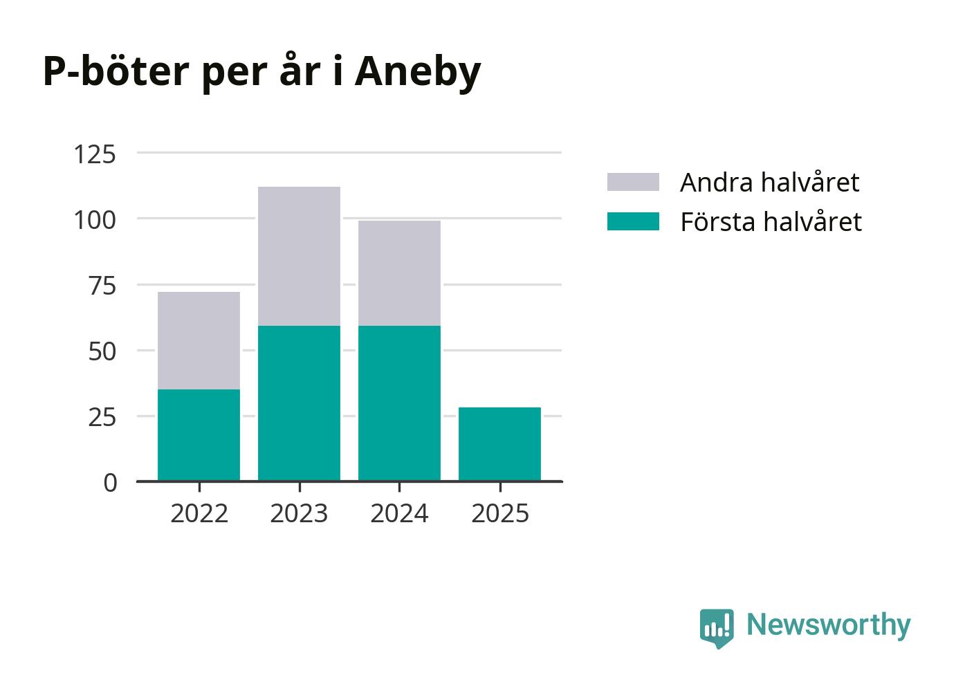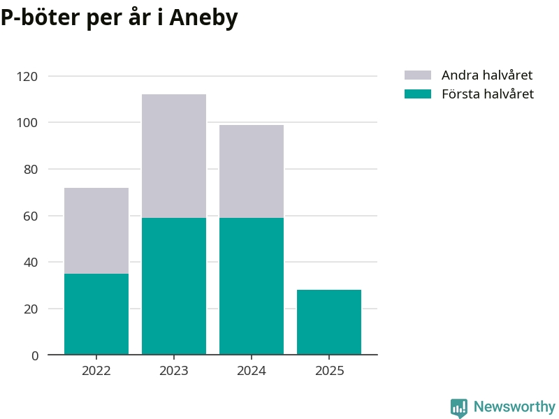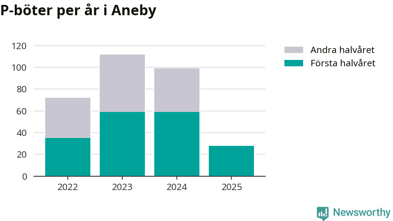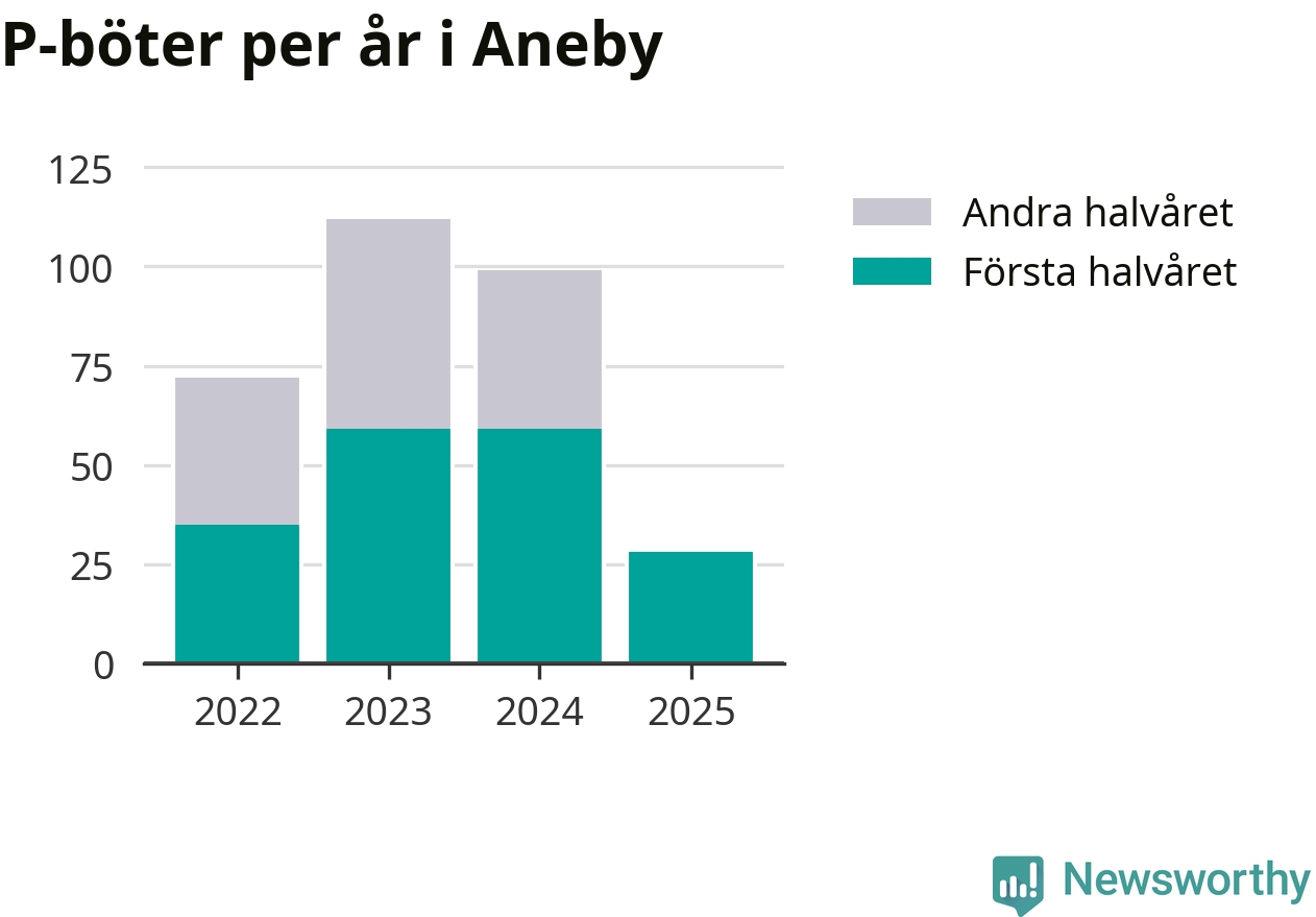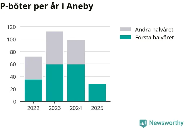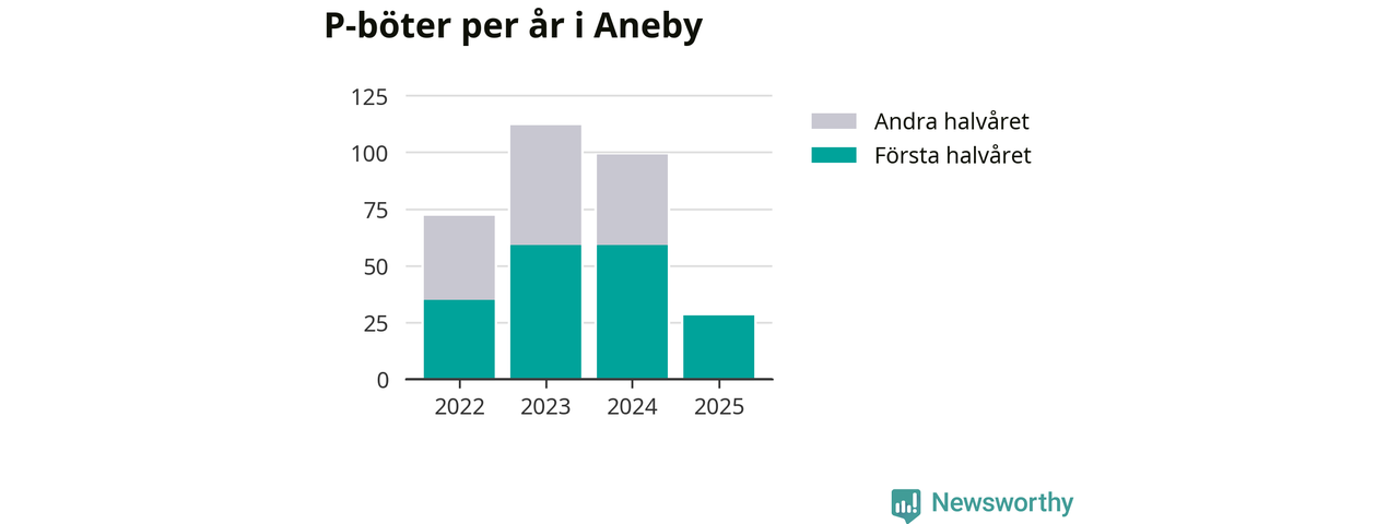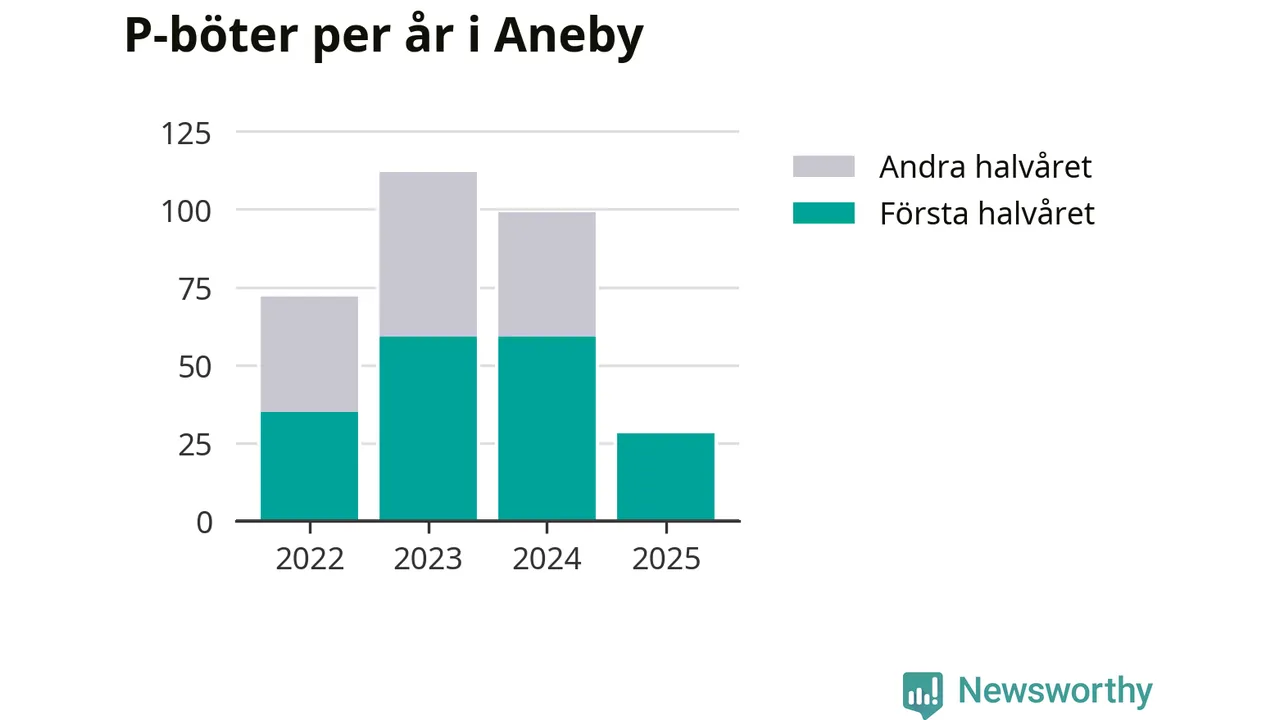 Under första halvåret 2025 har 28 parkeringsanmärkningar, med en total felparkeringsavgift på 19 200 kronor, delats ut på gatumark i Aneby kommun. Det är 31 färre än under första halvåret 2024.