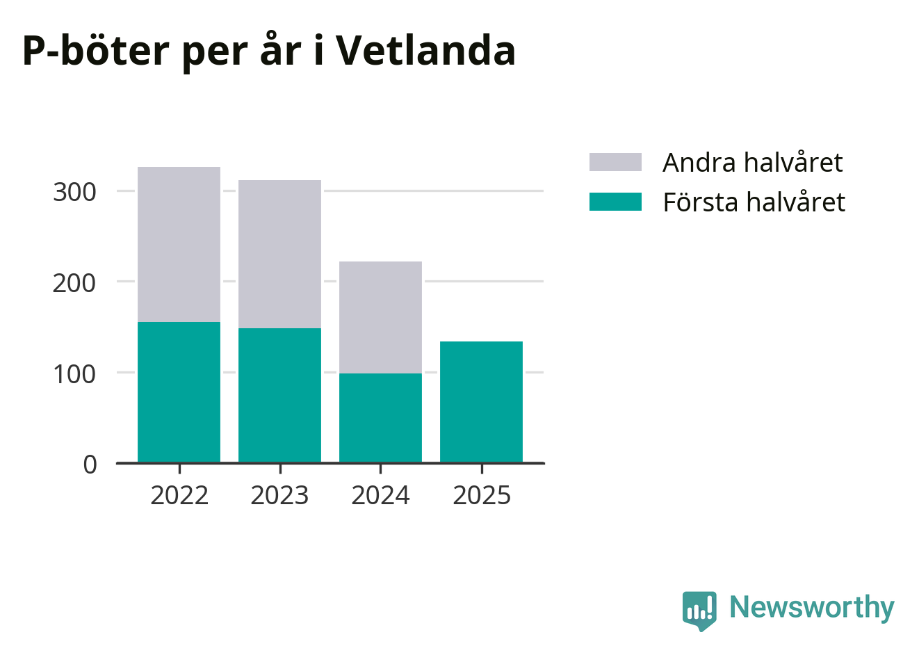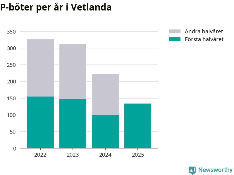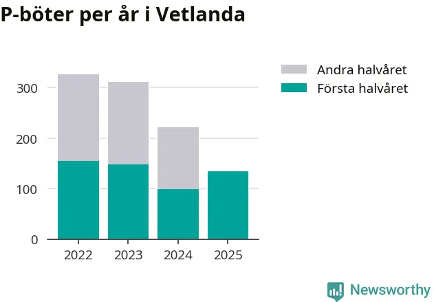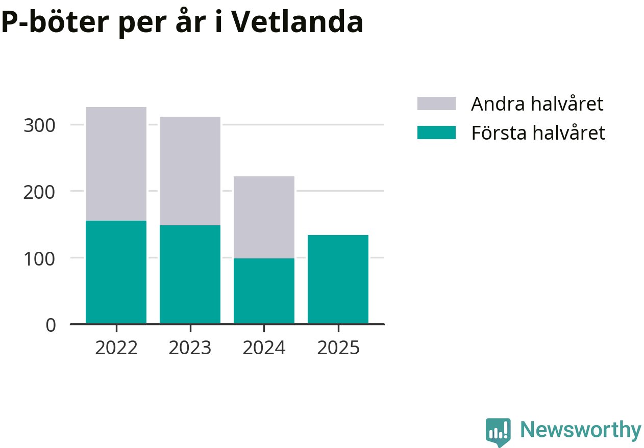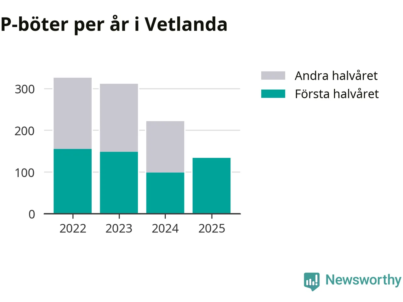 Under första halvåret 2025 har 134 parkeringsanmärkningar, med en total felparkeringsavgift på 58 100 kronor, delats ut på gatumark i Vetlanda kommun. Det är 35 fler än under första halvåret 2024.