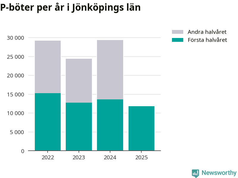 Under det första halvåret 2025 har totalt 11 872 parkeringsanmärkningar utfärdats av kommunerna i i Jönköpings län. Det är 1 769 färre än under första halvåret 2024.