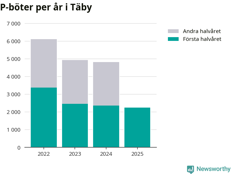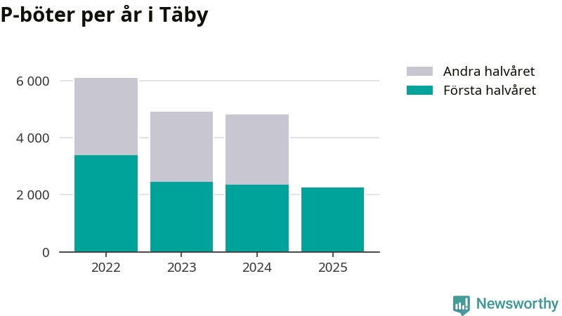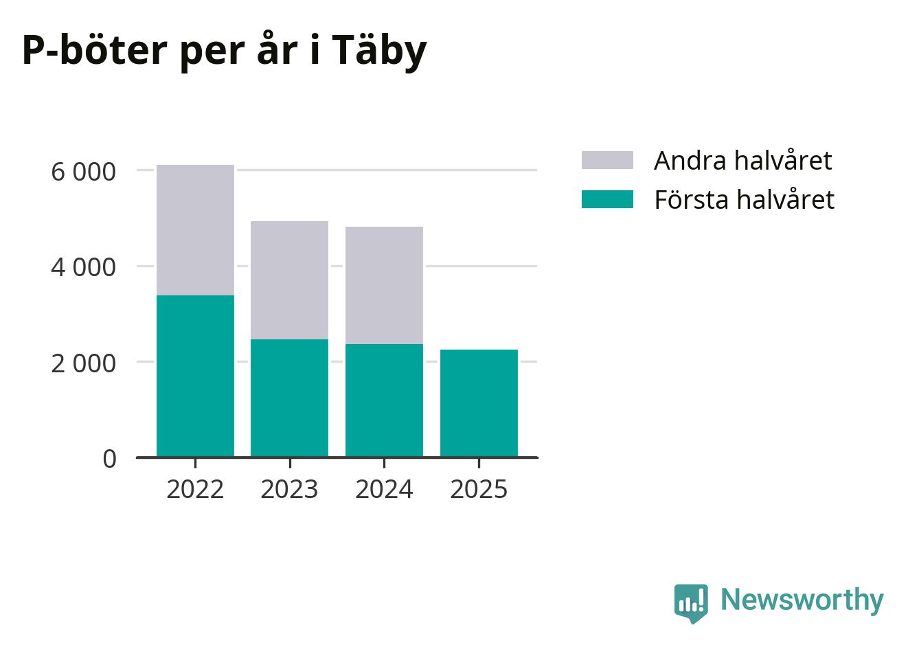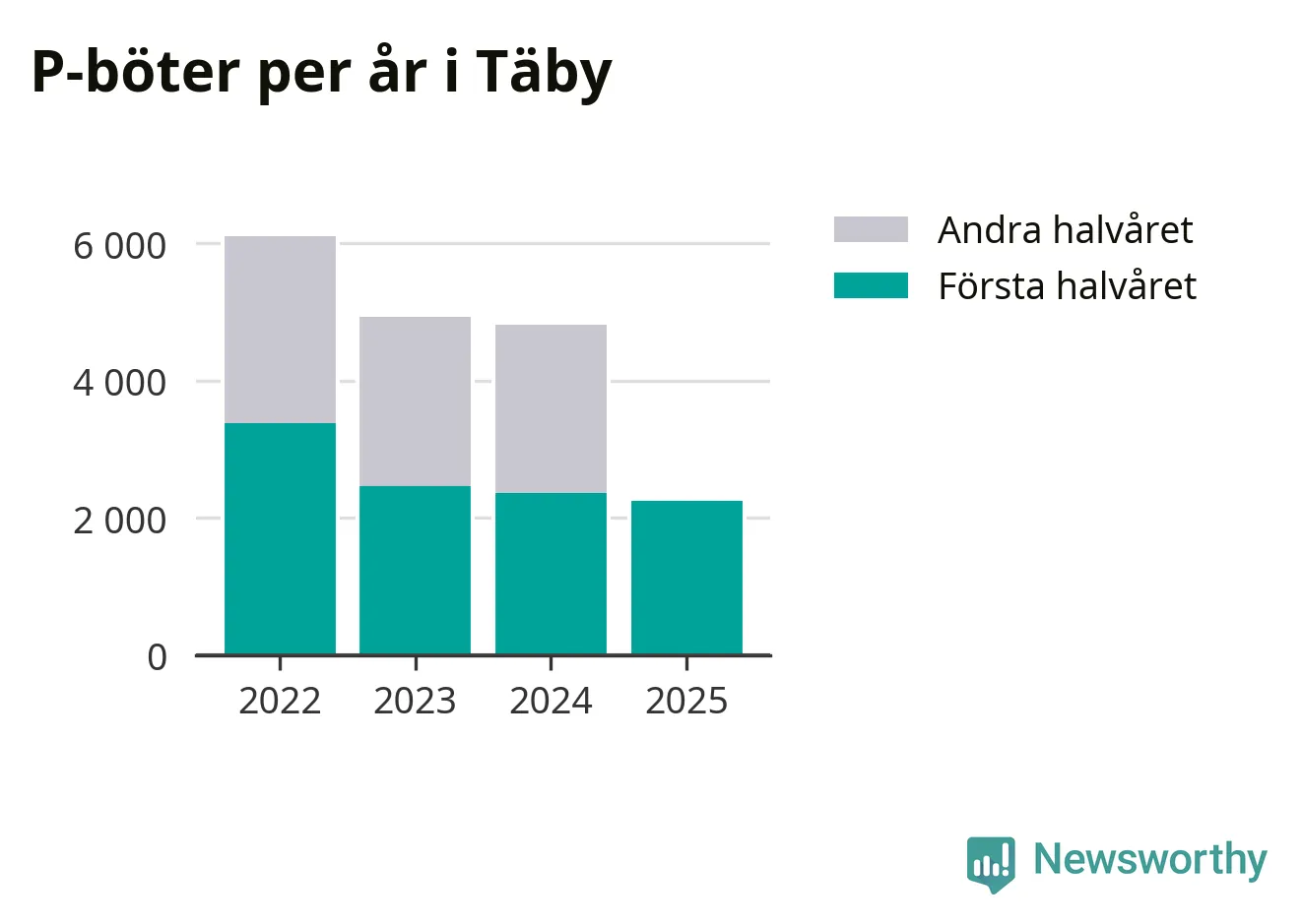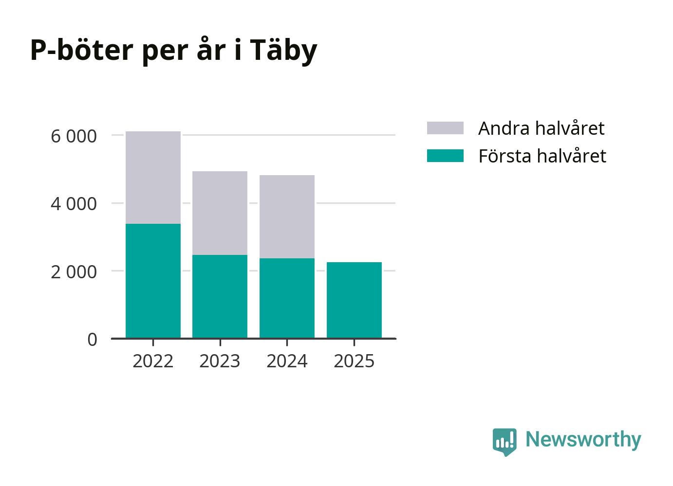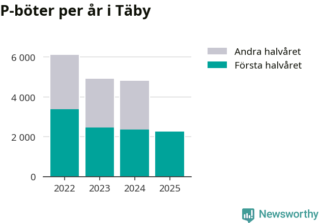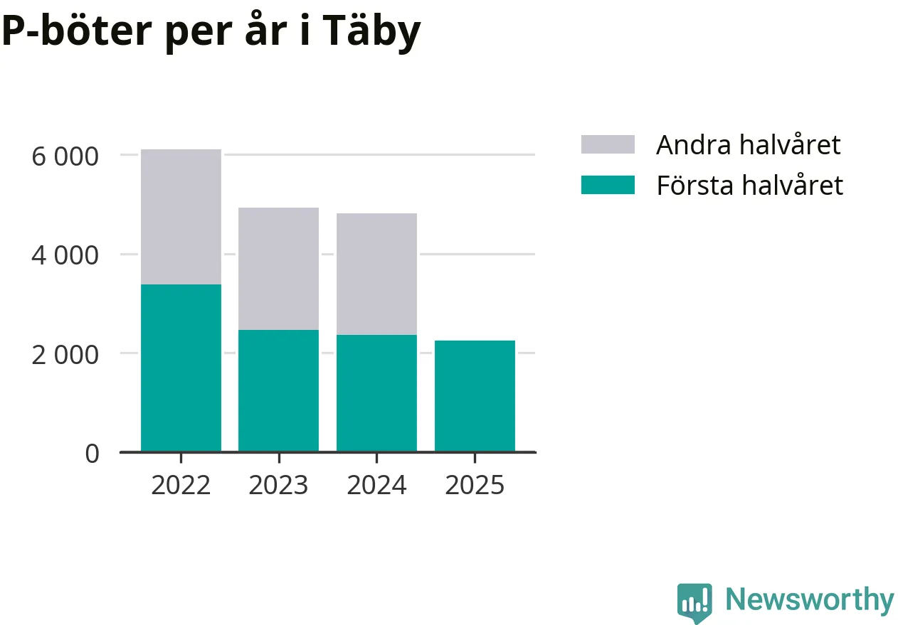 Under första halvåret 2025 har 2 250 parkeringsanmärkningar, med en total felparkeringsavgift på drygt 1,1 miljoner kronor, delats ut på gatumark i Täby kommun. Det är 113 färre än under första halvåret 2024.