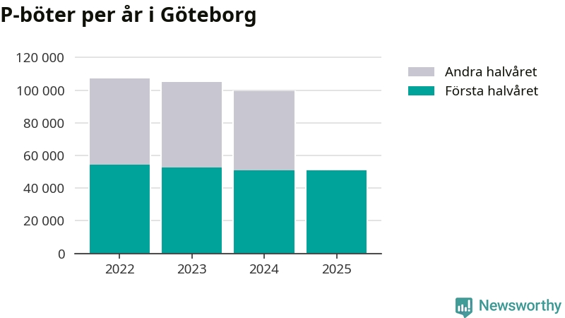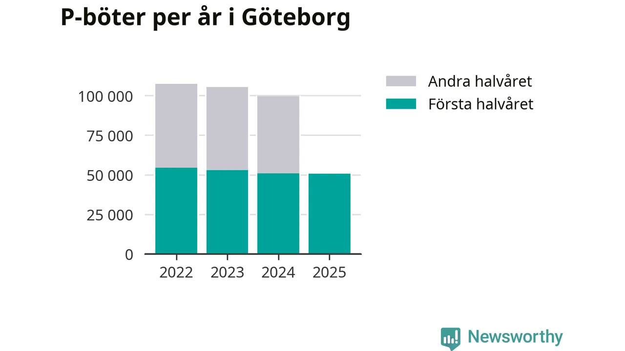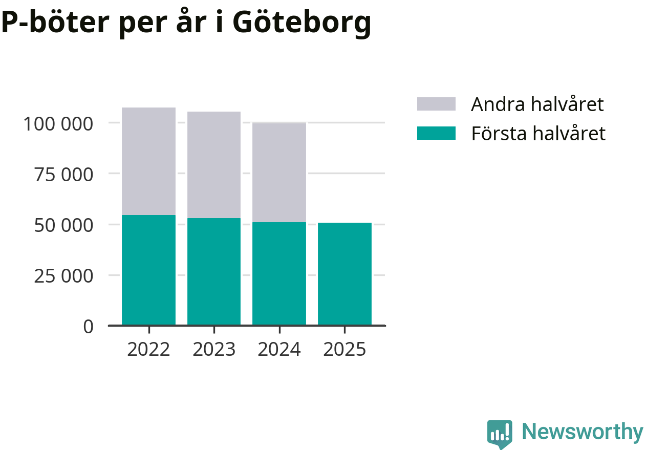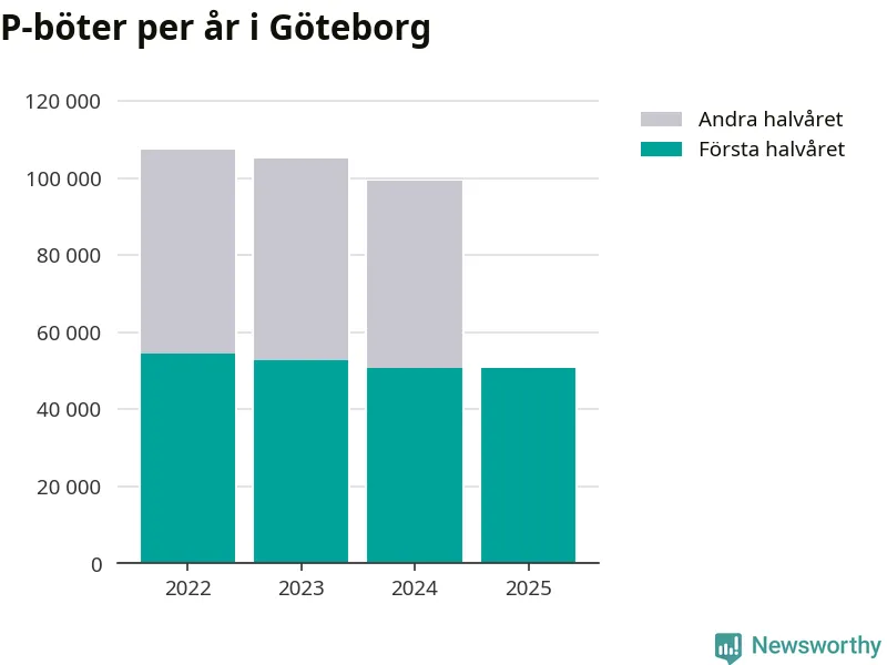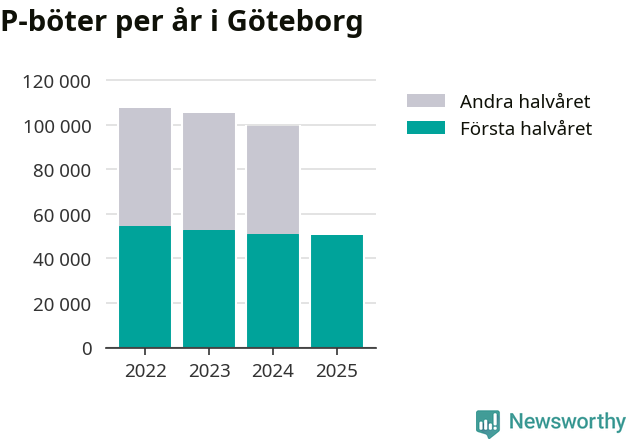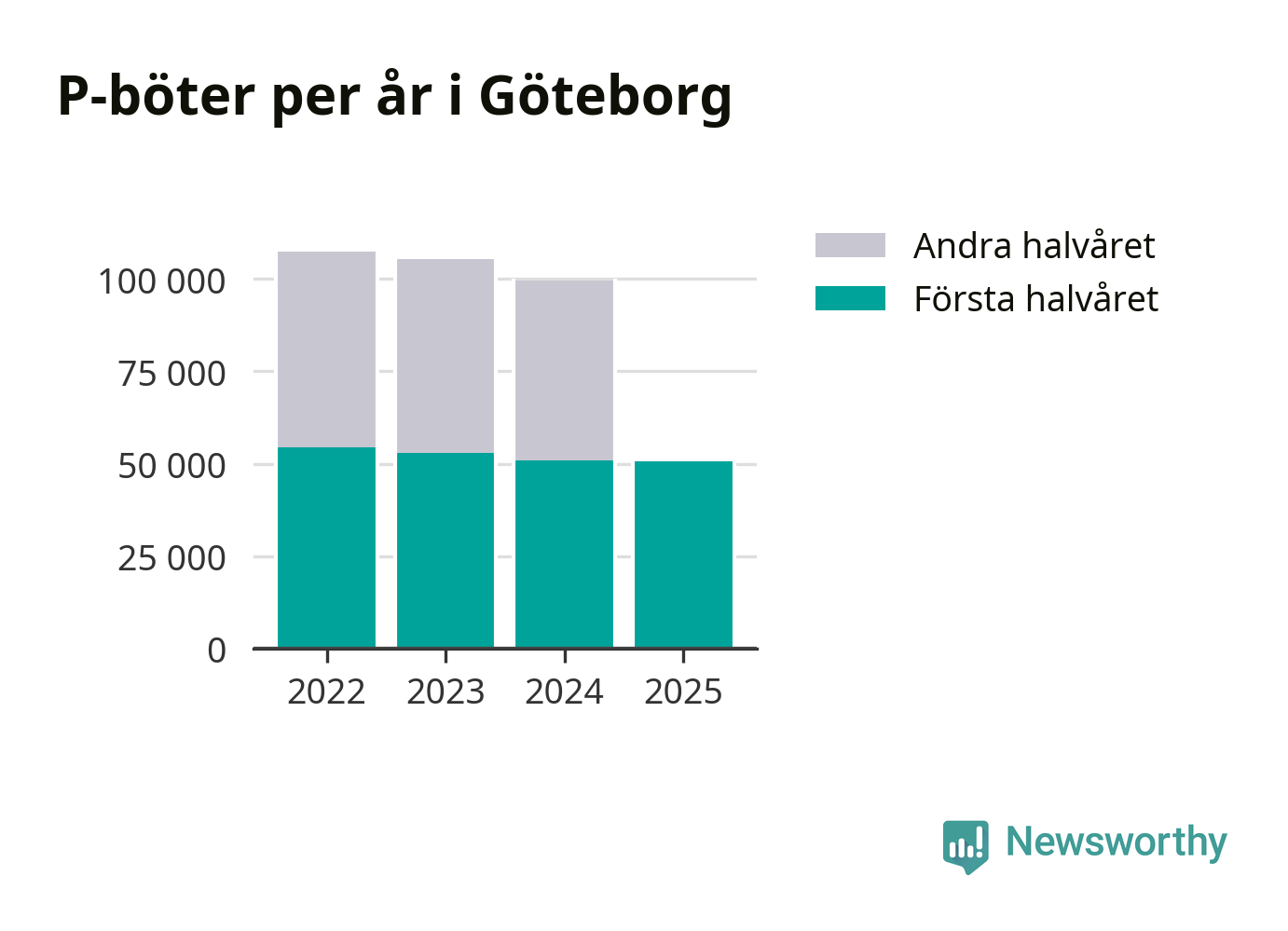 Under första halvåret 2025 har 50 681 parkeringsanmärkningar, med en total felparkeringsavgift på omkring 38,1 miljoner kronor, delats ut på gatumark i Göteborgs kommun. Det är ungefär lika många som året innan.