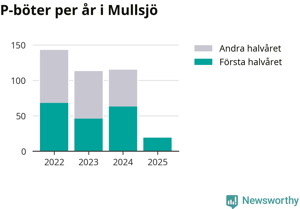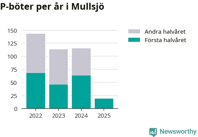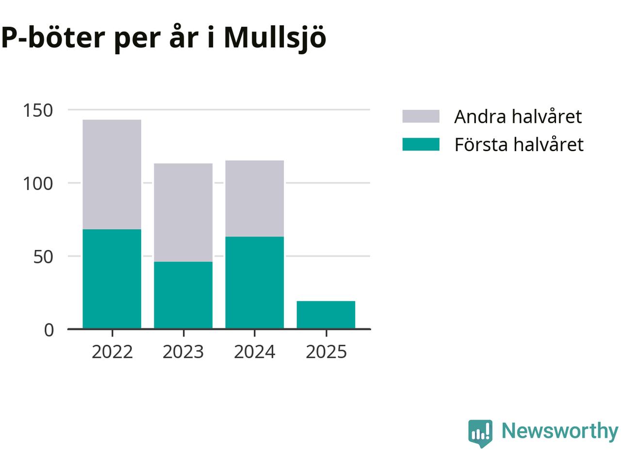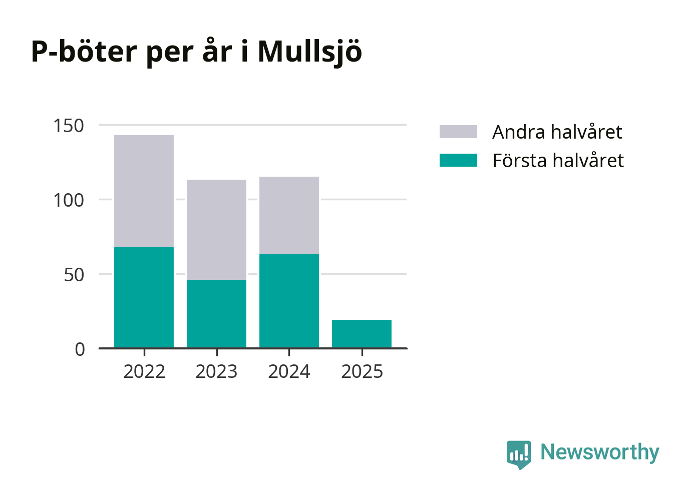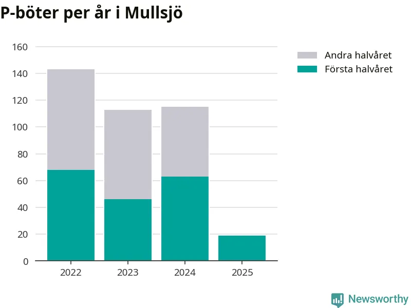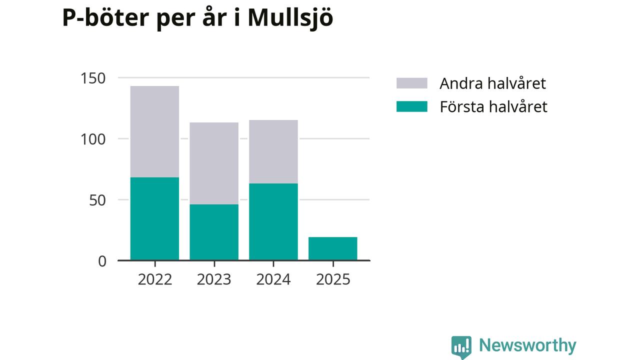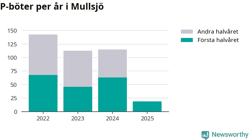 Under första halvåret 2025 har 19 parkeringsanmärkningar, med en total felparkeringsavgift på 14 700 kronor, delats ut på gatumark i Mullsjö kommun. Det är 44 färre än under första halvåret 2024.