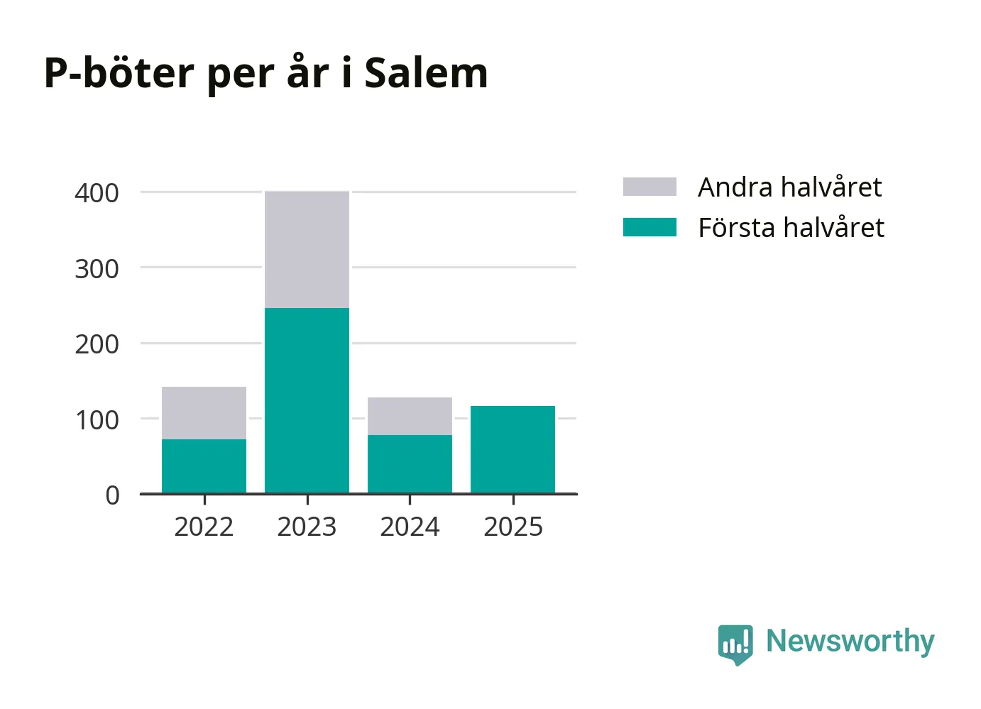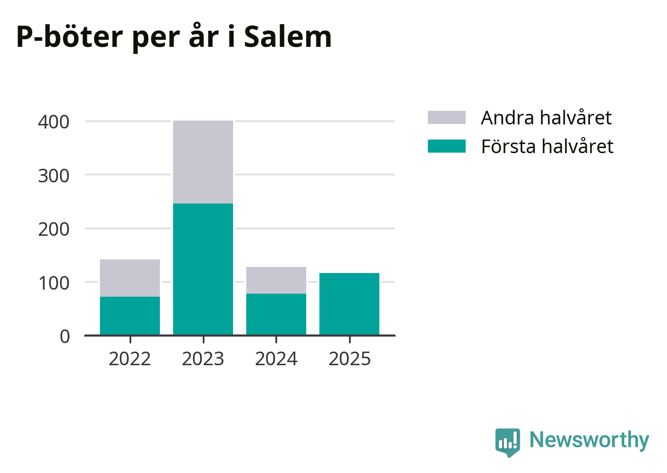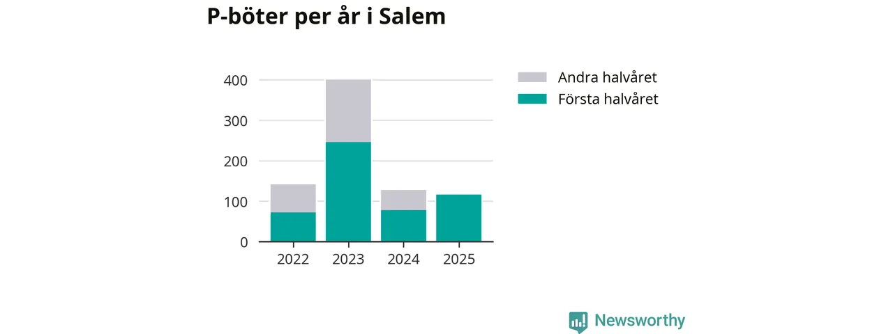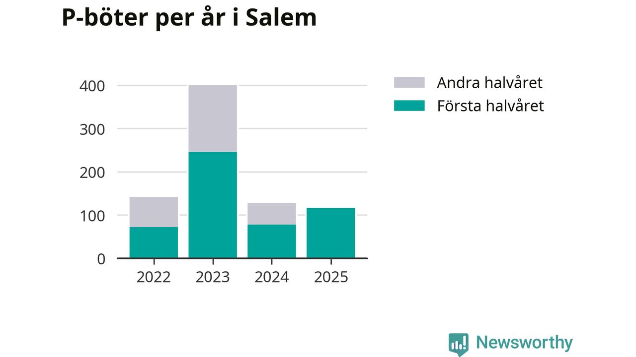 Under första halvåret 2025 har 116 parkeringsanmärkningar, med en total felparkeringsavgift på 54 500 kronor, delats ut på gatumark i Salems kommun. Det är 38 fler än under första halvåret 2024.