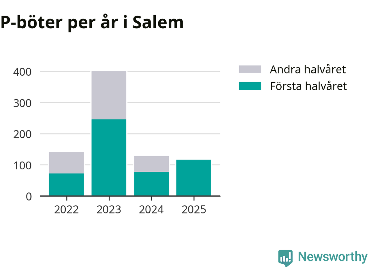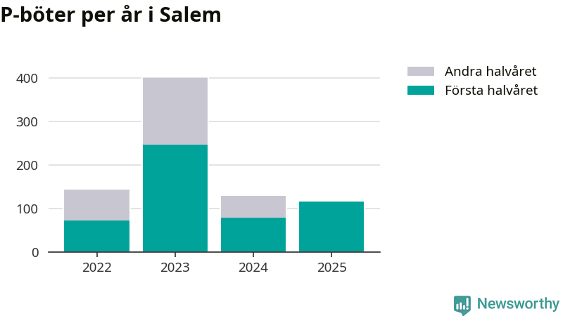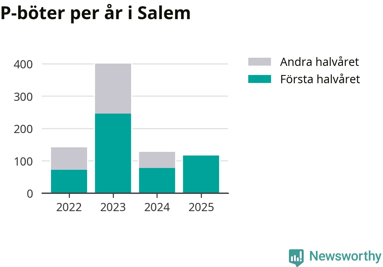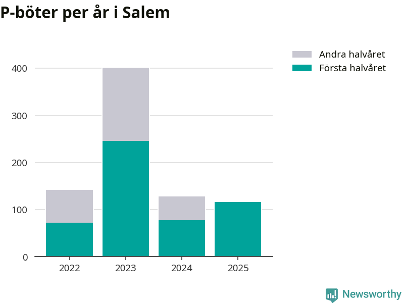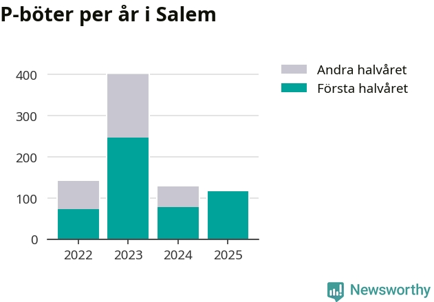 Under första halvåret 2025 har 116 parkeringsanmärkningar, med en total felparkeringsavgift på 54 500 kronor, delats ut på gatumark i Salems kommun. Det är 38 fler än under första halvåret 2024.