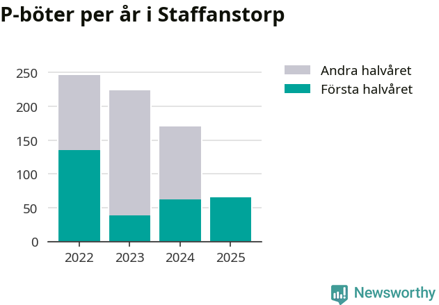Under första halvåret 2025 har 65 parkeringsanmärkningar, med en total felparkeringsavgift på 47 000 kronor, delats ut på gatumark i Staffanstorps kommun. Det är ungefär lika många som året innan.