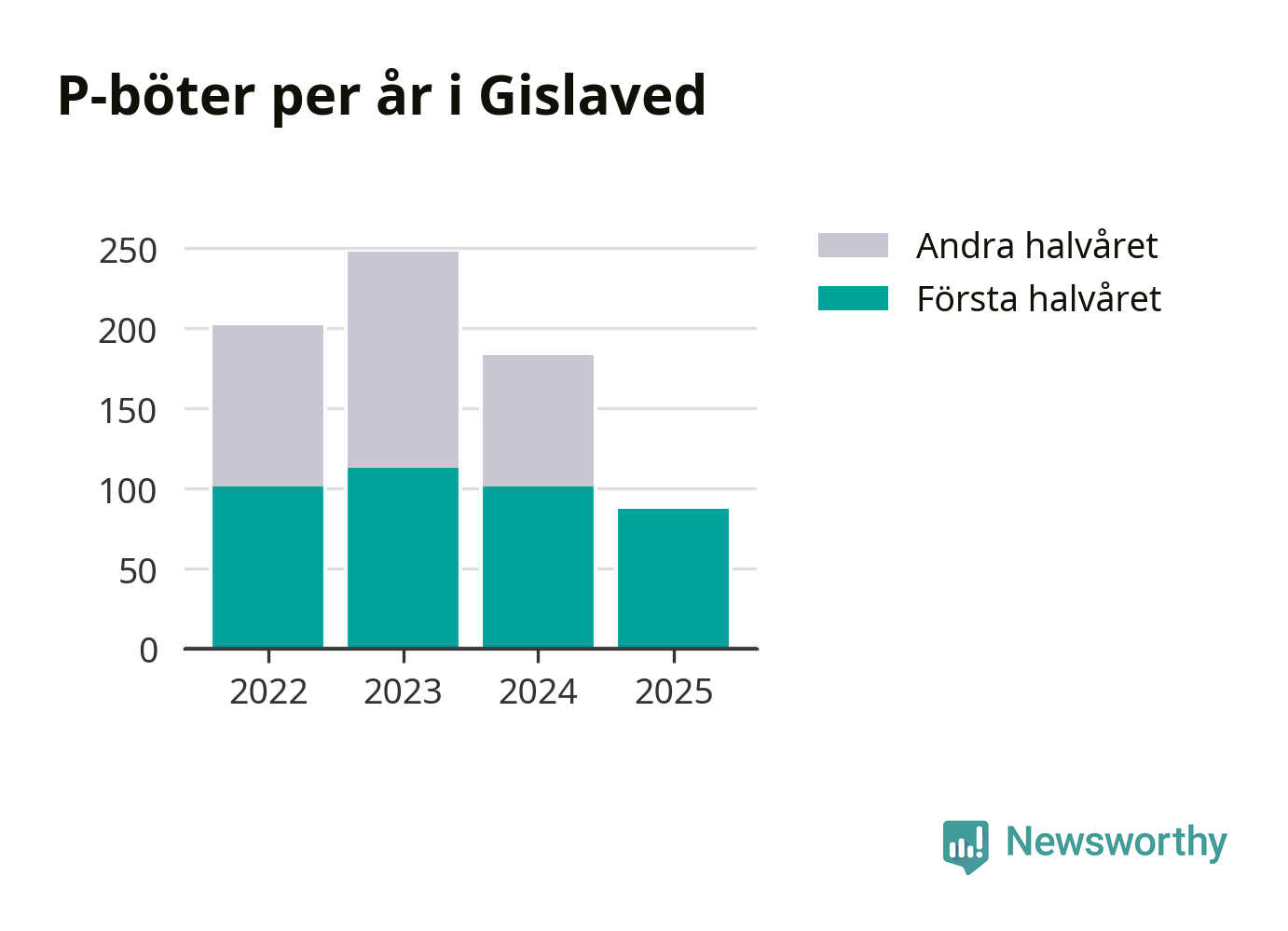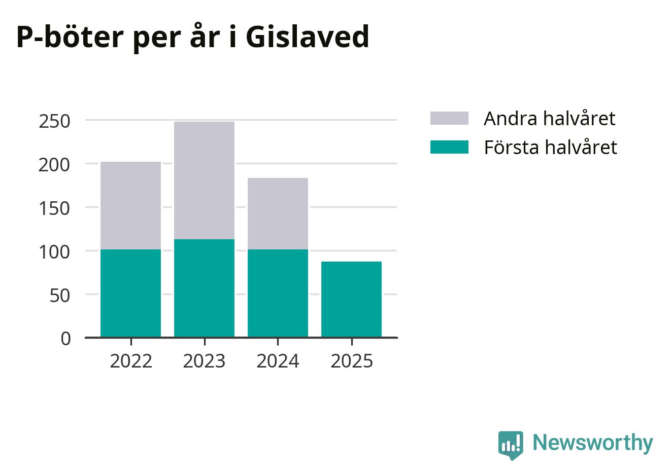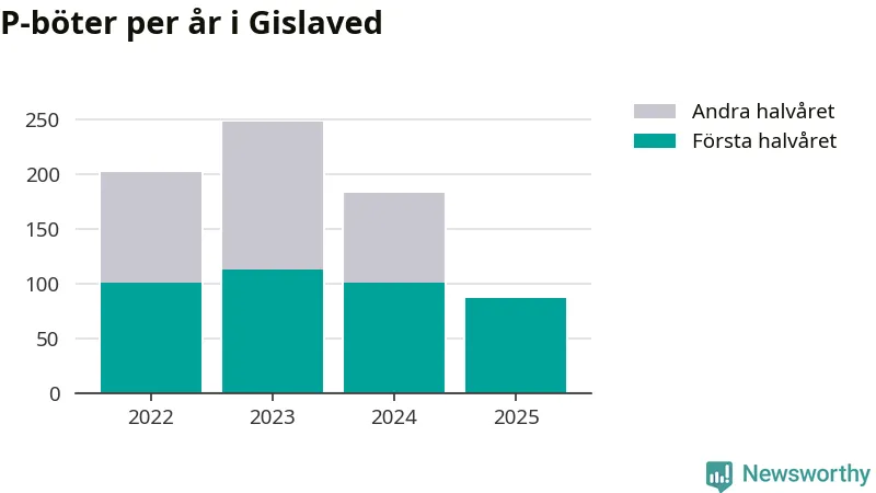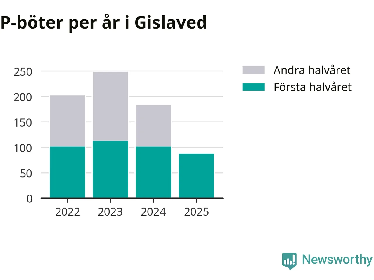 Under första halvåret 2025 har 87 parkeringsanmärkningar, med en total felparkeringsavgift på 63 400 kronor, delats ut på gatumark i Gislaveds kommun. Det är 14 färre än under första halvåret 2024.