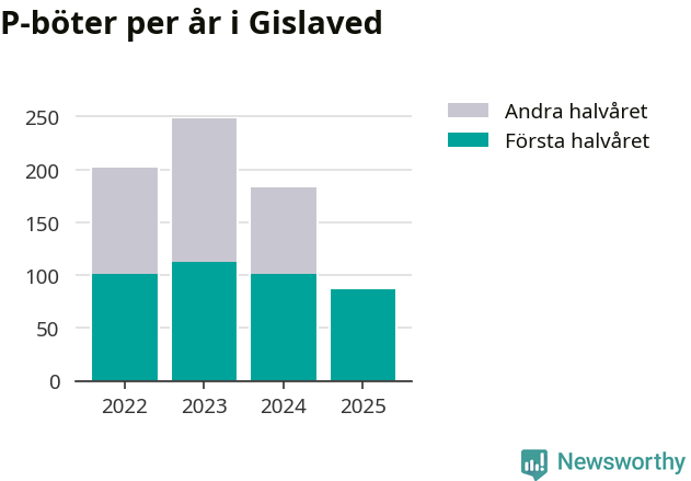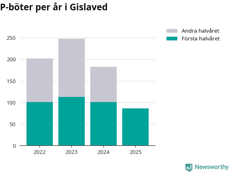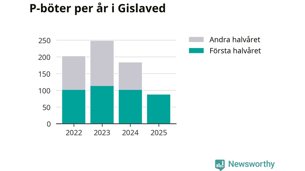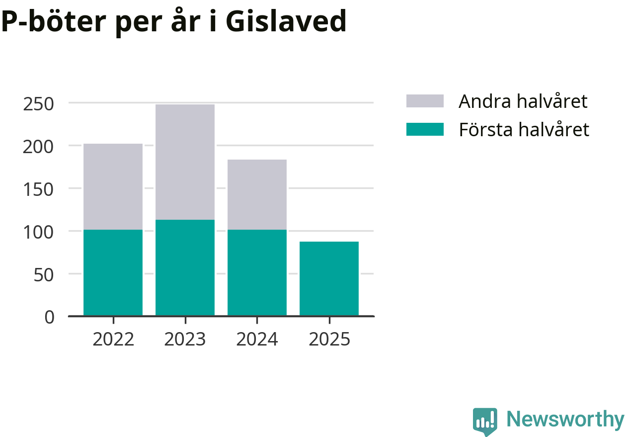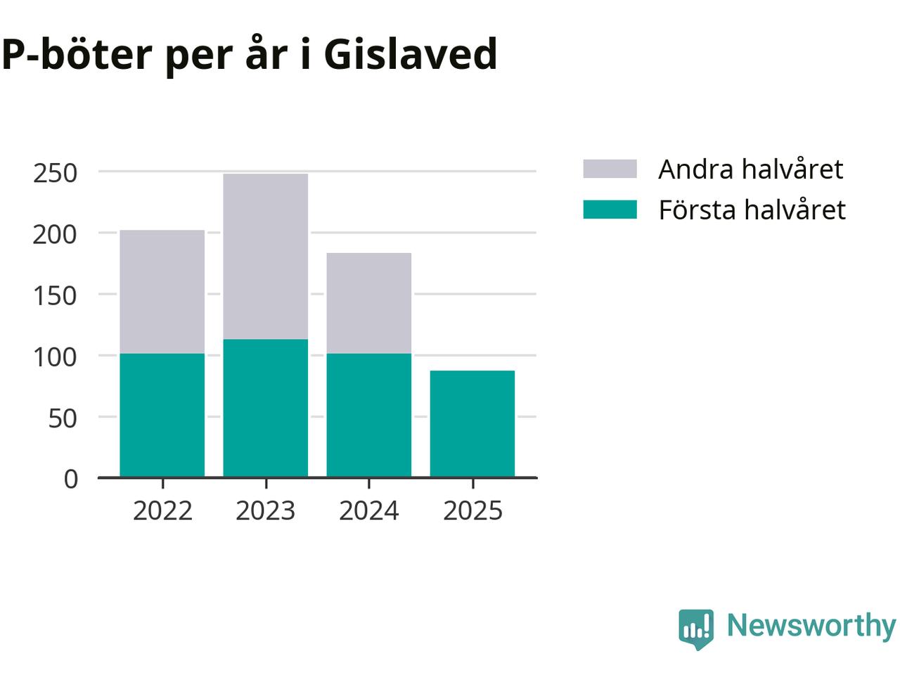 Under första halvåret 2025 har 87 parkeringsanmärkningar, med en total felparkeringsavgift på 63 400 kronor, delats ut på gatumark i Gislaveds kommun. Det är 14 färre än under första halvåret 2024.