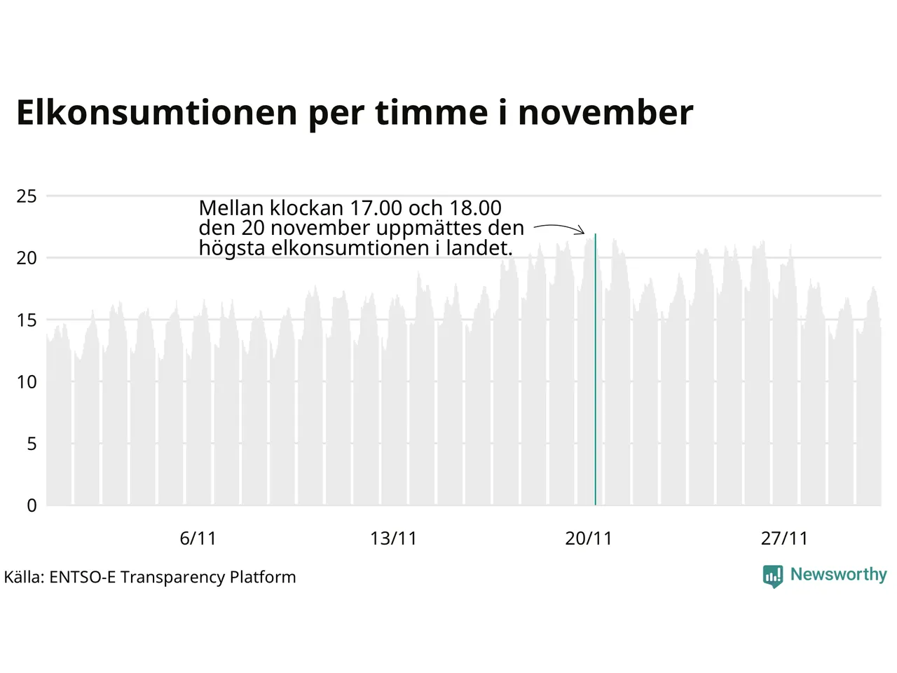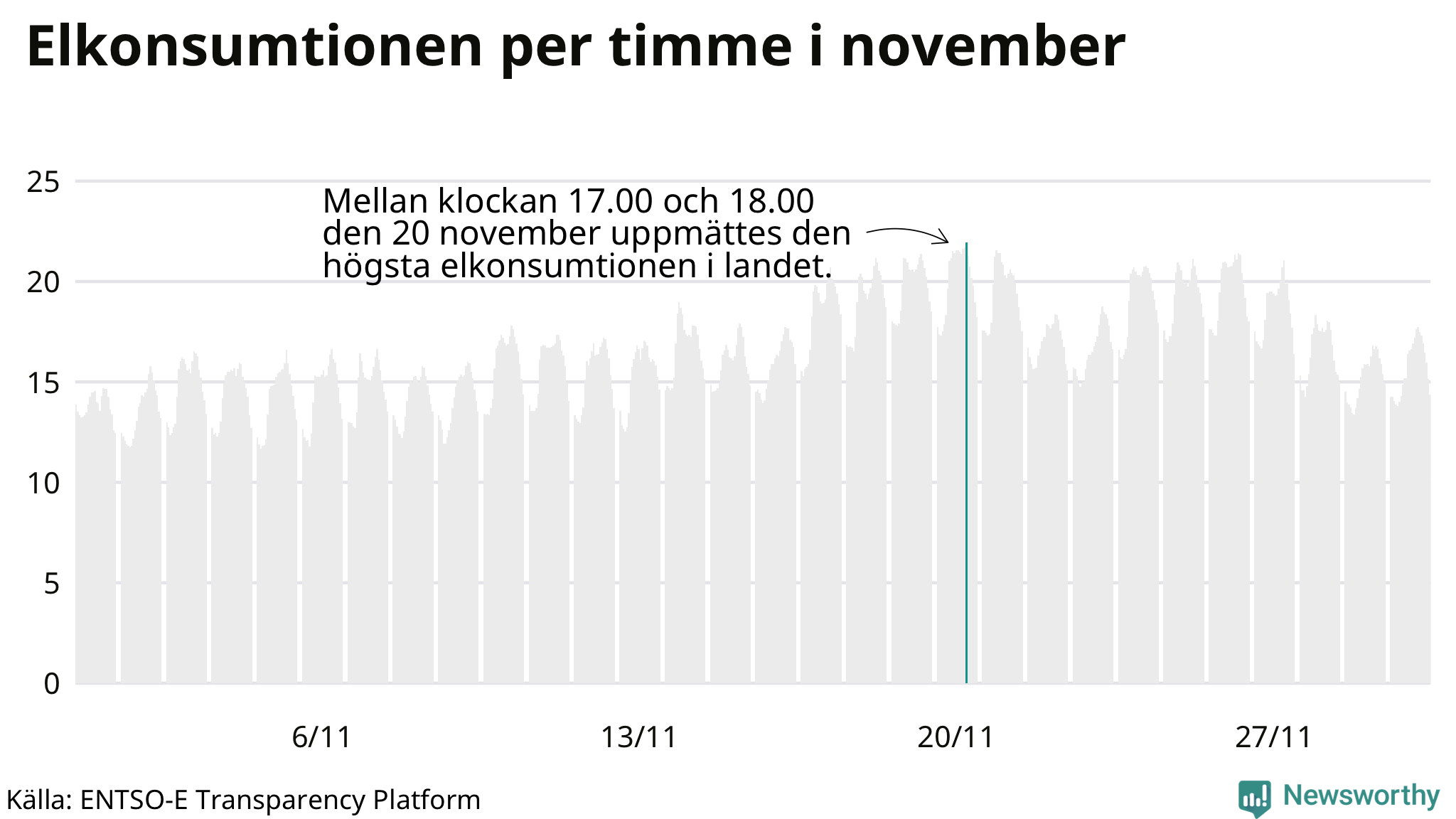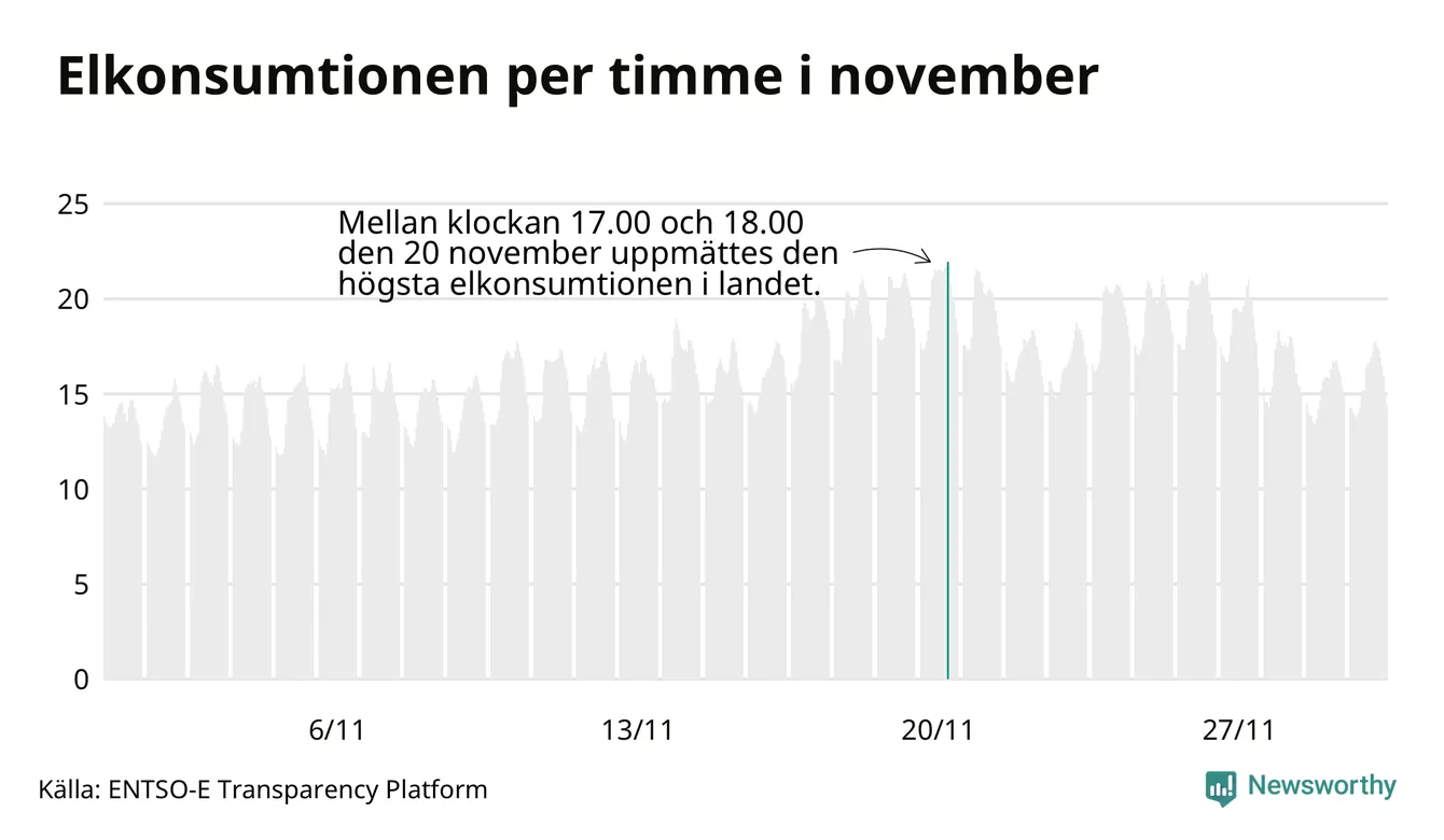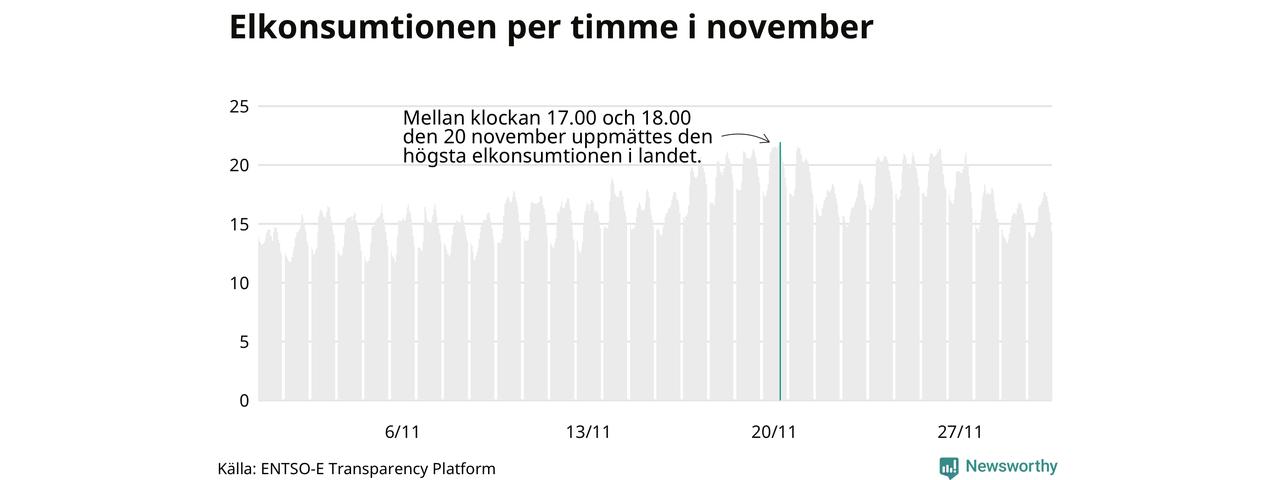 Den 20 november konsumerades som mest el under ett dygn i Sverige under månaden, det var också under det dygnet då månadens topptimme uppmättes, mellan klockan 17 och 18.