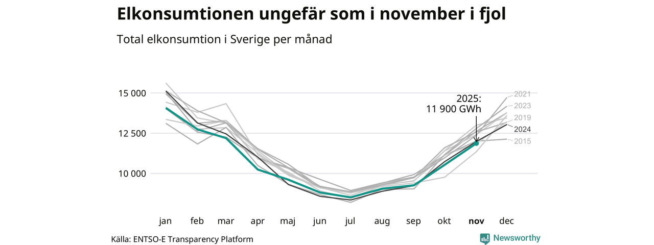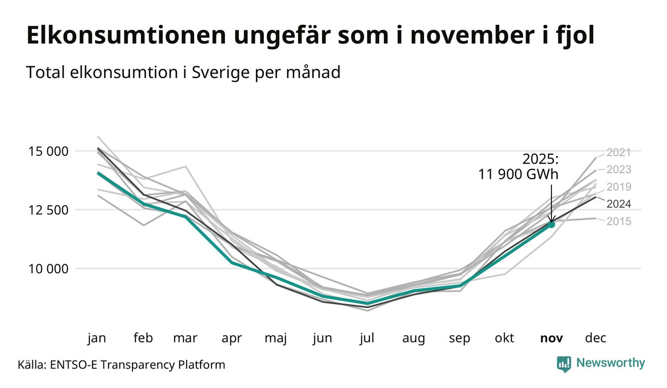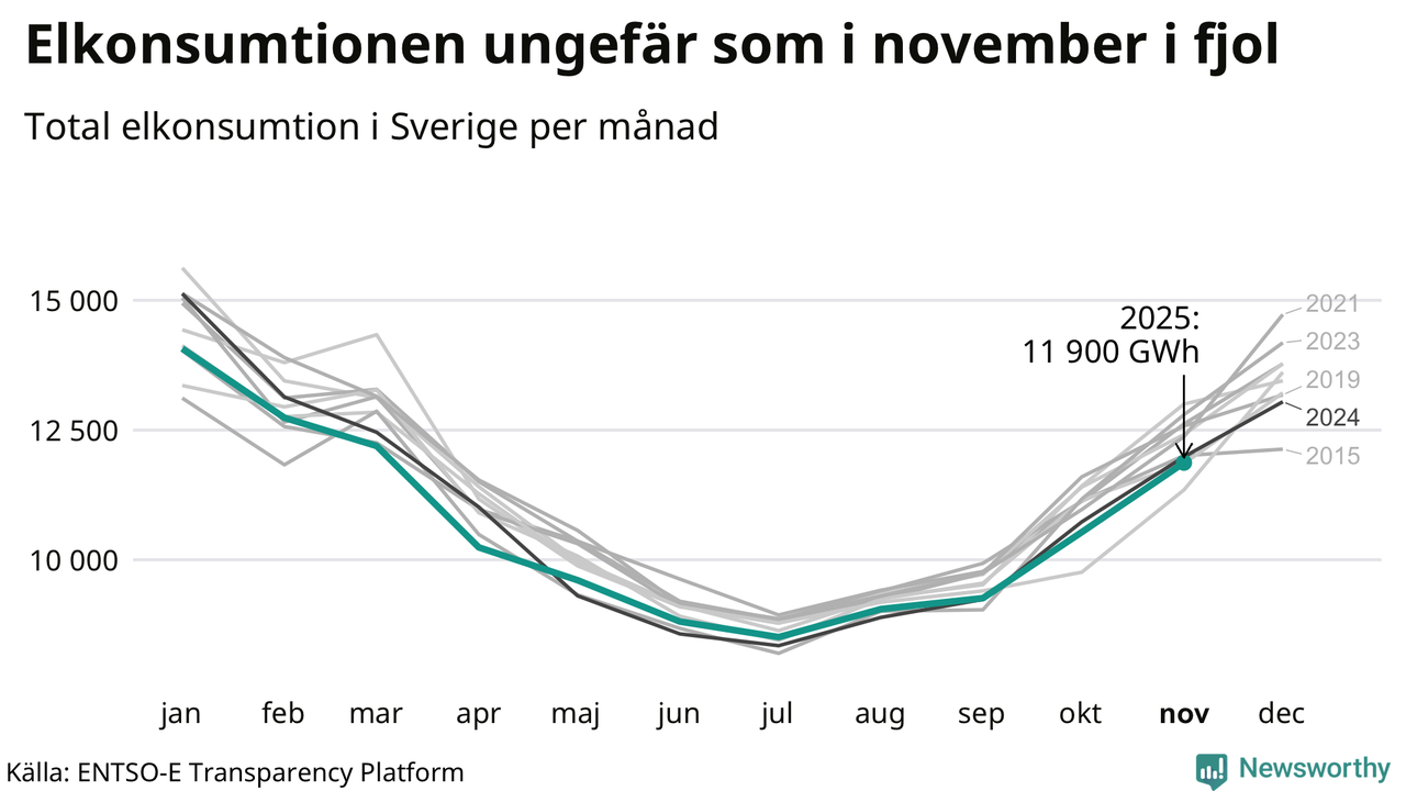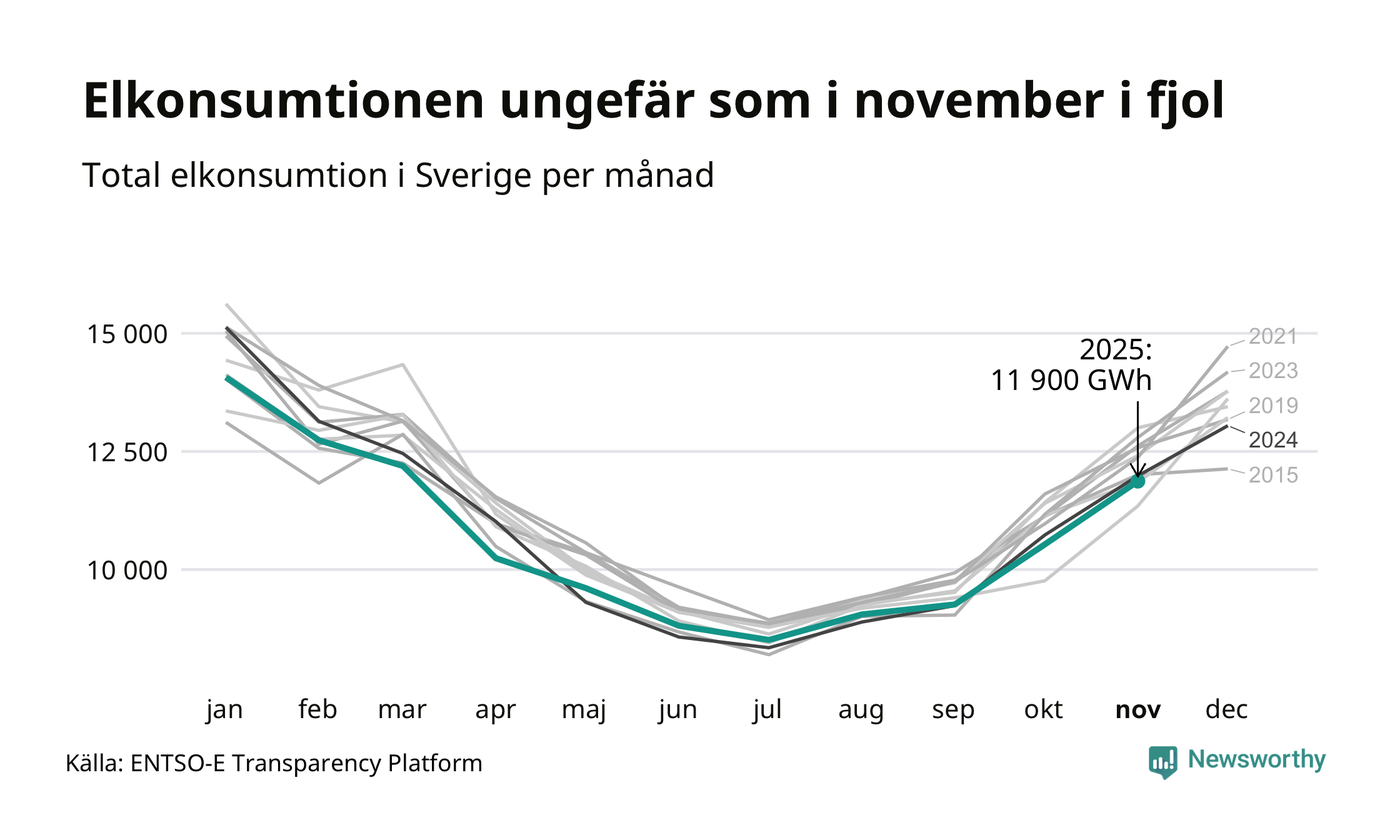 Under november förbrukades det ungefär 11 900 gigawattimmar el i Sverige. Det är ungefär tre procent mindre än snittet för månaden. Konsumtionen påverkas mycket av hur varmt det är i landet, enligt SMHI inleddes november milt, innan kylan kom. I den norra delen av landet blev månaden sammantaget kallare än normalt, medan det i de västra delarna och södra Norrland var något varmare än normalperioden 1991-2020.