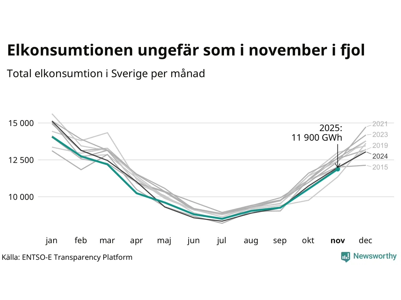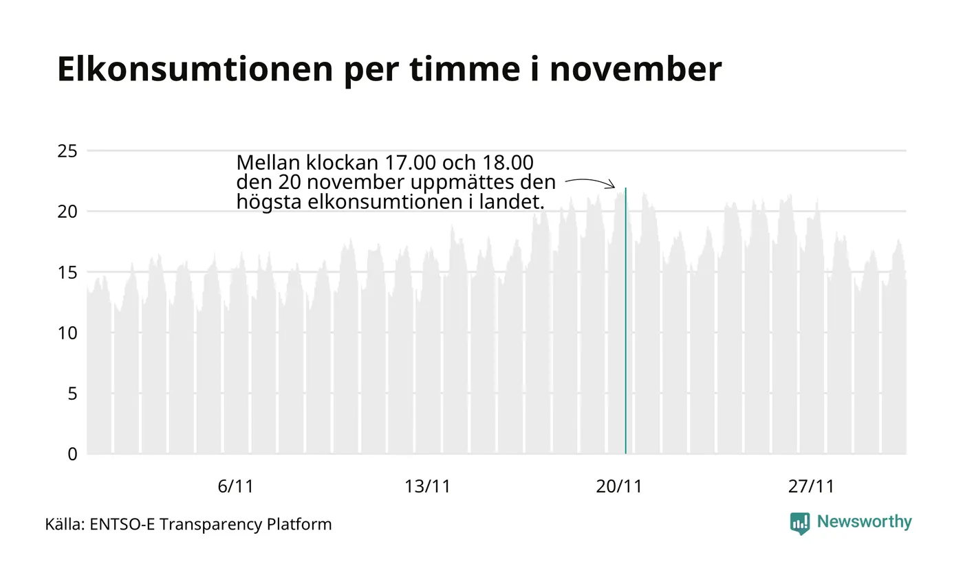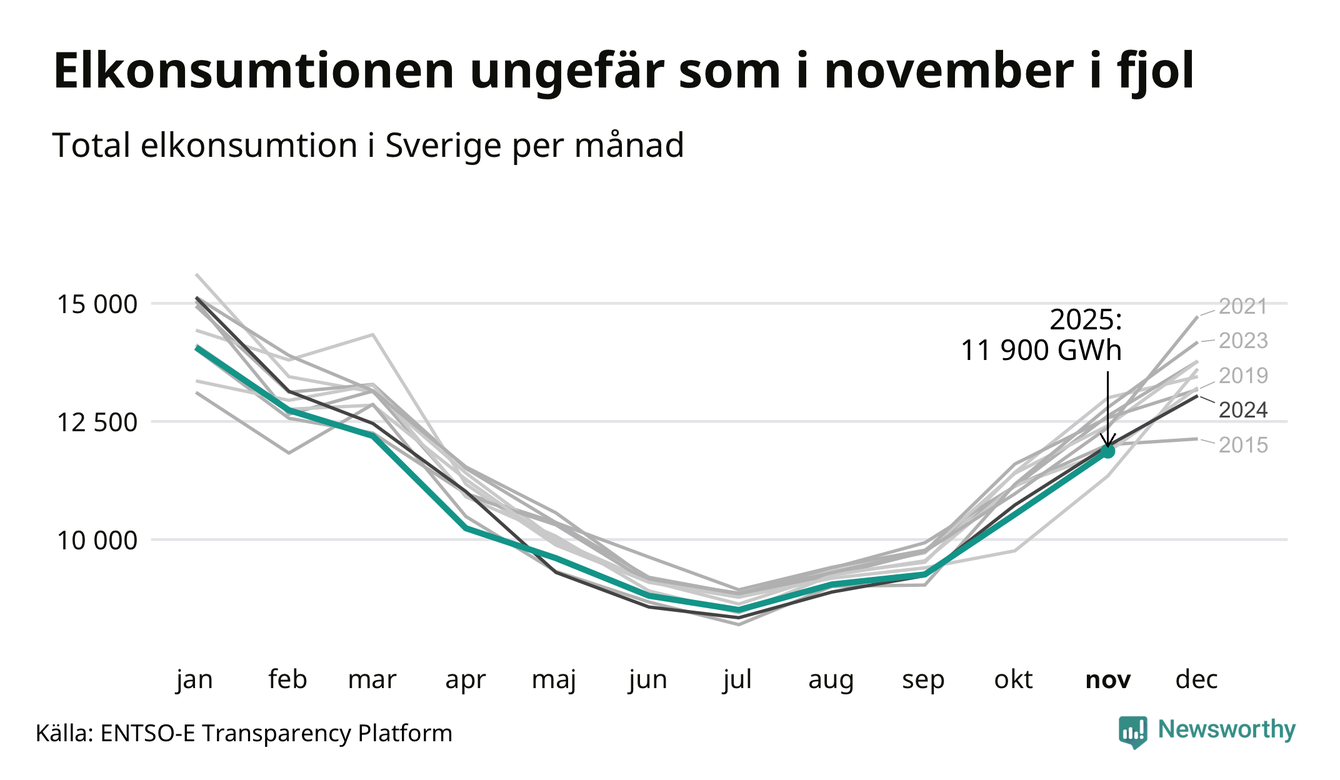 Under november förbrukades det ungefär 11 900 gigawattimmar el i Sverige. Det är ungefär tre procent mindre än snittet för månaden. Konsumtionen påverkas mycket av hur varmt det är i landet, enligt SMHI inleddes november milt, innan kylan kom. I den norra delen av landet blev månaden sammantaget kallare än normalt, medan det i de västra delarna och södra Norrland var något varmare än normalperioden 1991-2020.