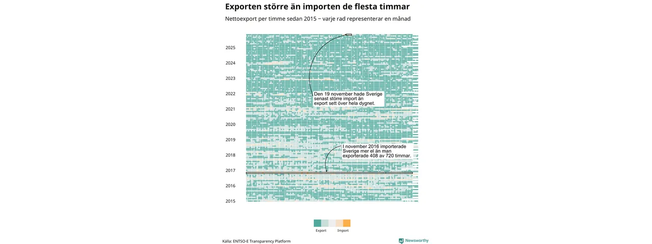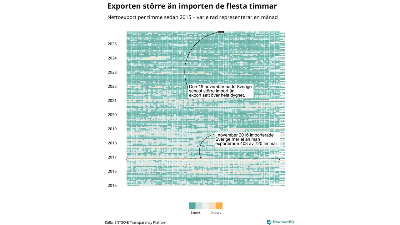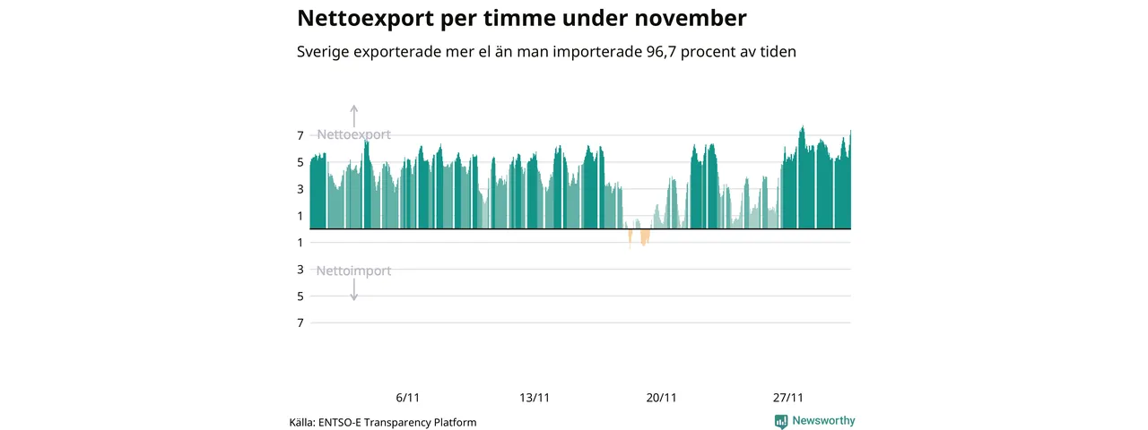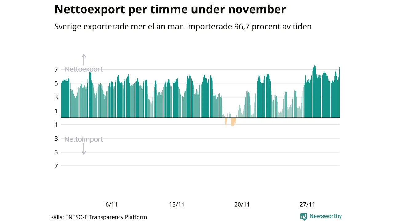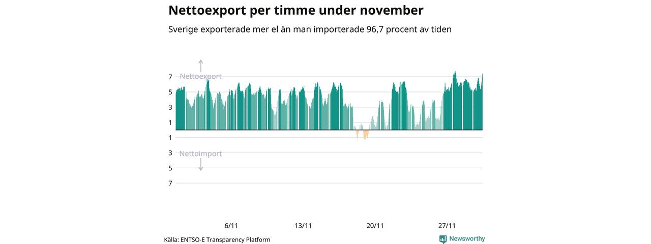 Det produceras som sagt mer el i Sverige än det förbrukas, i alla fall om man tittar på månadsbasis – bara två månader under de senaste elva åren har Sverige importerat mer el än landet exporterat. Under kortare tidsperioder händer det att Sverige har nettoimport. Under november importerade Sverige mer el än man exporterade under 24 timmar.