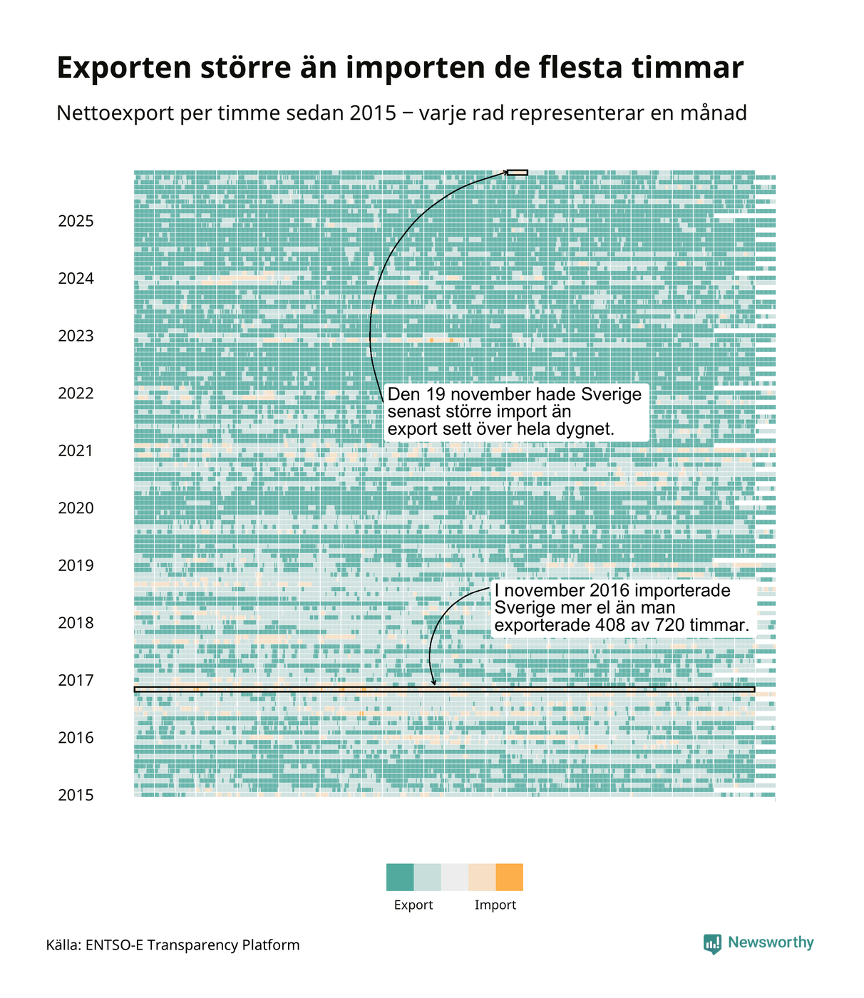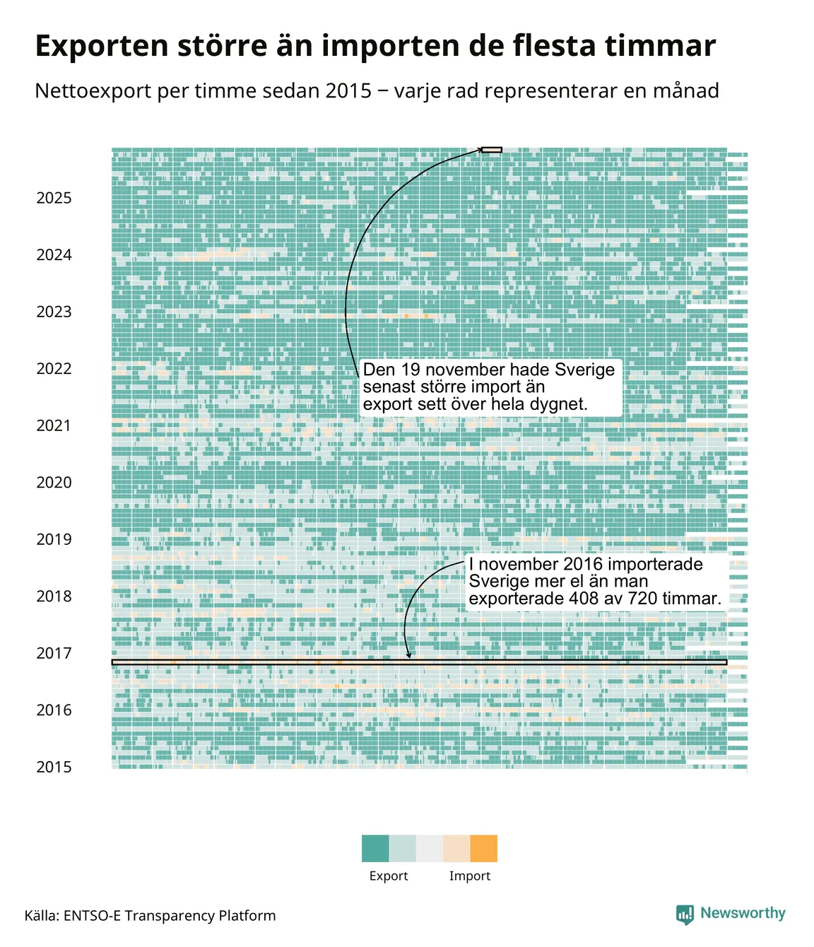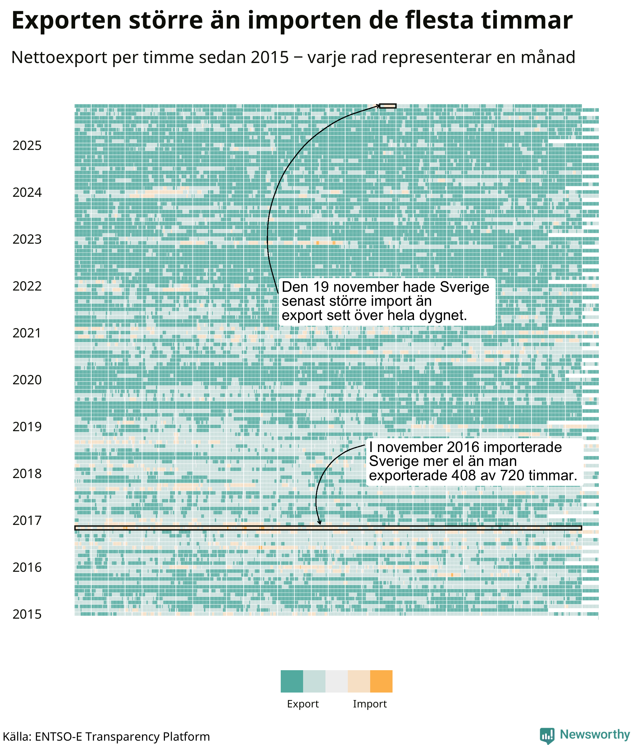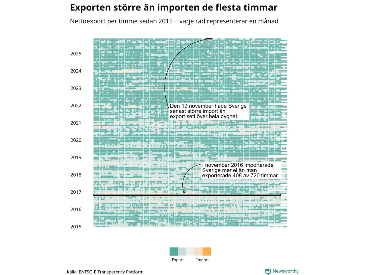 Det produceras som sagt mer el i Sverige än det förbrukas, i alla fall om man tittar på månadsbasis – bara två månader under de senaste elva åren har Sverige importerat mer el än landet exporterat. Under kortare tidsperioder händer det att Sverige har nettoimport. Under november importerade Sverige mer el än man exporterade under 24 timmar.