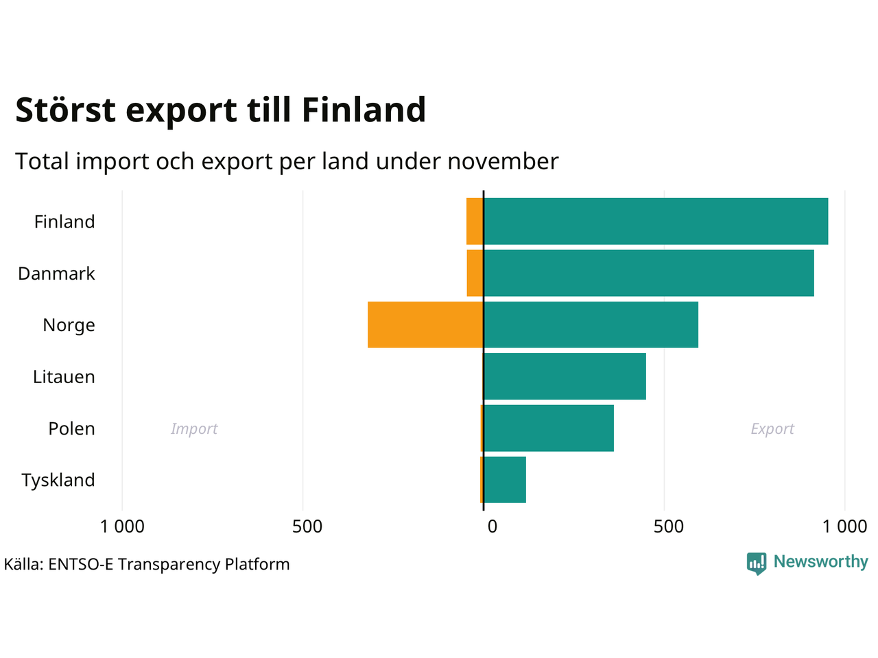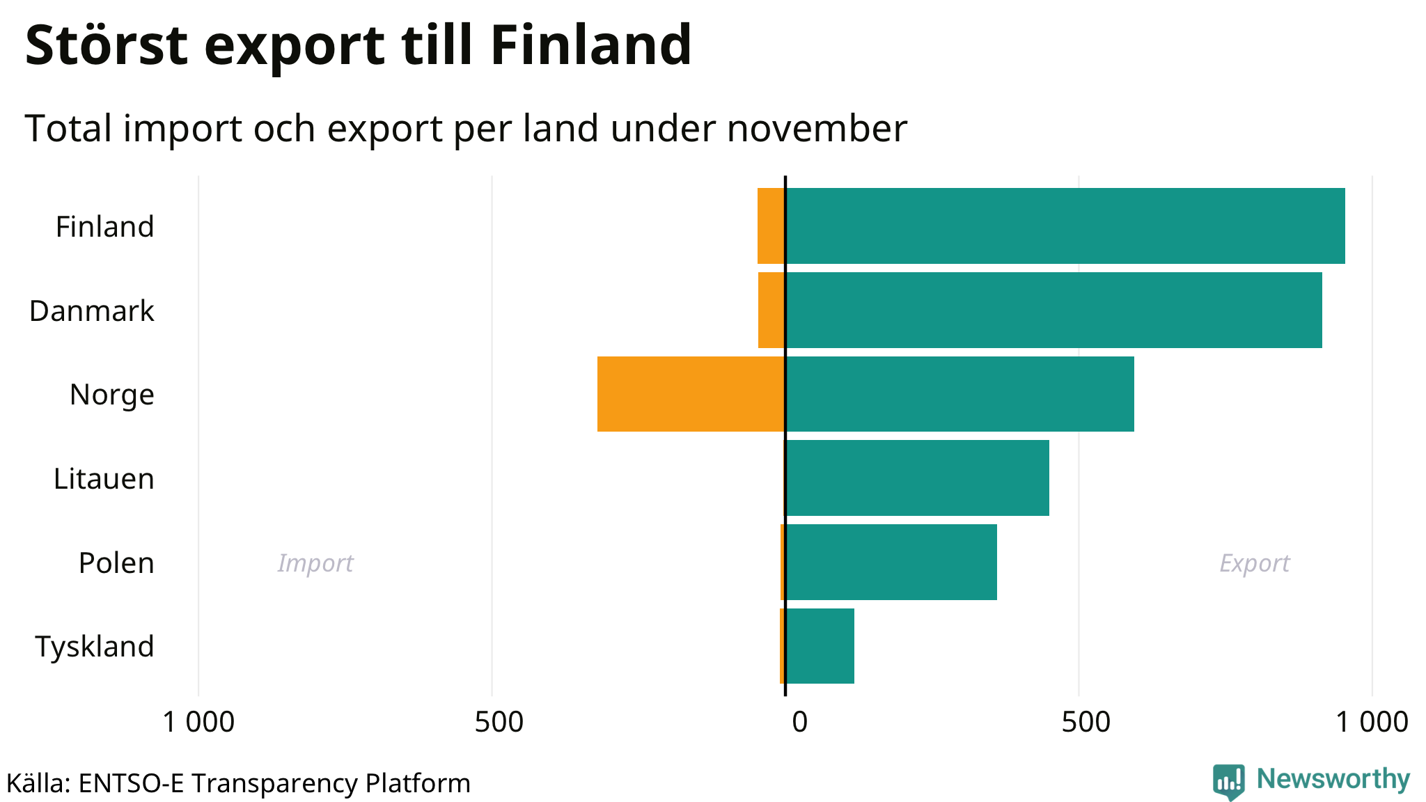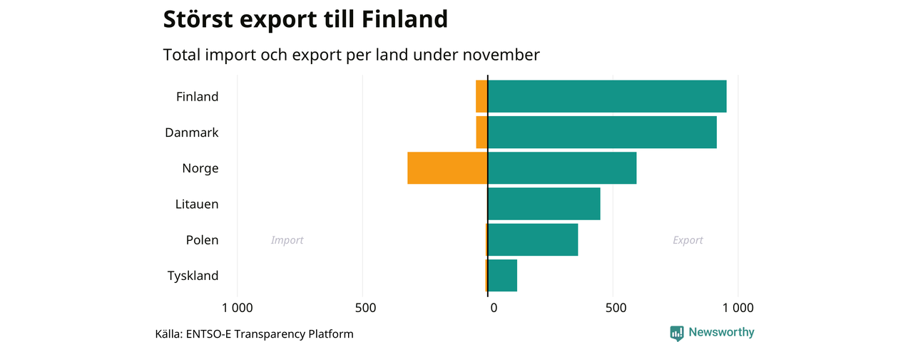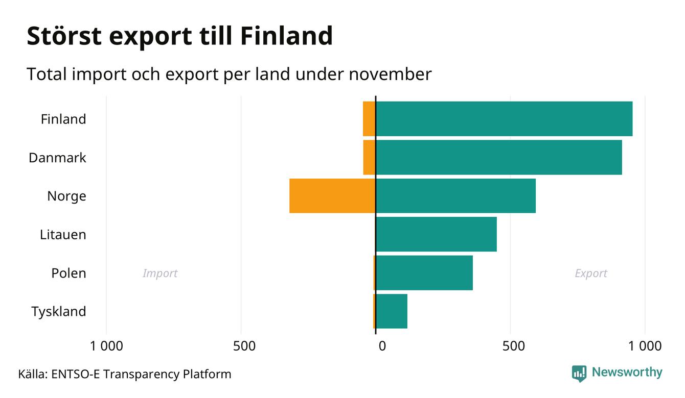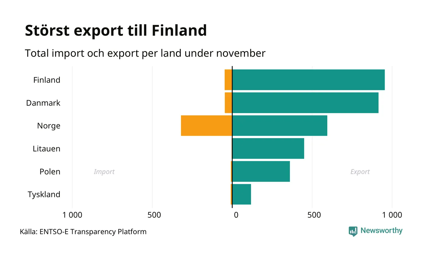 Under november exporterade Sverige mest el till Finland, medan den största importen kom från Norge.