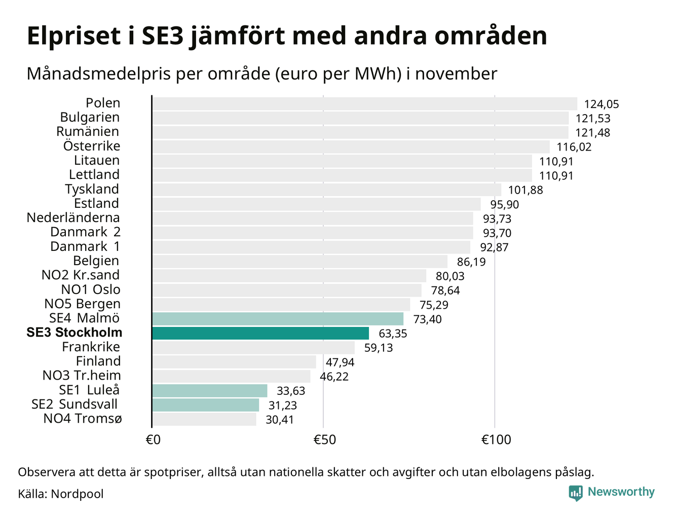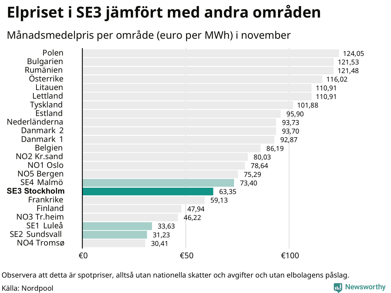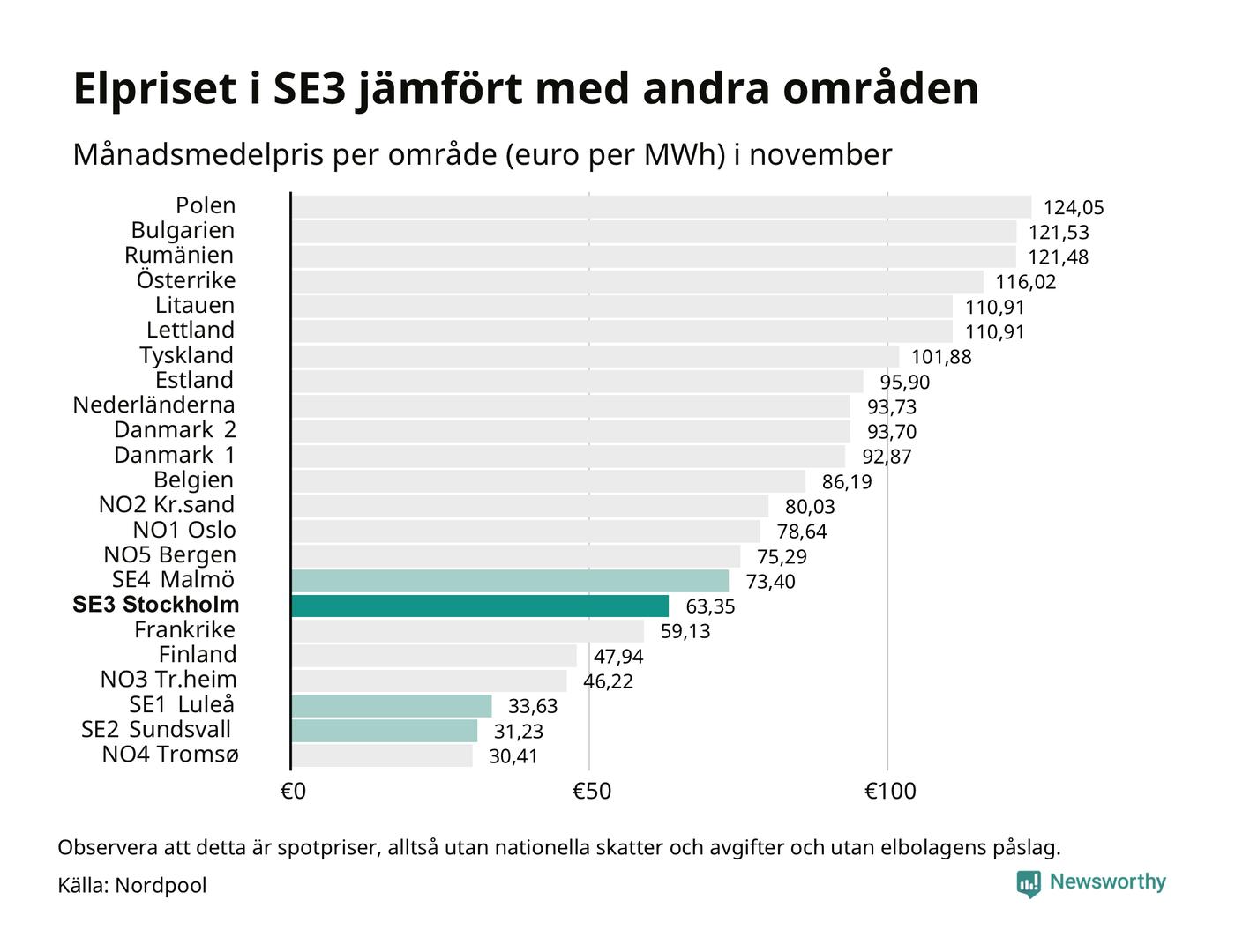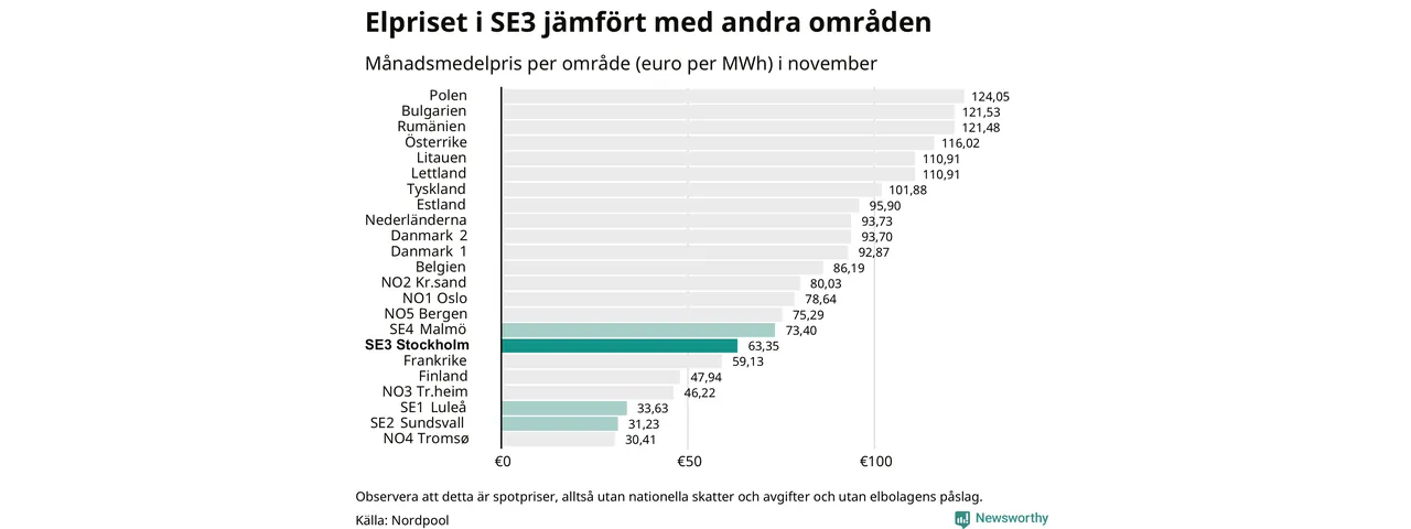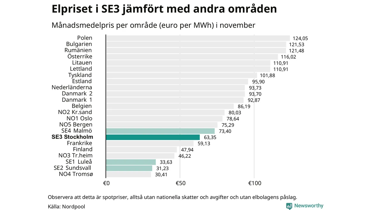 Om man tittar på månadsmedelpriset brukar de svenska elområdena oftast tillhöra de med lägst spotpriser i en europeisk jämförelse. Värt att notera är att detta handlar om spotpriser, de priser konsumenten sedan betalar beror på nationella avgifter och skatter samt elbolagens påslag. I praktiken ligger de svenska konsumentpriserna närmare det europeiska snittet efter skatter och påslag.