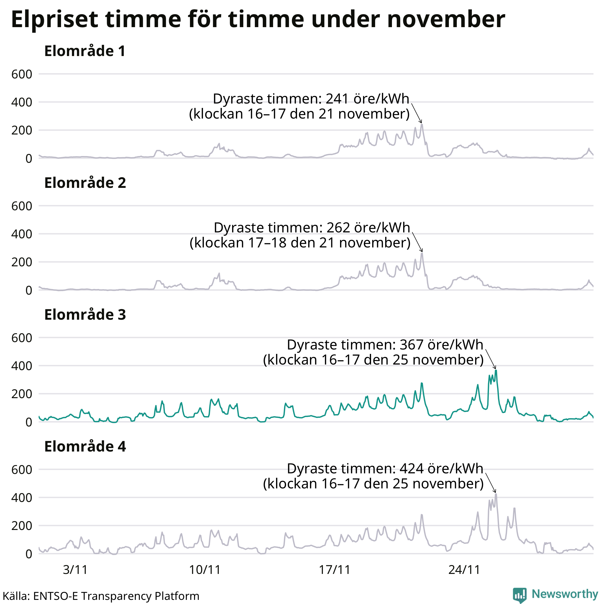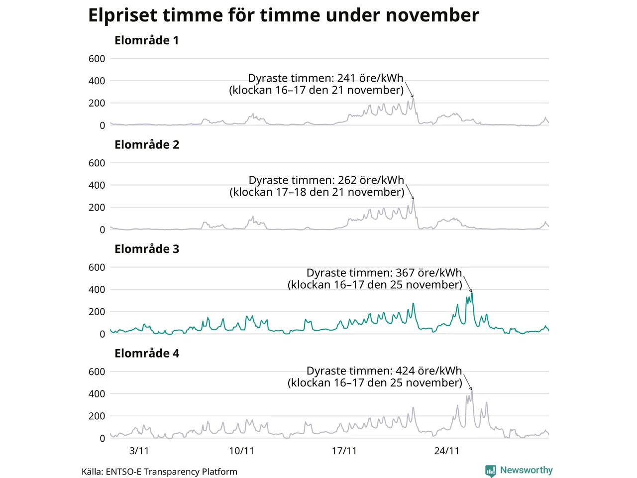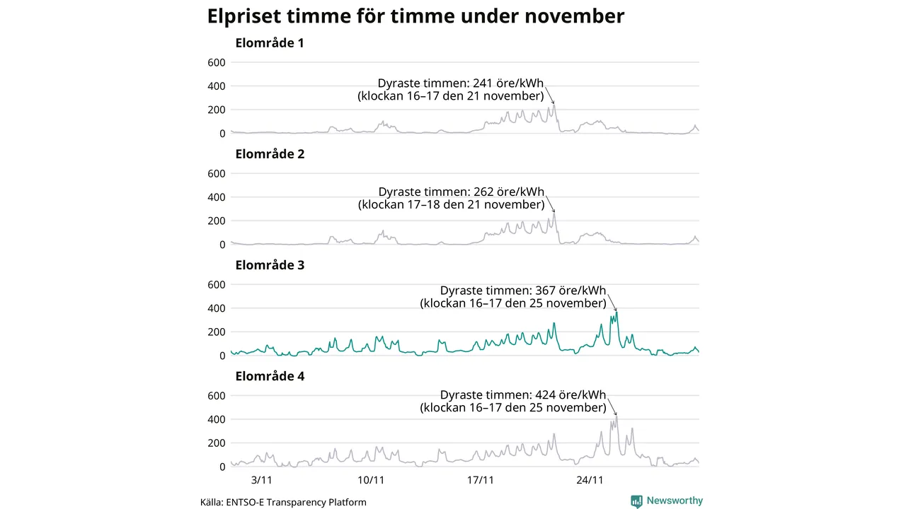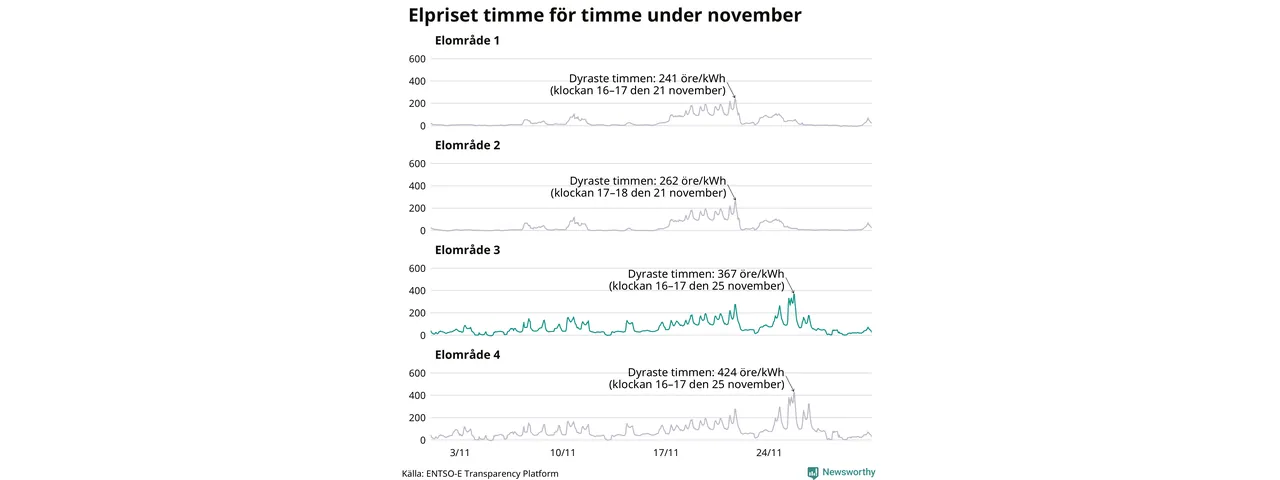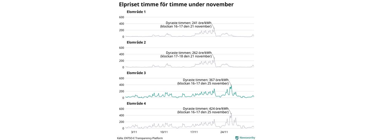 Det är inte bara prisskillnaderna mellan prisområdena som har ökat de senaste åren, även inom områdena pendlar priserna mer över tid. Sedan oktober sätts priserna varje kvart. Dyraste timmen i november i Sunne inträffade mellan klockan 15 och 16 den 25 november, då kostade en kilowattimme i snitt 367 öre. Som lägst var snittpriset per timme i området −4 öre. Under november var timpriset negativt under 11 timmar. Negativa timpriser har noterats varje månad under det senaste året.