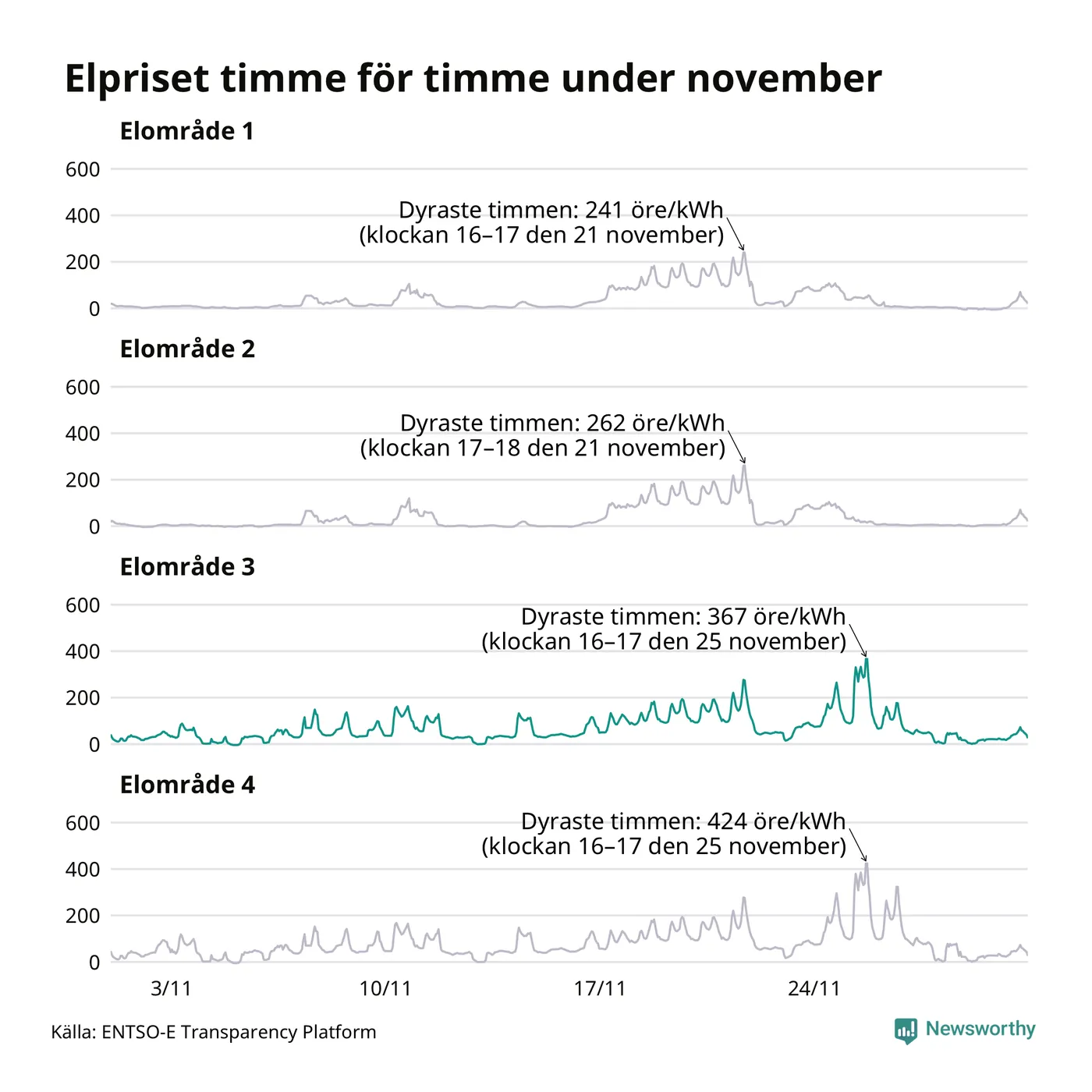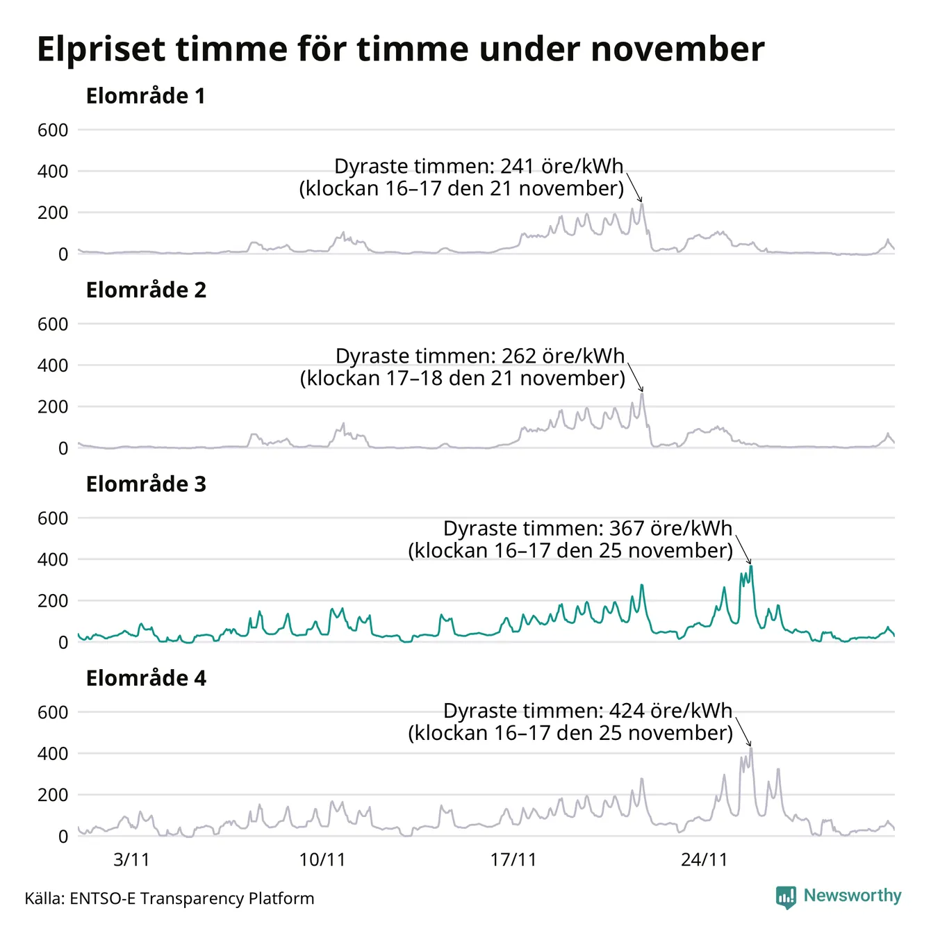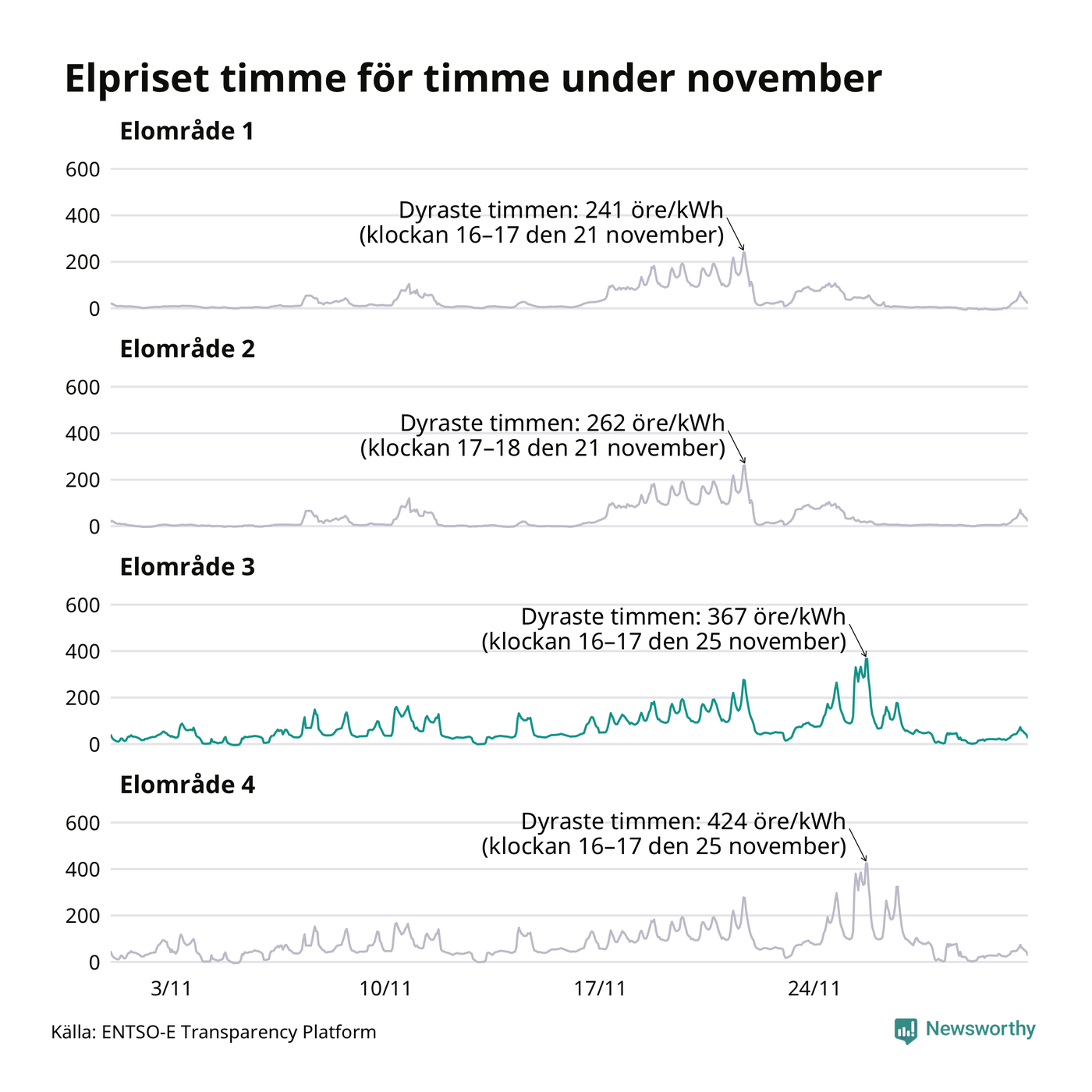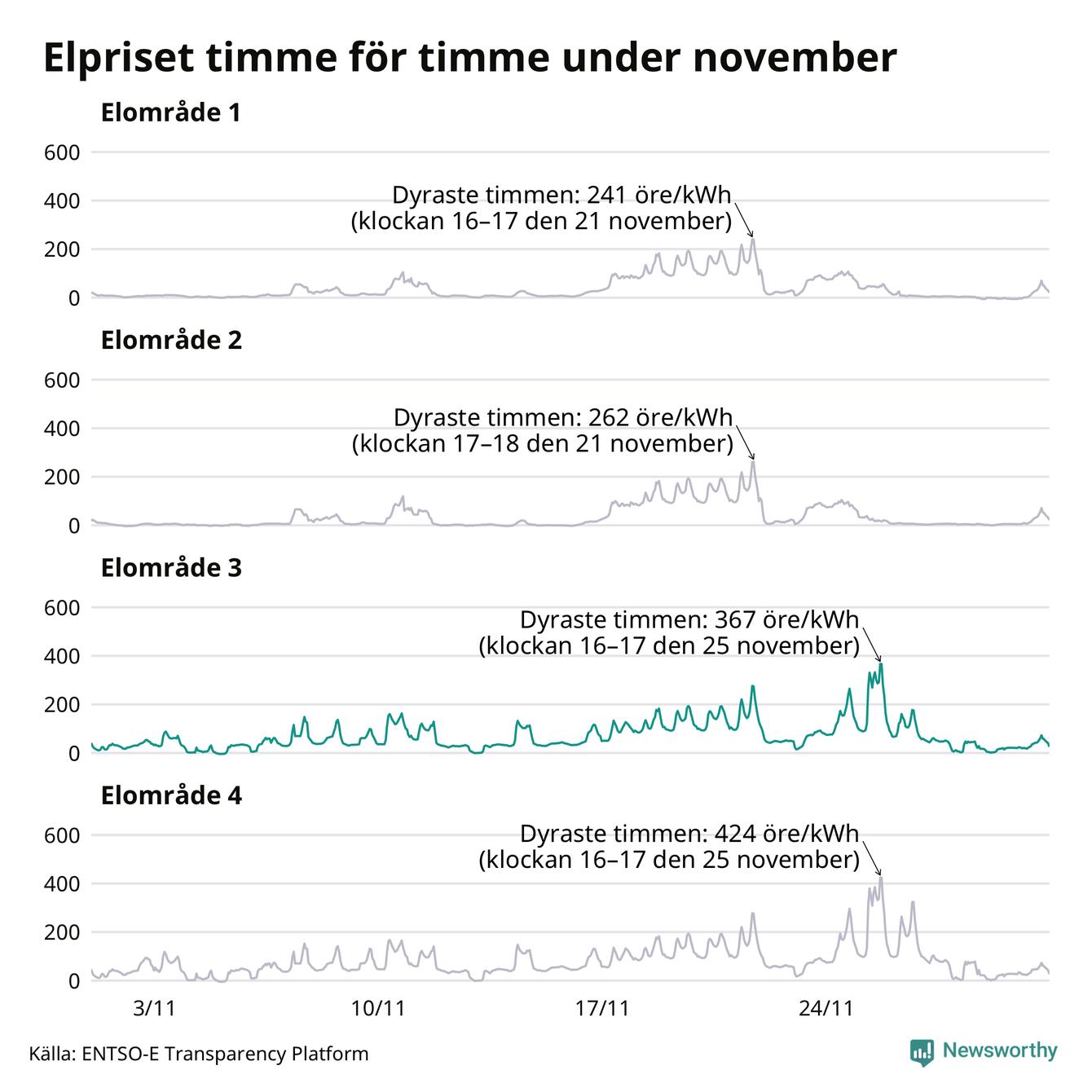 Det är inte bara prisskillnaderna mellan prisområdena som har ökat de senaste åren, även inom områdena pendlar priserna mer över tid. Sedan oktober sätts priserna varje kvart. Dyraste timmen i november i Sunne inträffade mellan klockan 15 och 16 den 25 november, då kostade en kilowattimme i snitt 367 öre. Som lägst var snittpriset per timme i området −4 öre. Under november var timpriset negativt under 11 timmar. Negativa timpriser har noterats varje månad under det senaste året.
