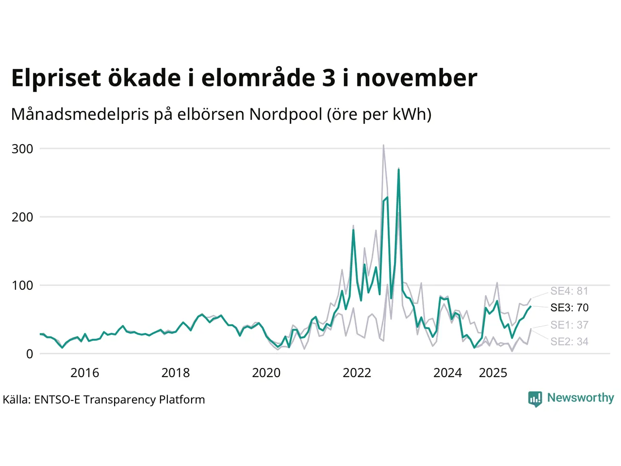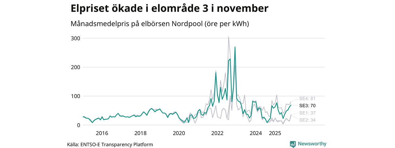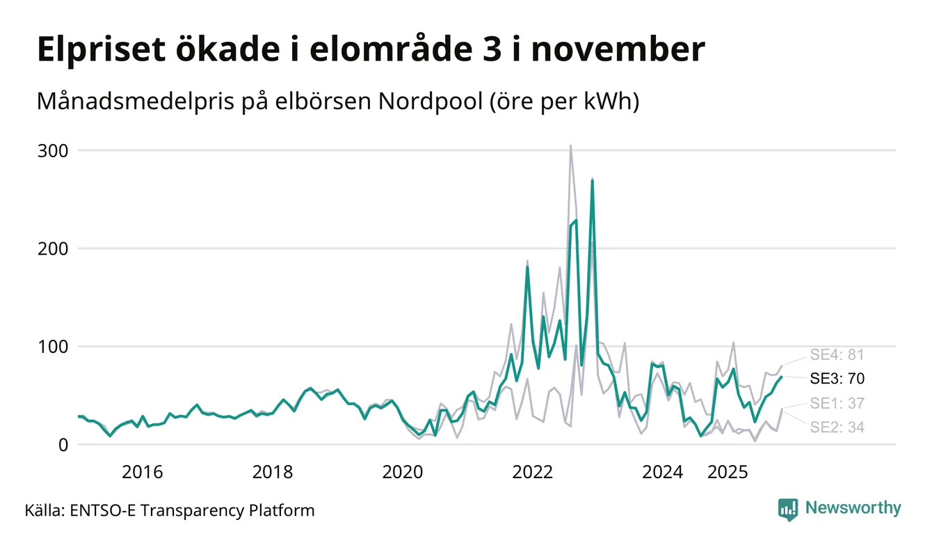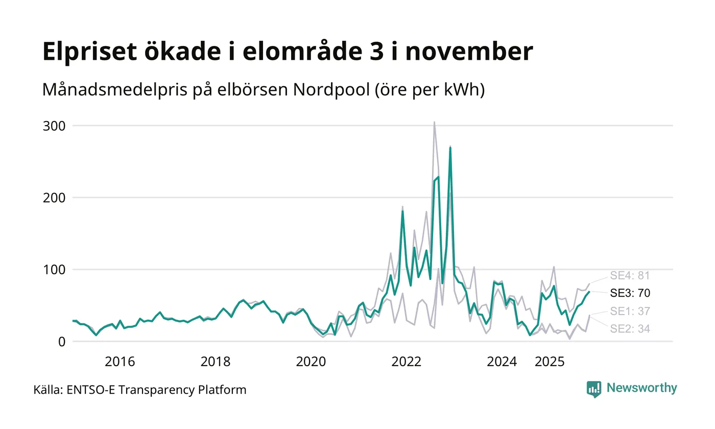 Spotpriset – alltså priset som elbolagen köper in elen för – gick upp i november i elområde 3 som Sunne tillhör. Månadspriset var 70 öre per kilowattimme, vilket är 7 öre dyrare än i oktober. Det högsta priset i elområdet hittills noterades i december 2022, då en kilowattimme kostade 269 öre. För ett år sedan – i november 2024 – kostade en kilowattimme 67 öre.
