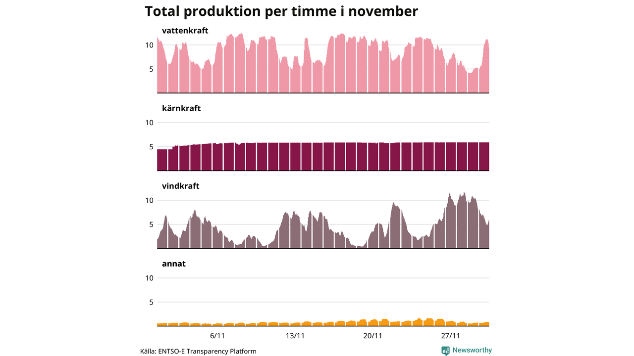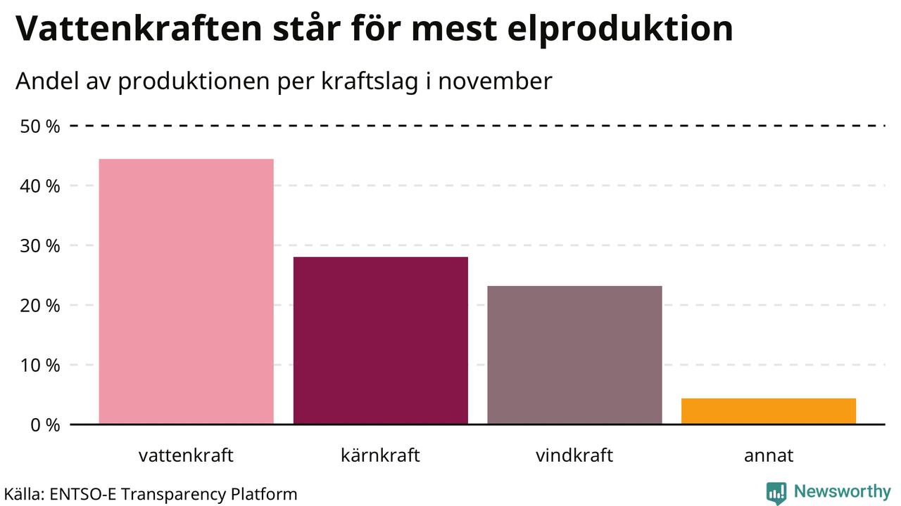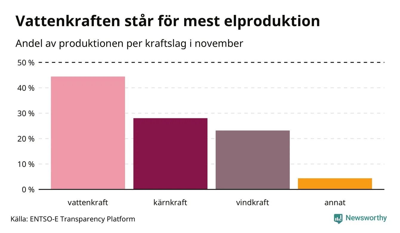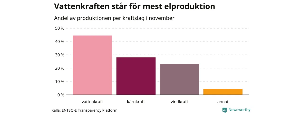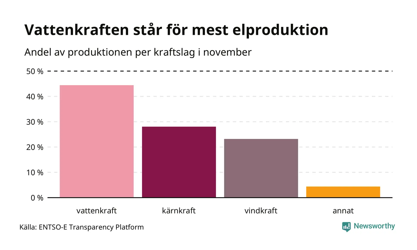 Enligt de preliminära siffrorna kom ungefär 44 procent av elproduktionen under november från vattenkraft, ungefär 28 procent från kärnkraft och runt 23 procent från vindkraft.