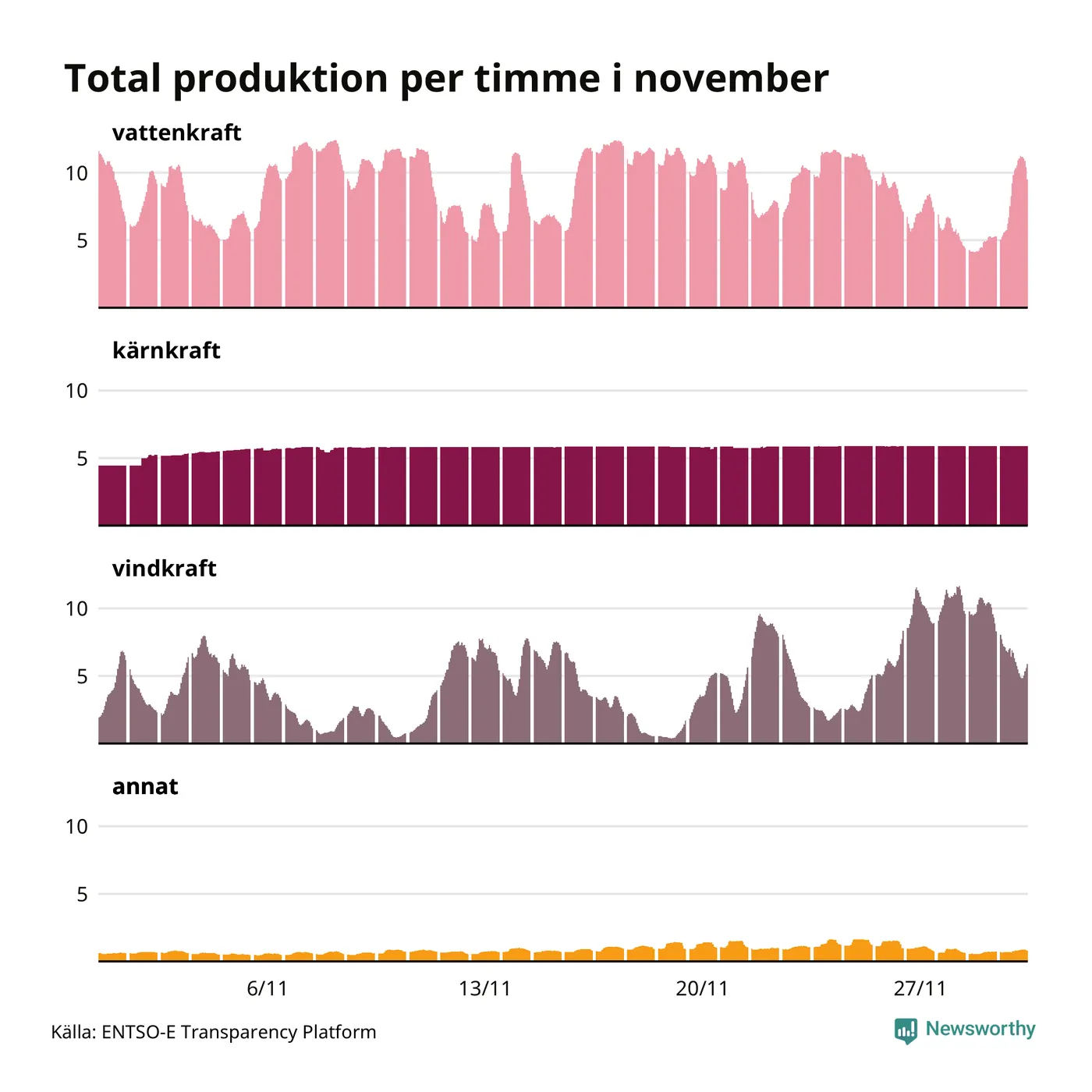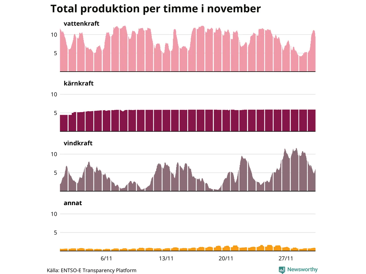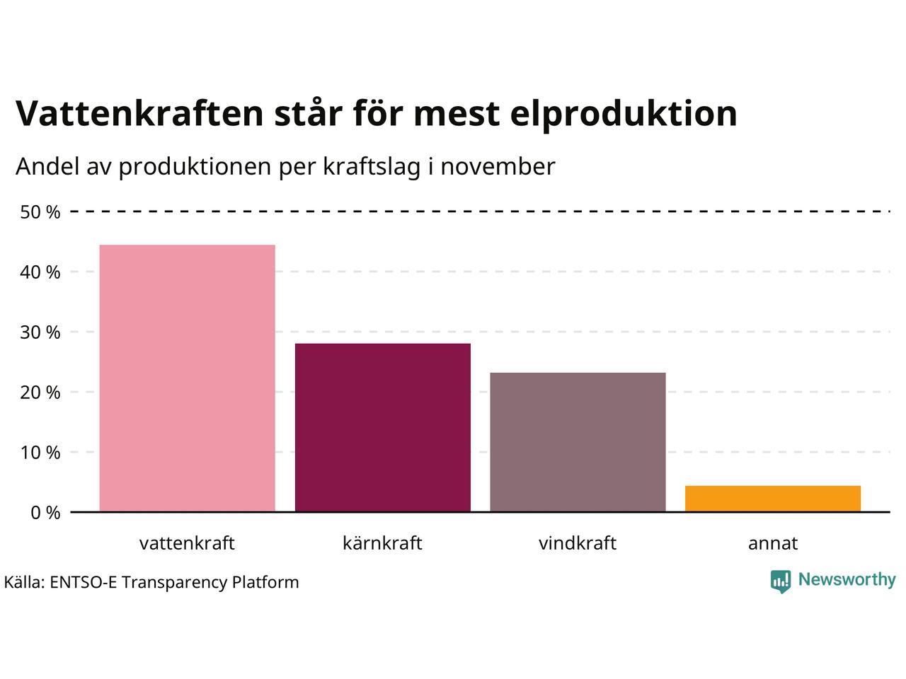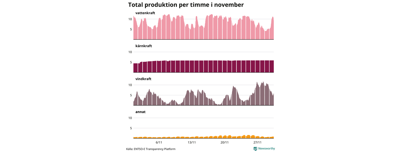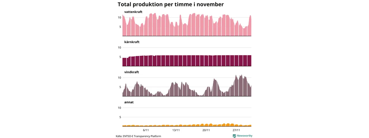 Enligt de preliminära siffrorna kom ungefär 44 procent av elproduktionen under november från vattenkraft, ungefär 28 procent från kärnkraft och runt 23 procent från vindkraft.