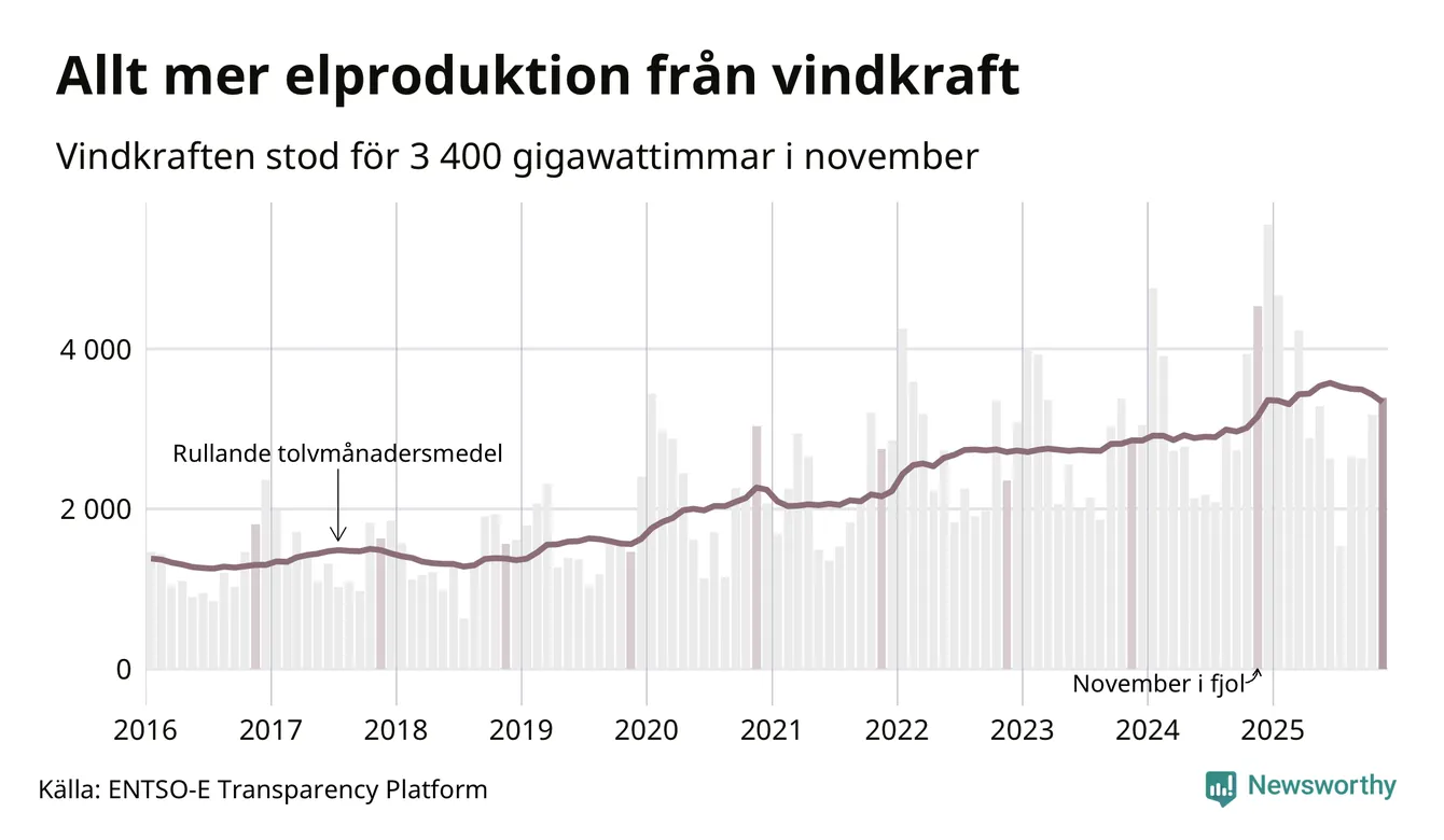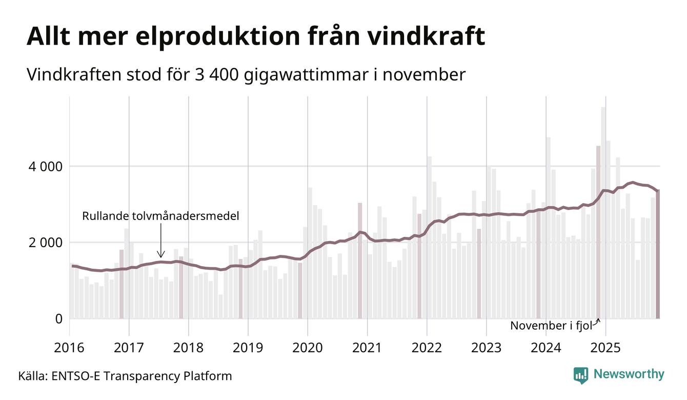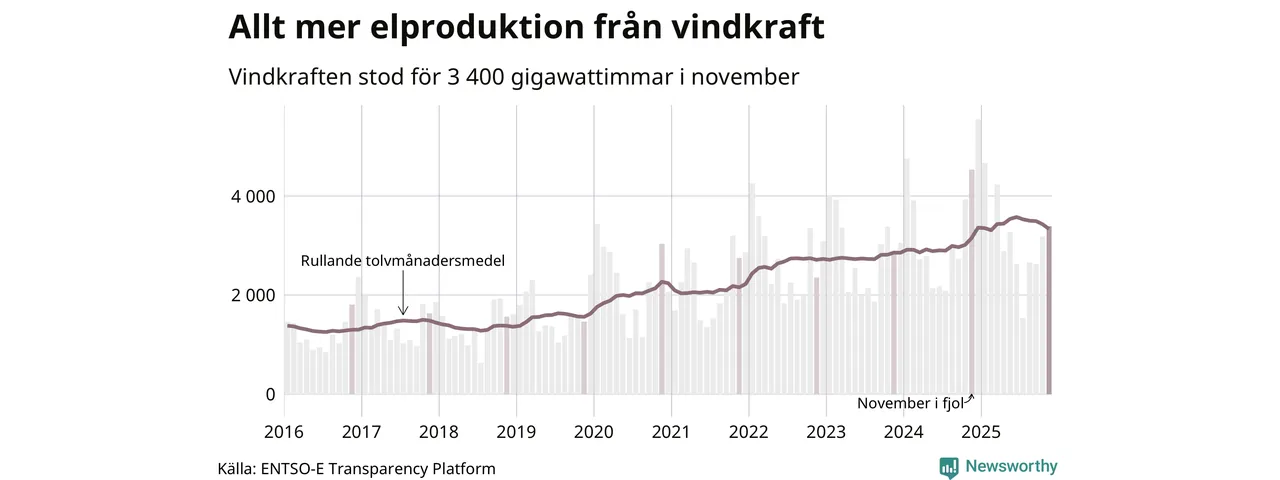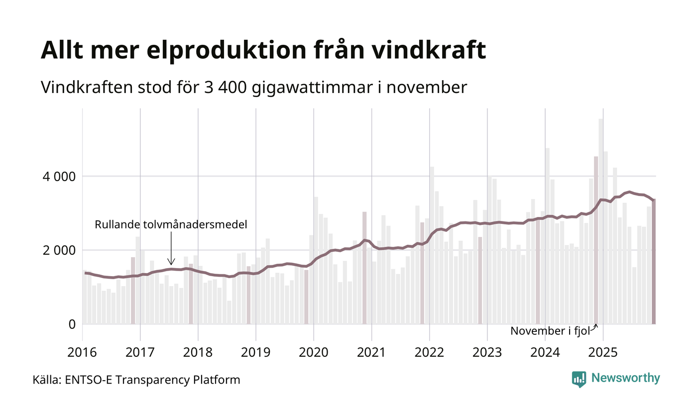 Vindkraften stod alltså för cirka 23 procent av elproduktionen i november. Det motsvarar ungefär 3 400 gigawattimmar, vilket är drygt 1 100 gigawattimmar mindre än samma månad i fjol. Sett till de senaste tolv månaderna har däremot vindkraftens produktion ökat jämfört med året innan (+6 procent). Jämfört med för fem år sedan har snittproduktionen från vindkraft ökat med nära 50 procent.