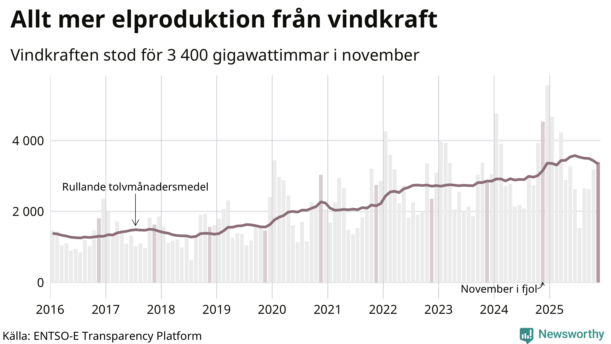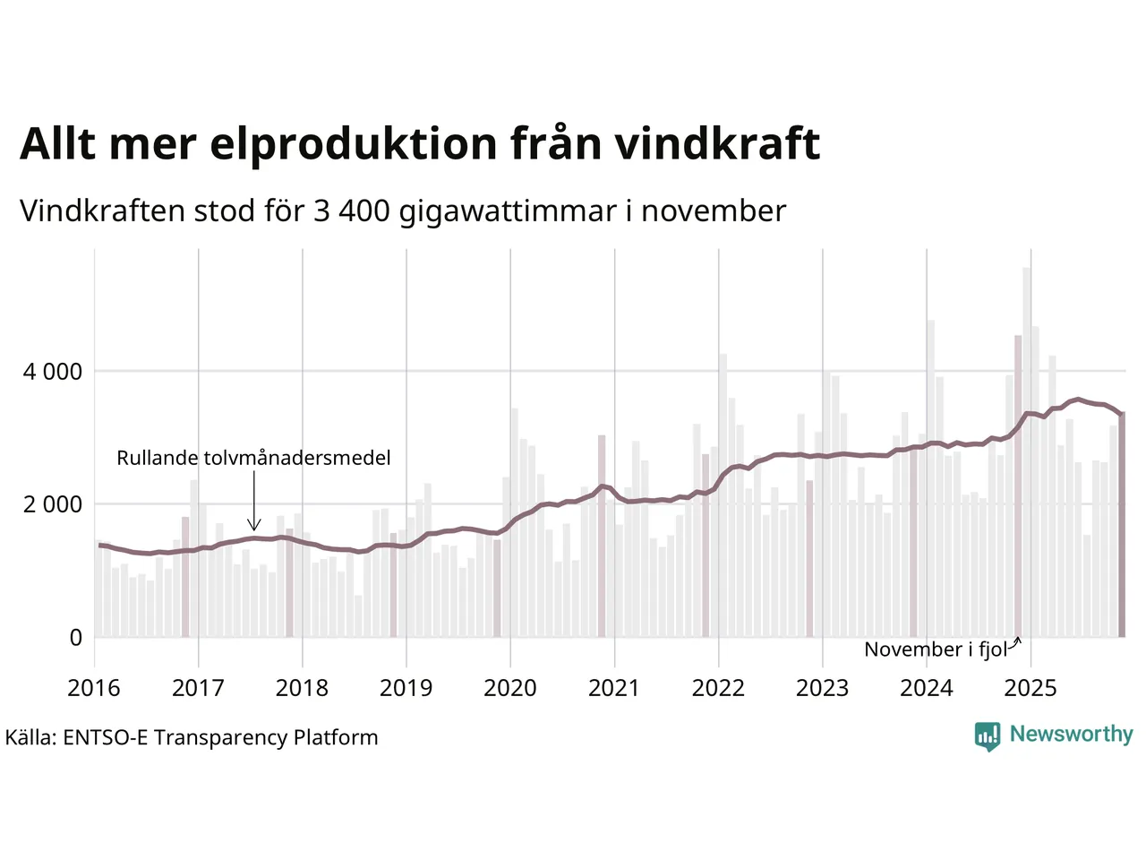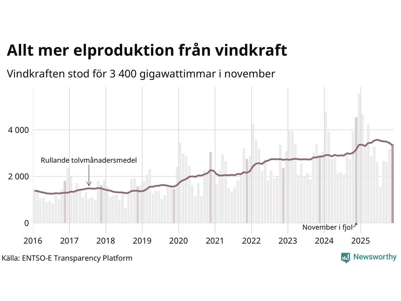Vindkraften stod alltså för cirka 23 procent av elproduktionen i november. Det motsvarar ungefär 3 400 gigawattimmar, vilket är drygt 1 100 gigawattimmar mindre än samma månad i fjol. Sett till de senaste tolv månaderna har däremot vindkraftens produktion ökat jämfört med året innan (+6 procent). Jämfört med för fem år sedan har snittproduktionen från vindkraft ökat med nära 50 procent.