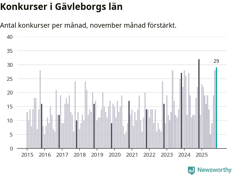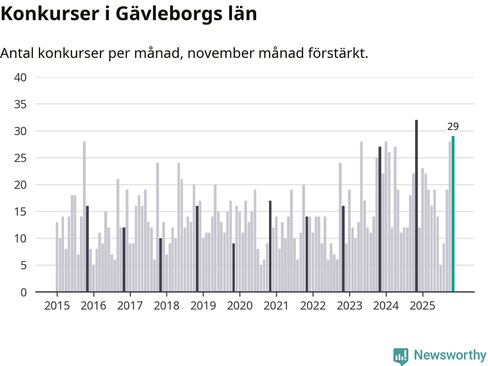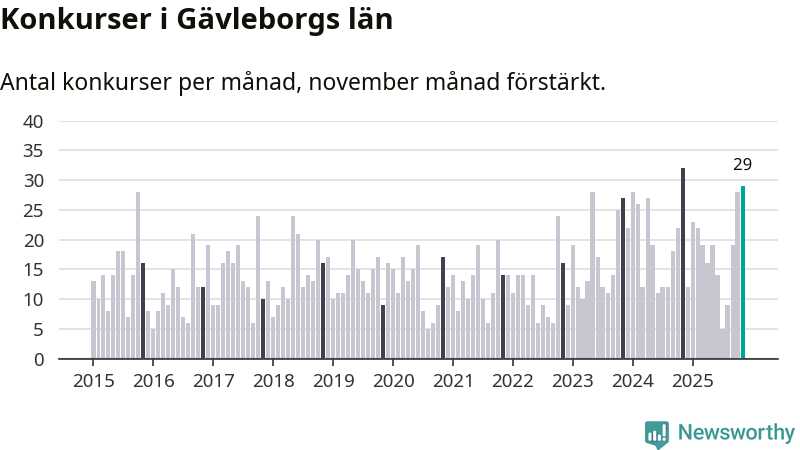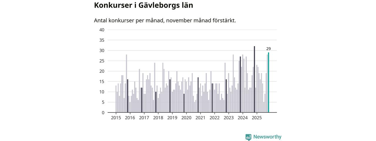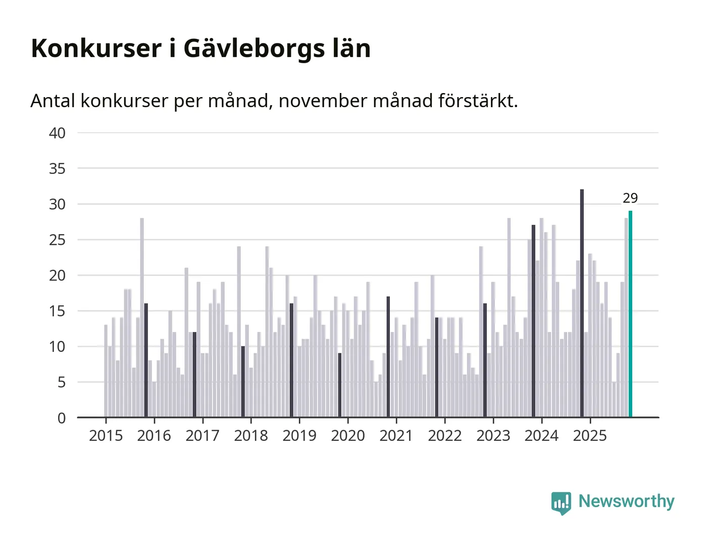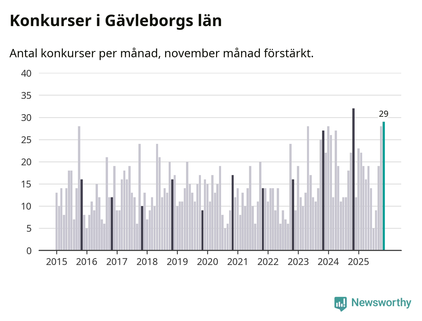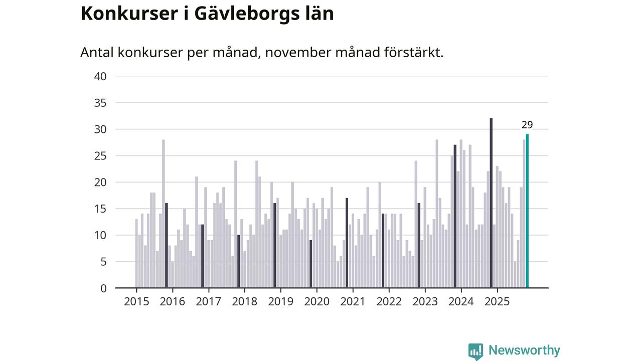 Under november månad gick 29 bolag i konkurs i Gävleborg. Det är fler än normalt för den här tiden på året sett till de senaste tio åren, men samtidigt något färre än under november månad i fjol (32 stycken då).