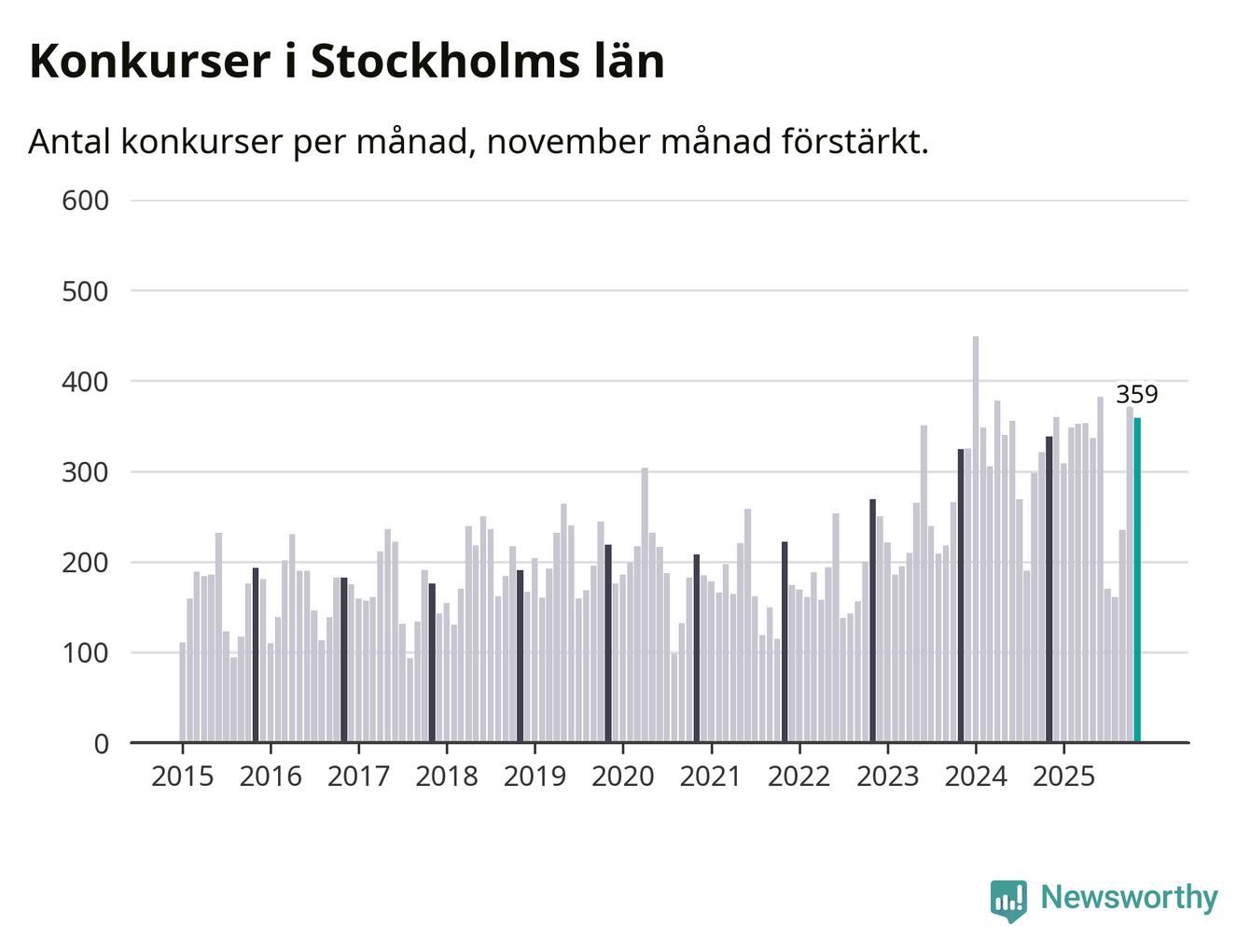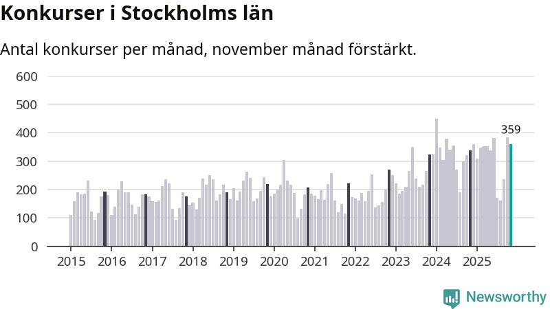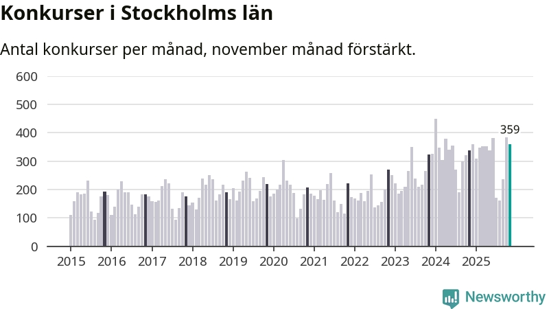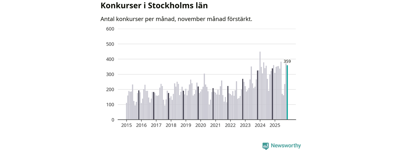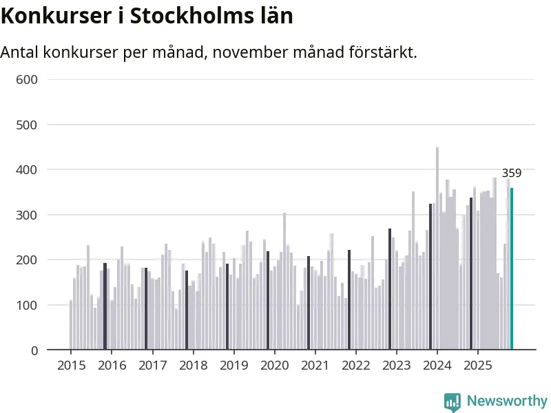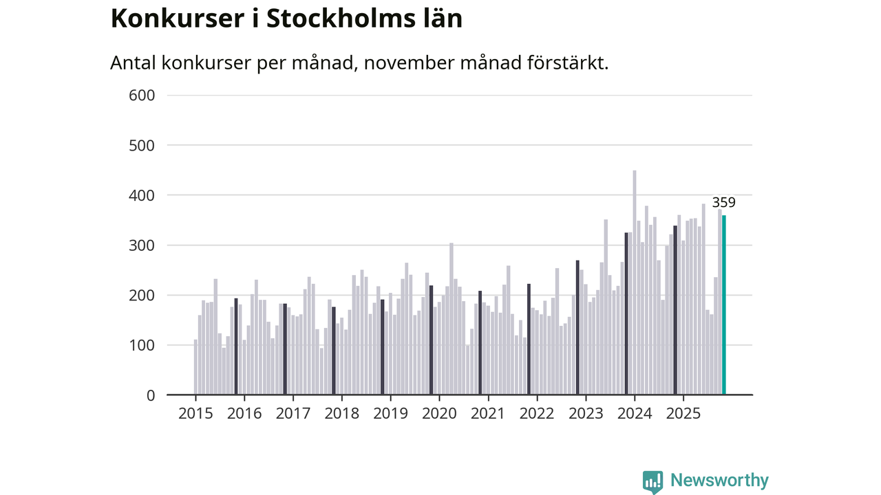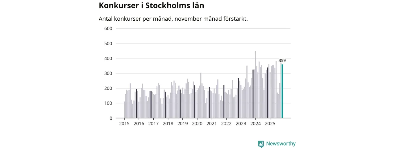 Under november månad gick 359 bolag i konkurs i Stockholms län. Det är fler än normalt för den här tiden på året sett till de senaste tio åren. I fjol noterades 338 konkurser under november.