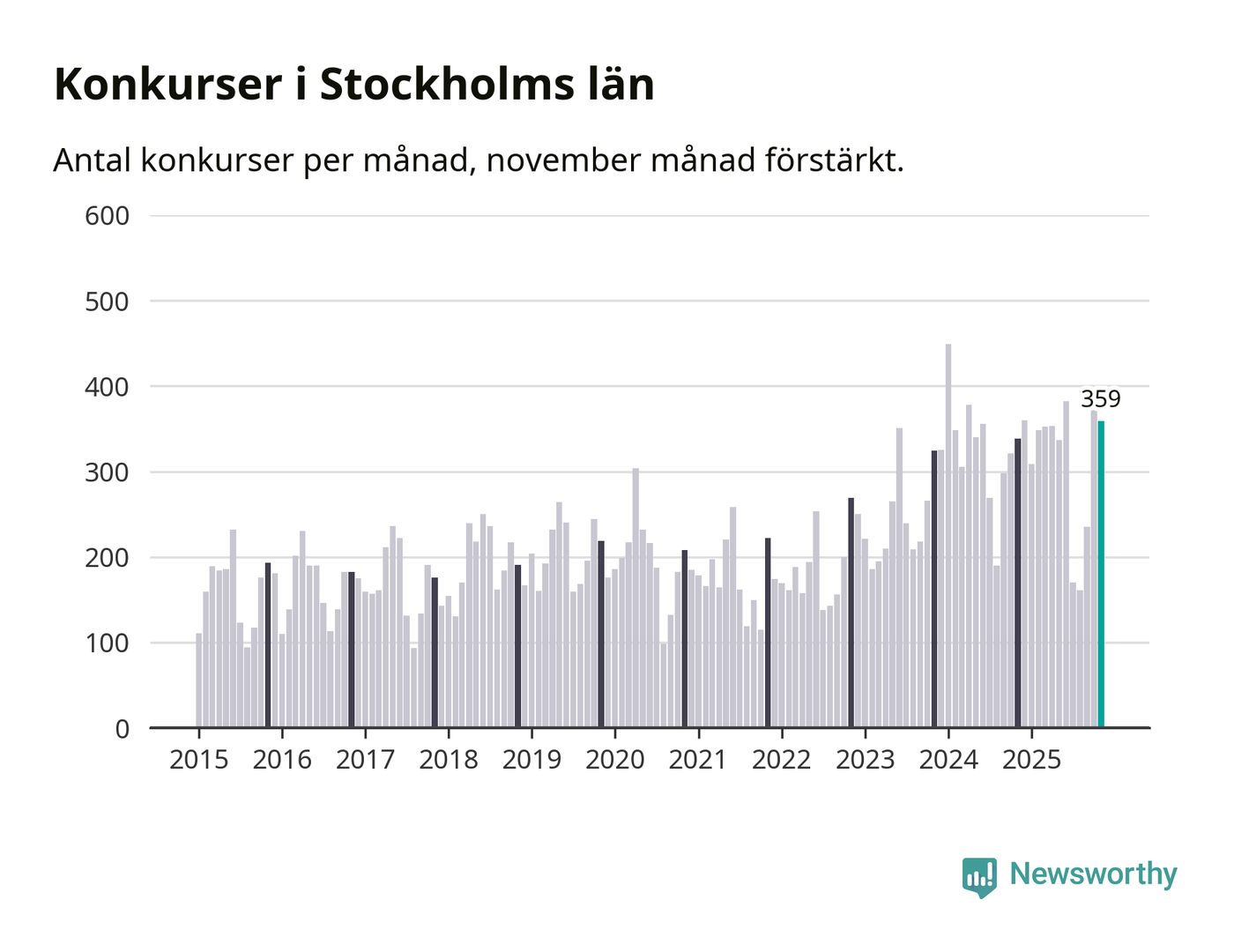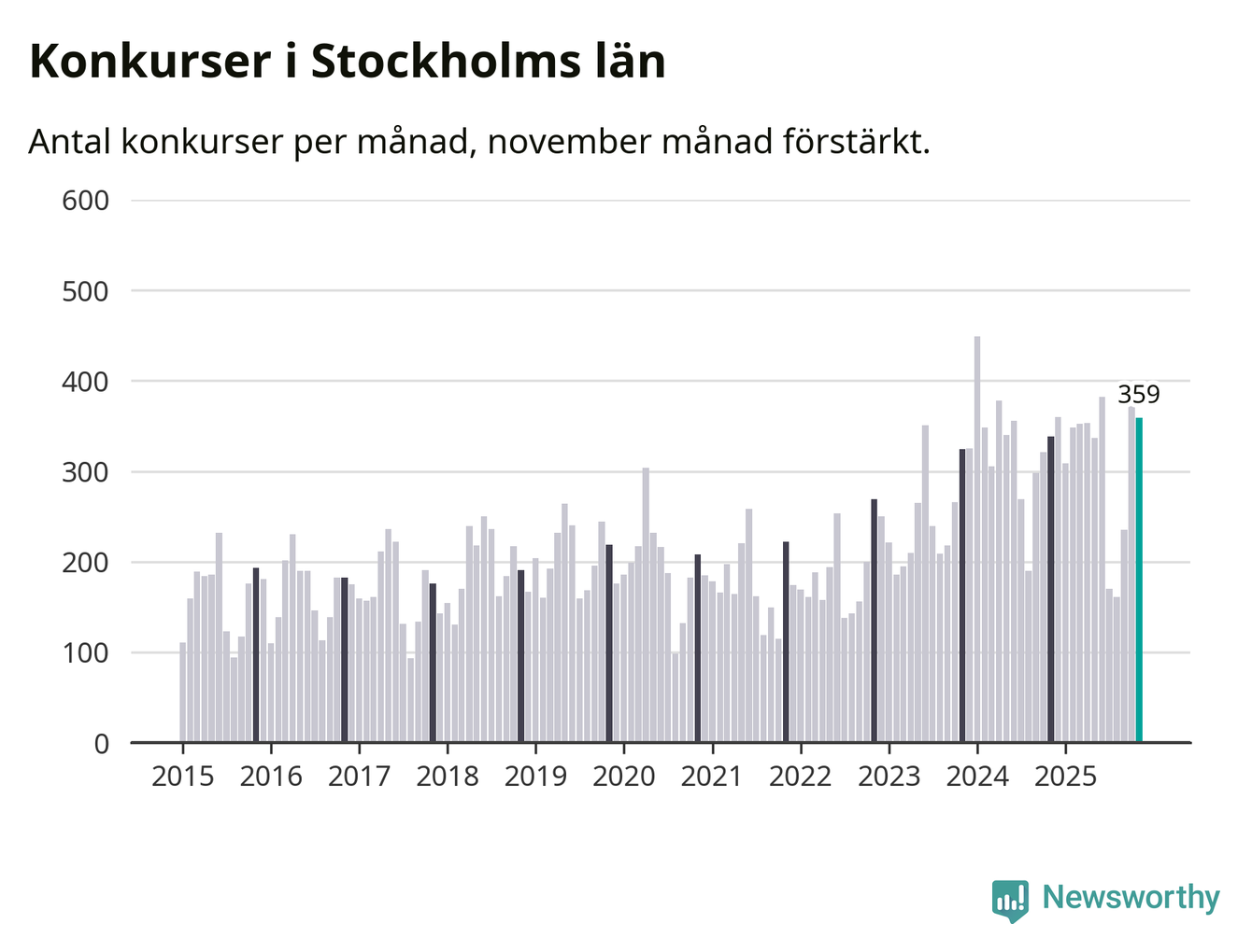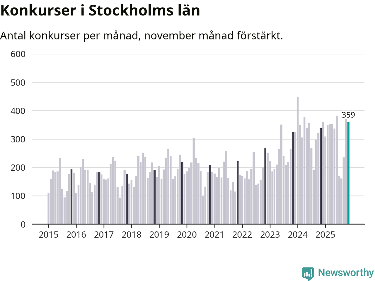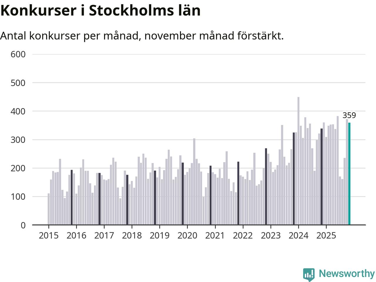 Under november månad gick 359 bolag i konkurs i Stockholms län. Det är fler än normalt för den här tiden på året sett till de senaste tio åren. I fjol noterades 338 konkurser under november.
