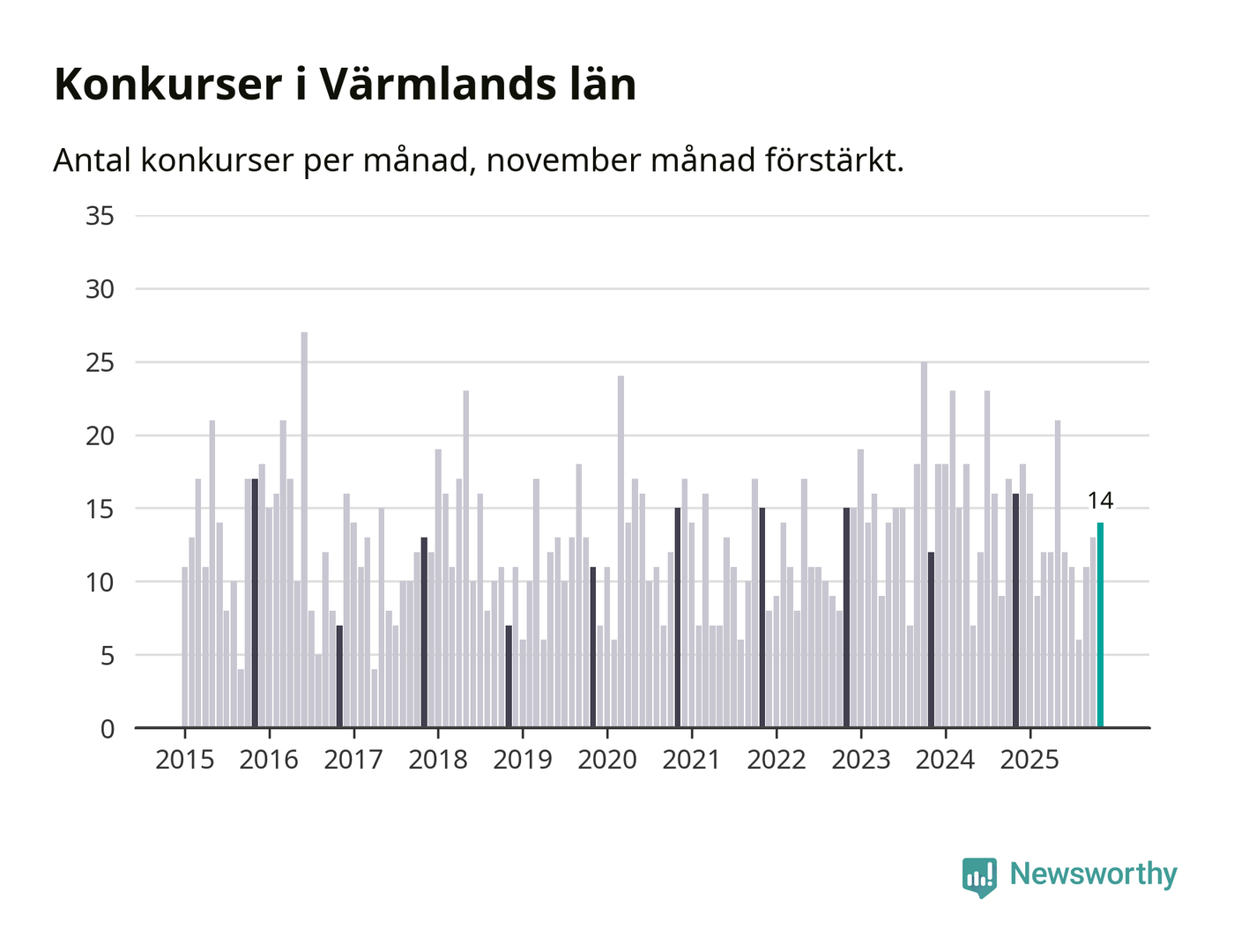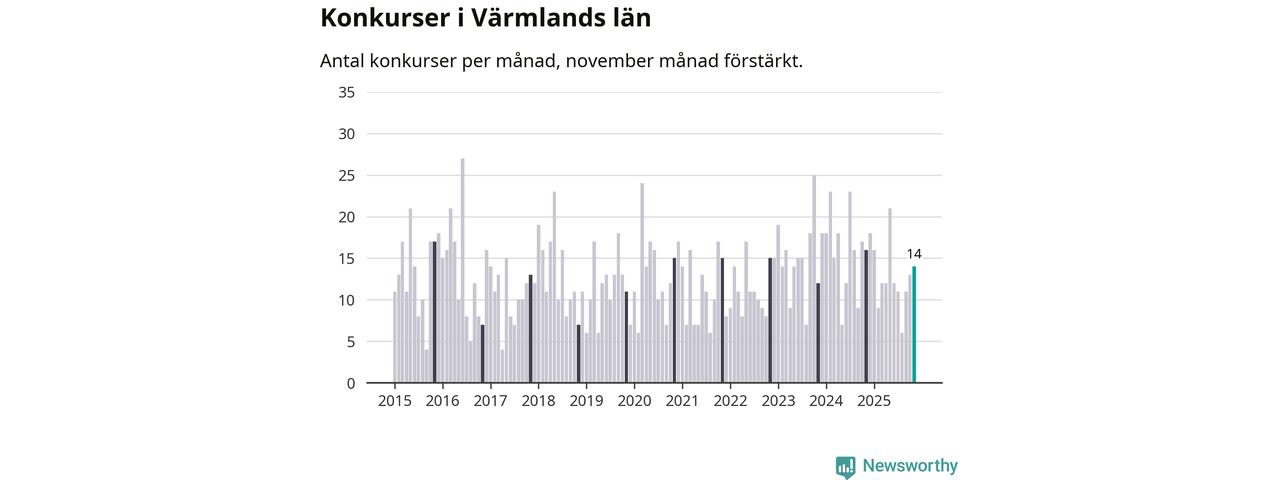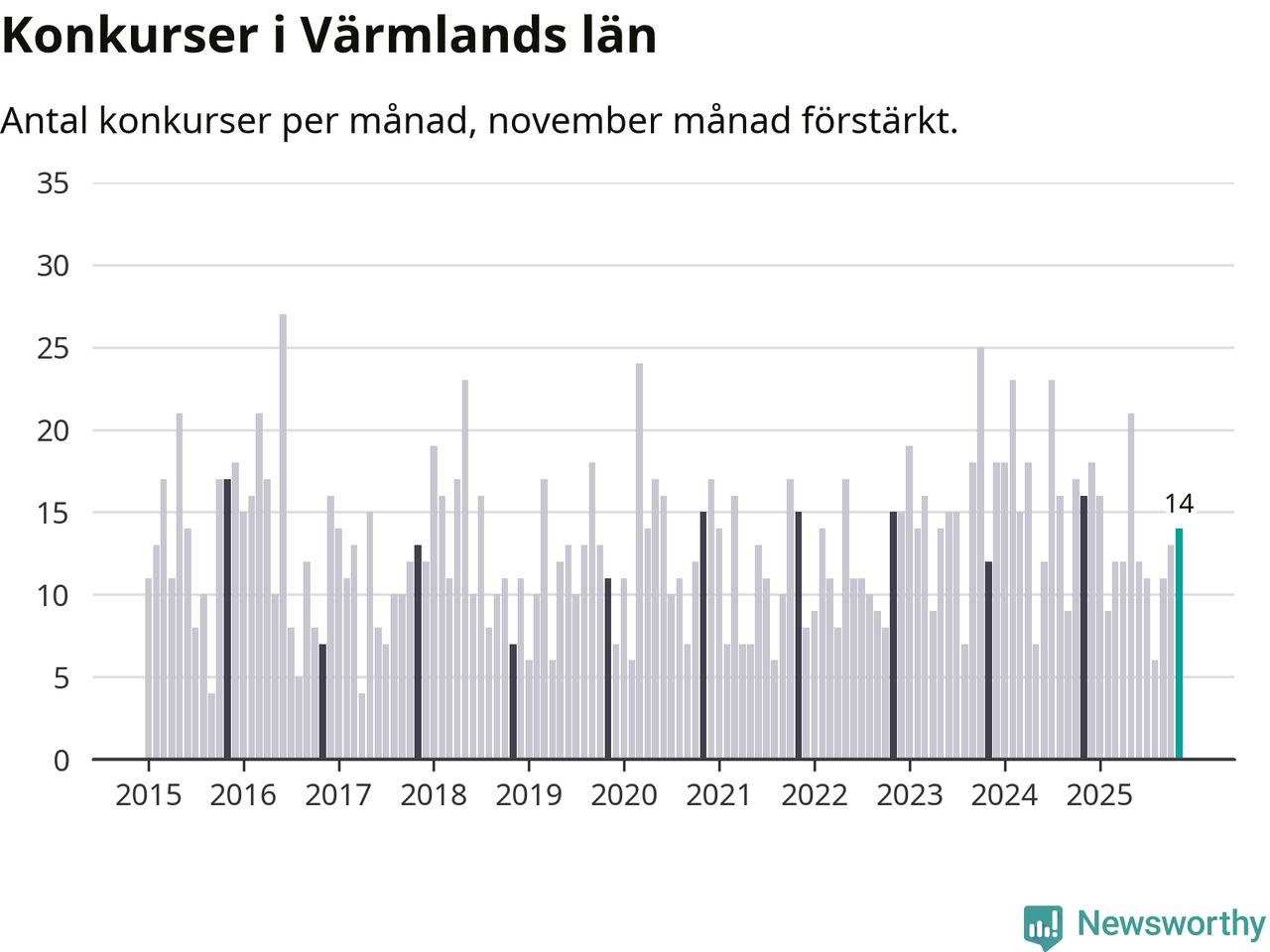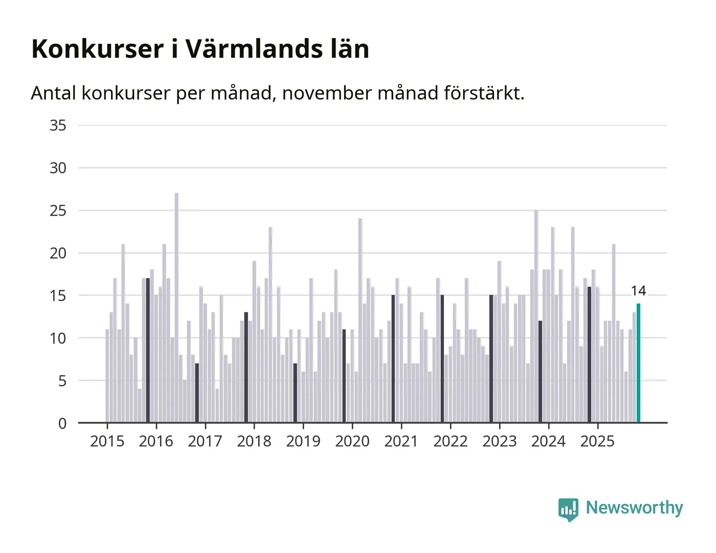Under november månad gick 14 bolag i konkurs i Värmland. Det är en tämligen normal nivå för den här tiden på året. I fjol noterades 16 konkurser under november.