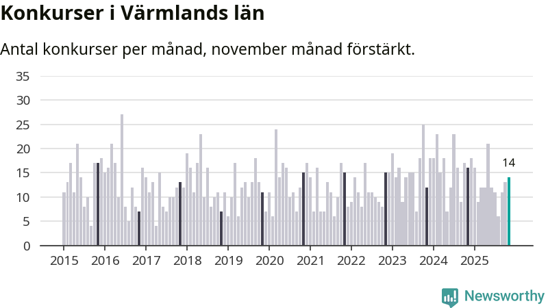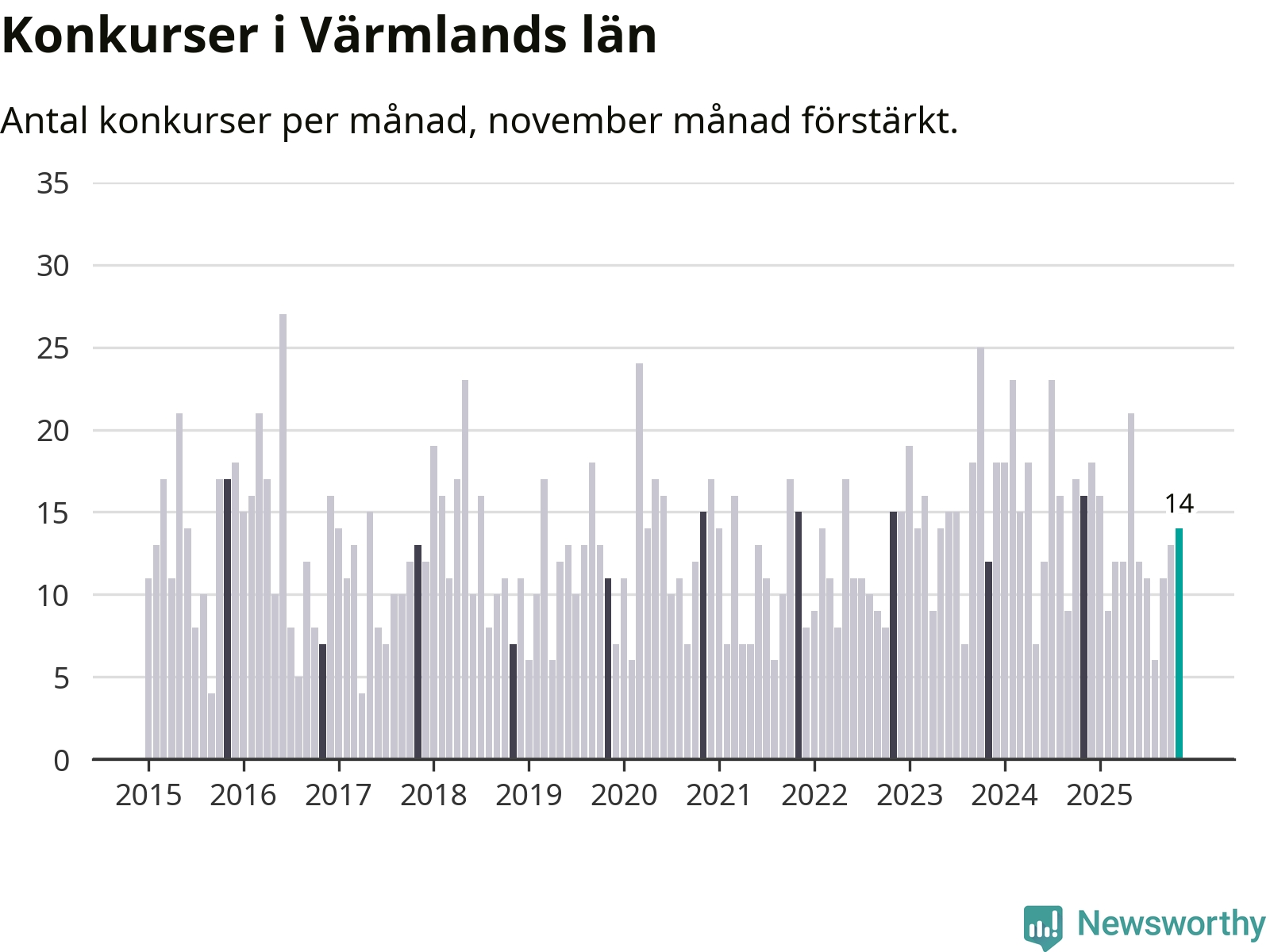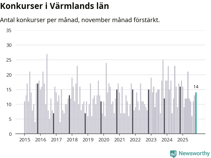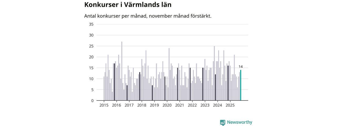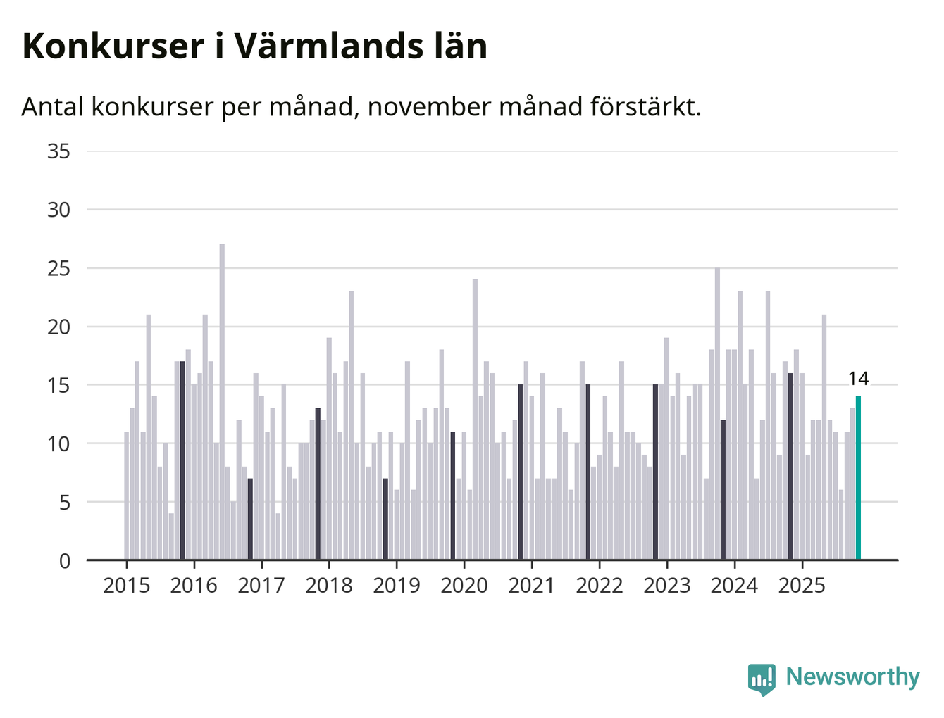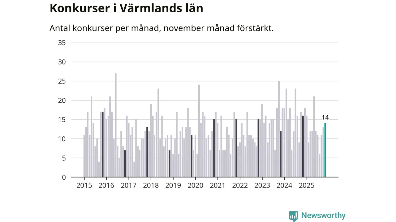 Under november månad gick 14 bolag i konkurs i Värmland. Det är en tämligen normal nivå för den här tiden på året. I fjol noterades 16 konkurser under november.