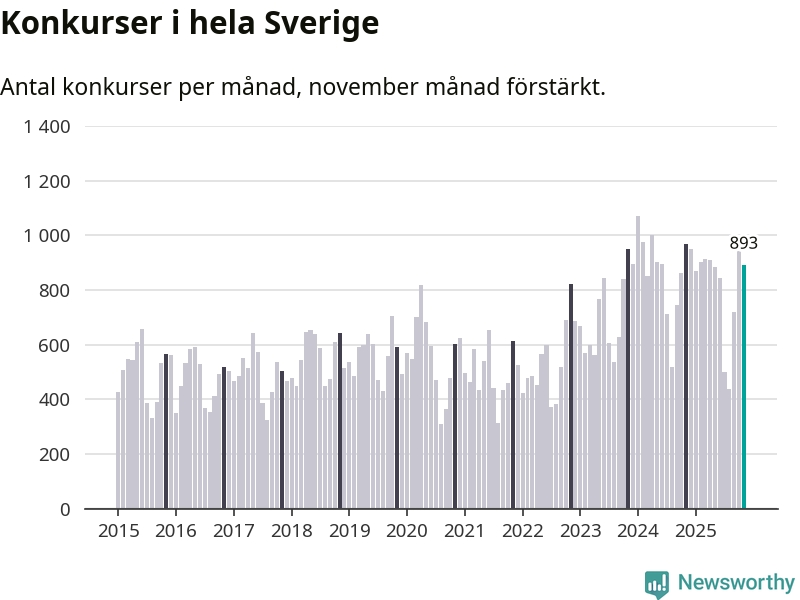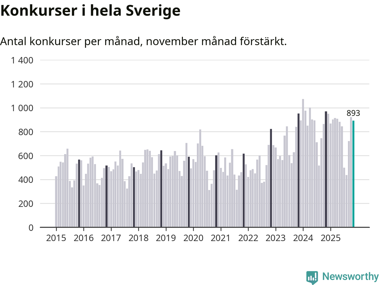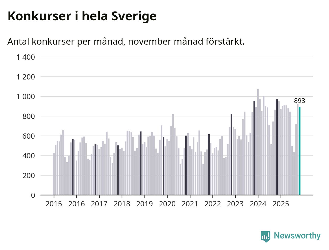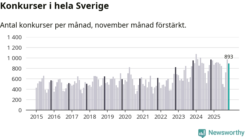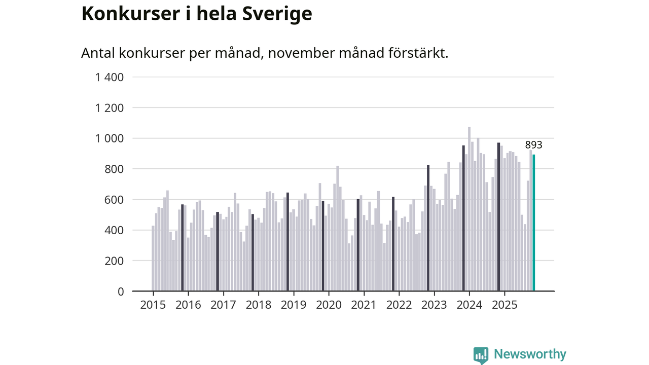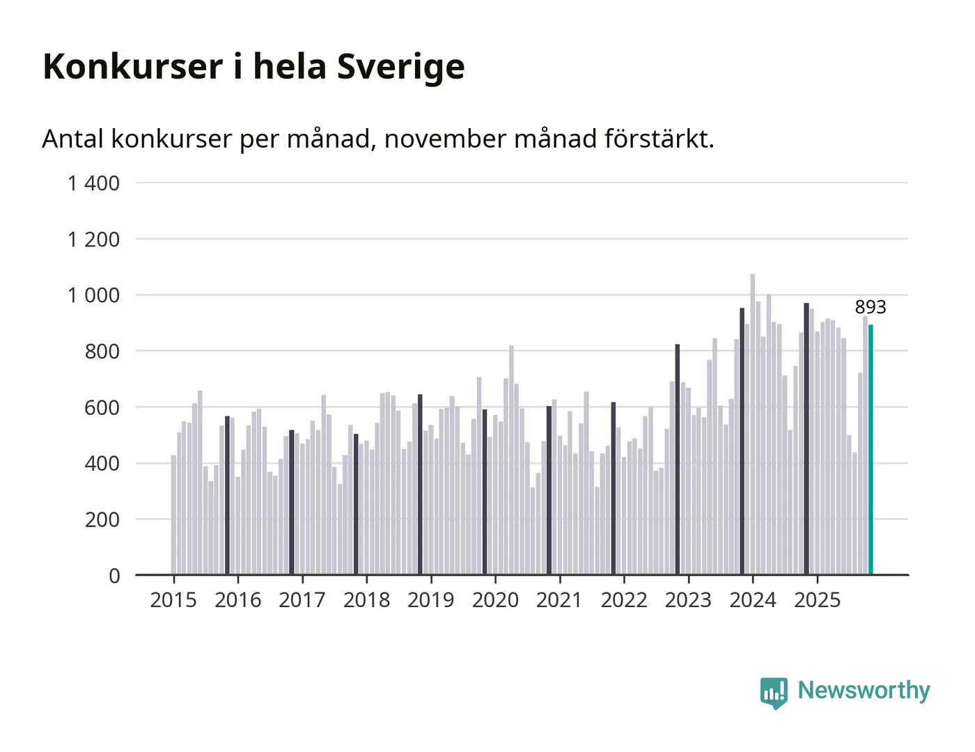 I hela Sverige gick 893 företag i konkurs i november. Det är 77 färre än vid motsvarande tid i fjol (−8 procent). Jämför vi 2025 års samlade konkurser ser vi en nedgång med −2 procent.