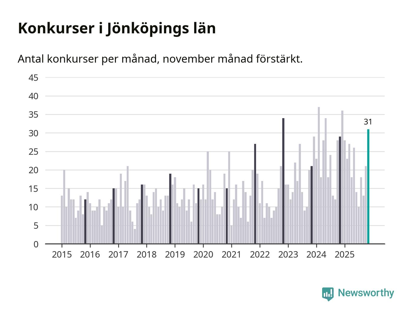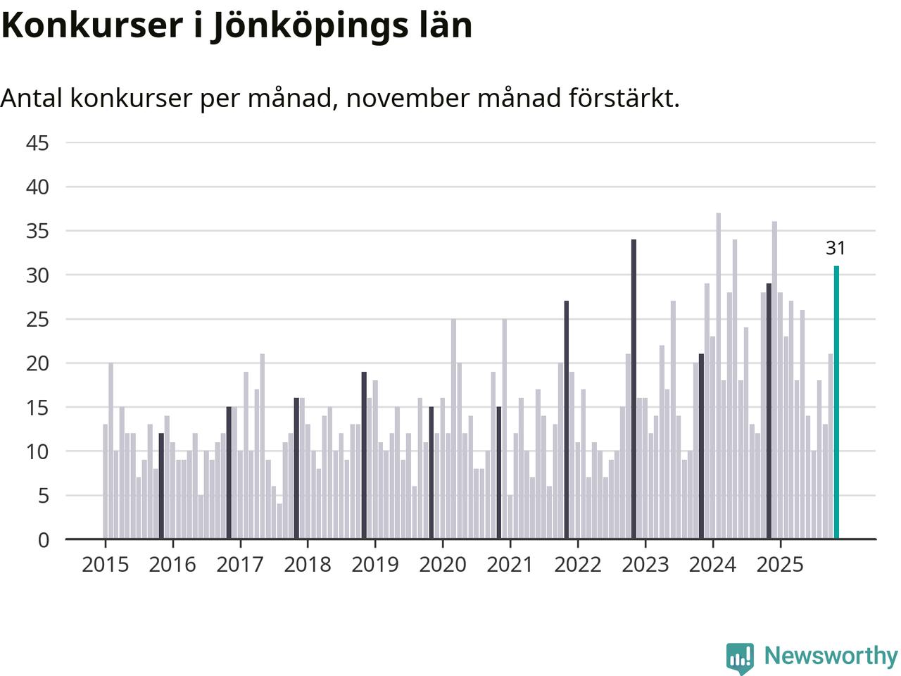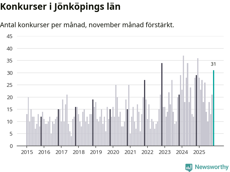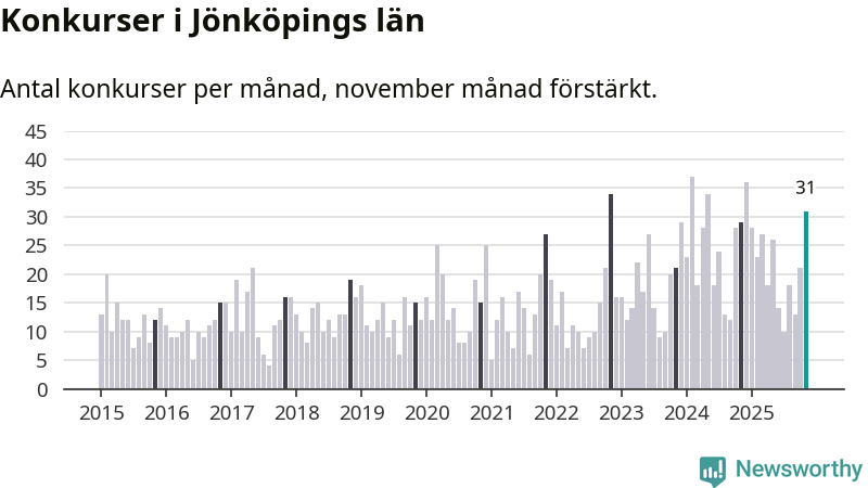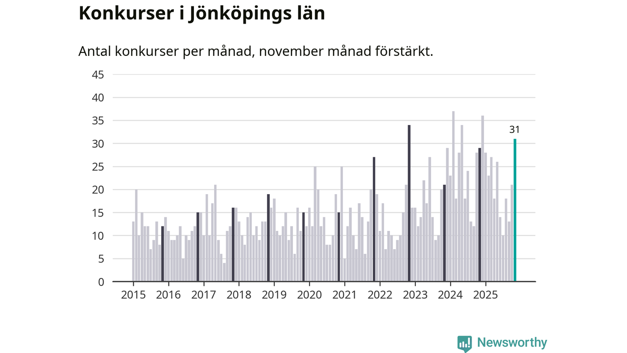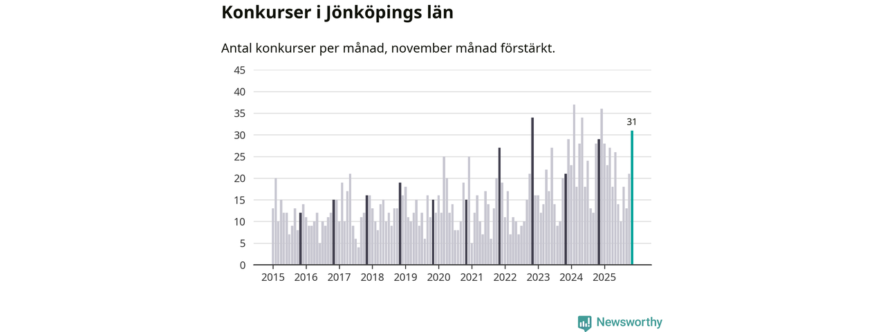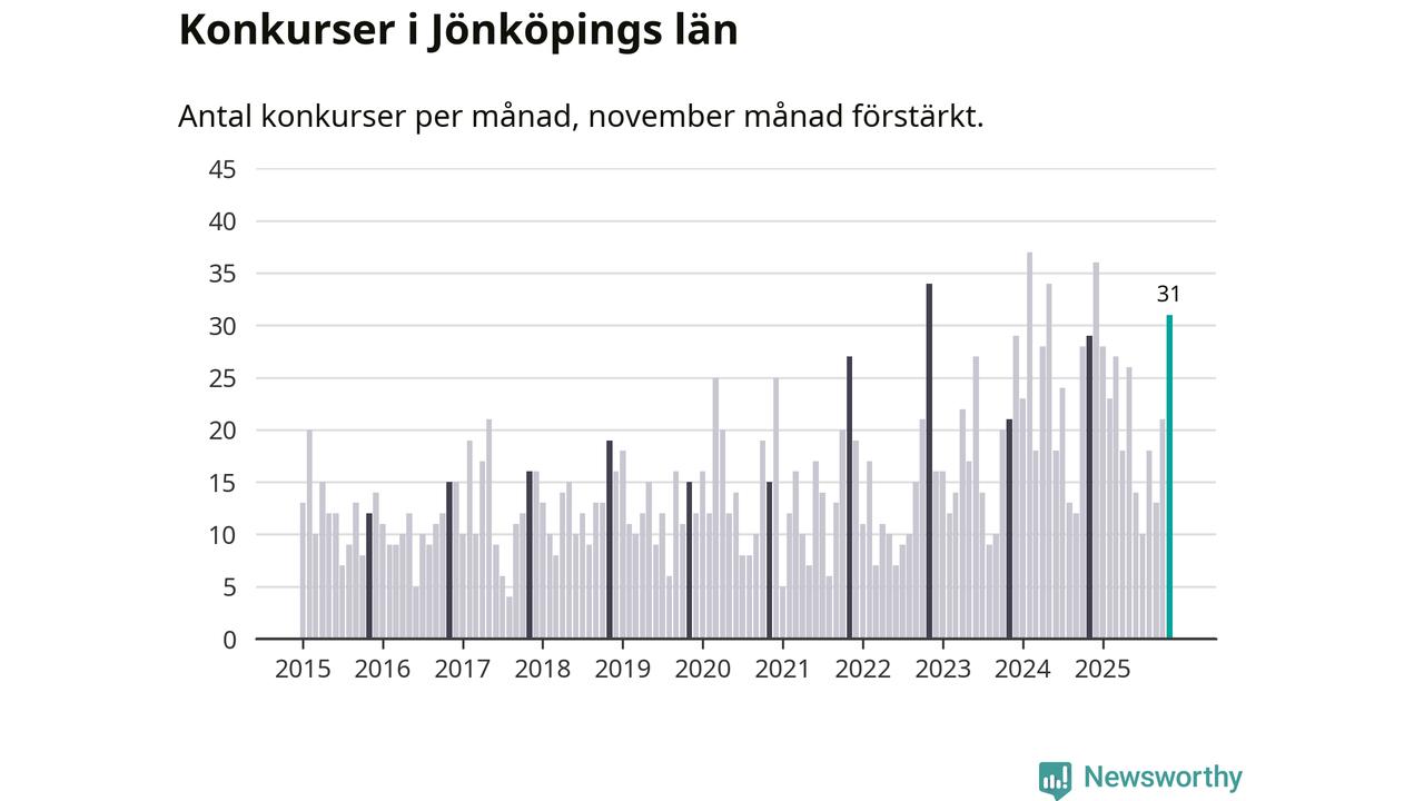 Under november månad gick 31 bolag i konkurs i Jönköpings län. Det är fler än normalt för den här tiden på året sett till de senaste tio åren. I fjol noterades 29 konkurser under november.
