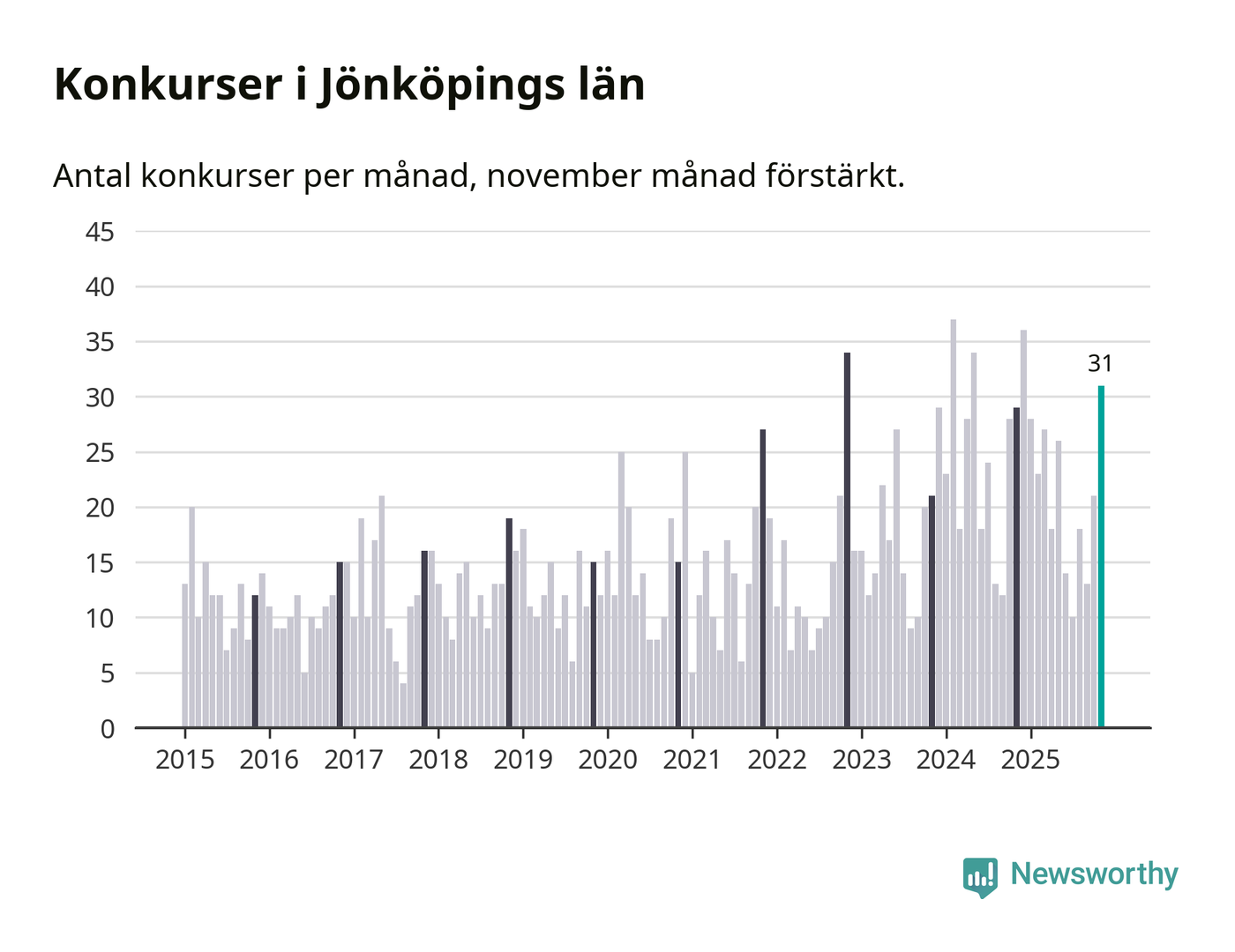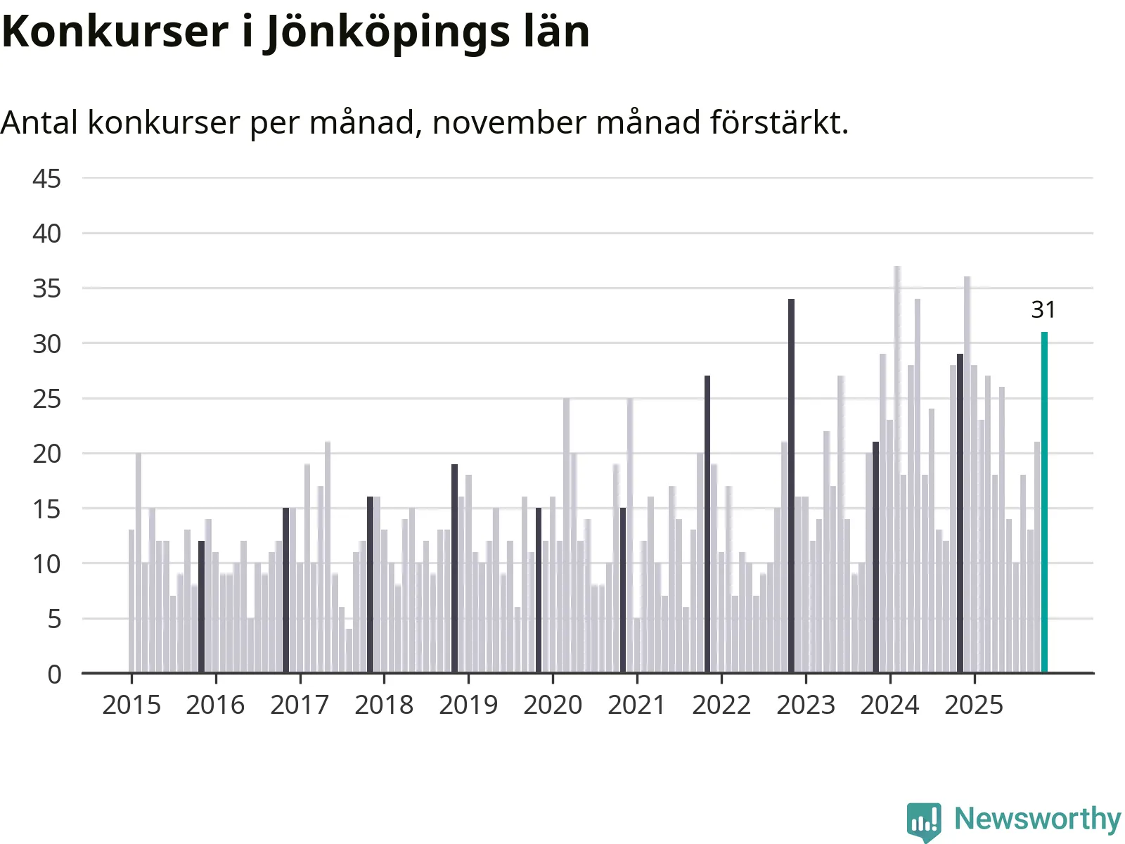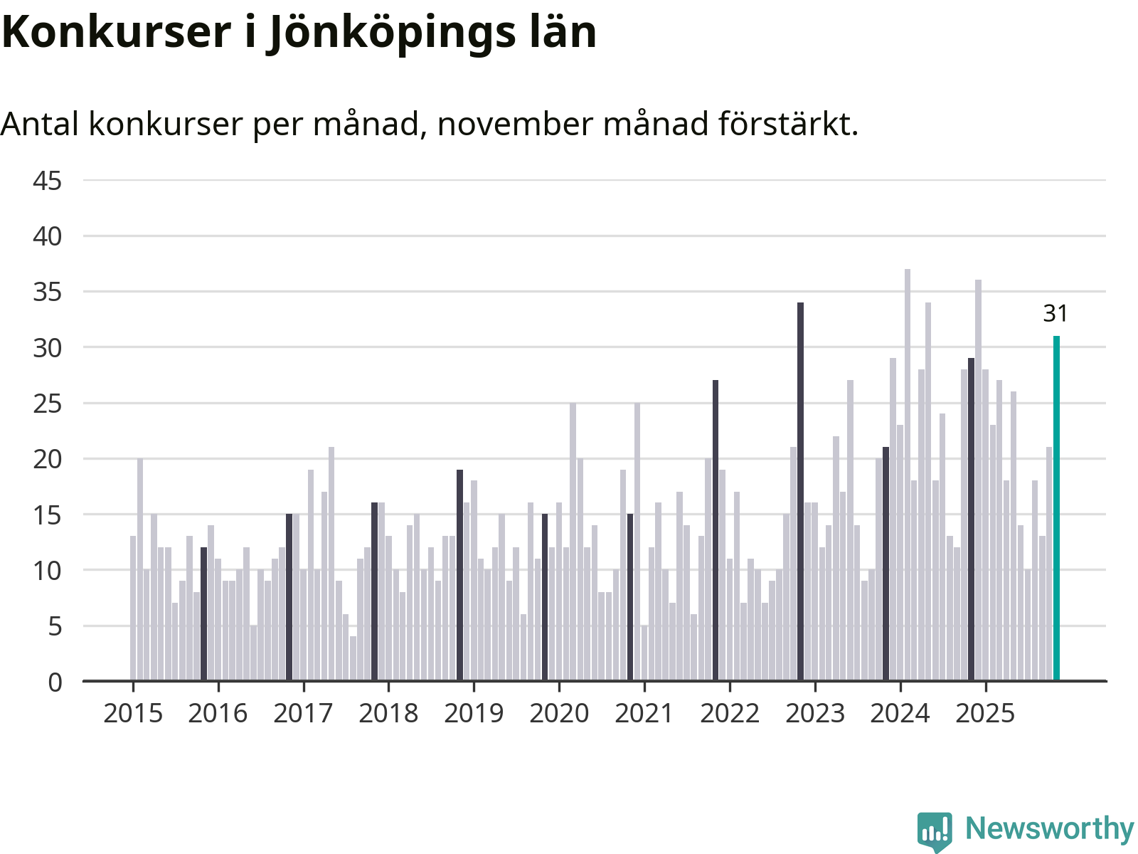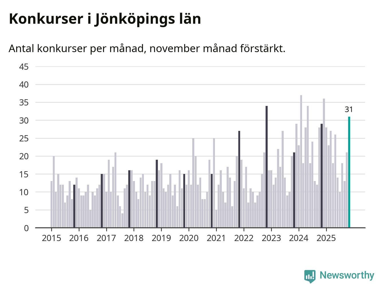 Under november månad gick 31 bolag i konkurs i Jönköpings län. Det är fler än normalt för den här tiden på året sett till de senaste tio åren. I fjol noterades 29 konkurser under november.